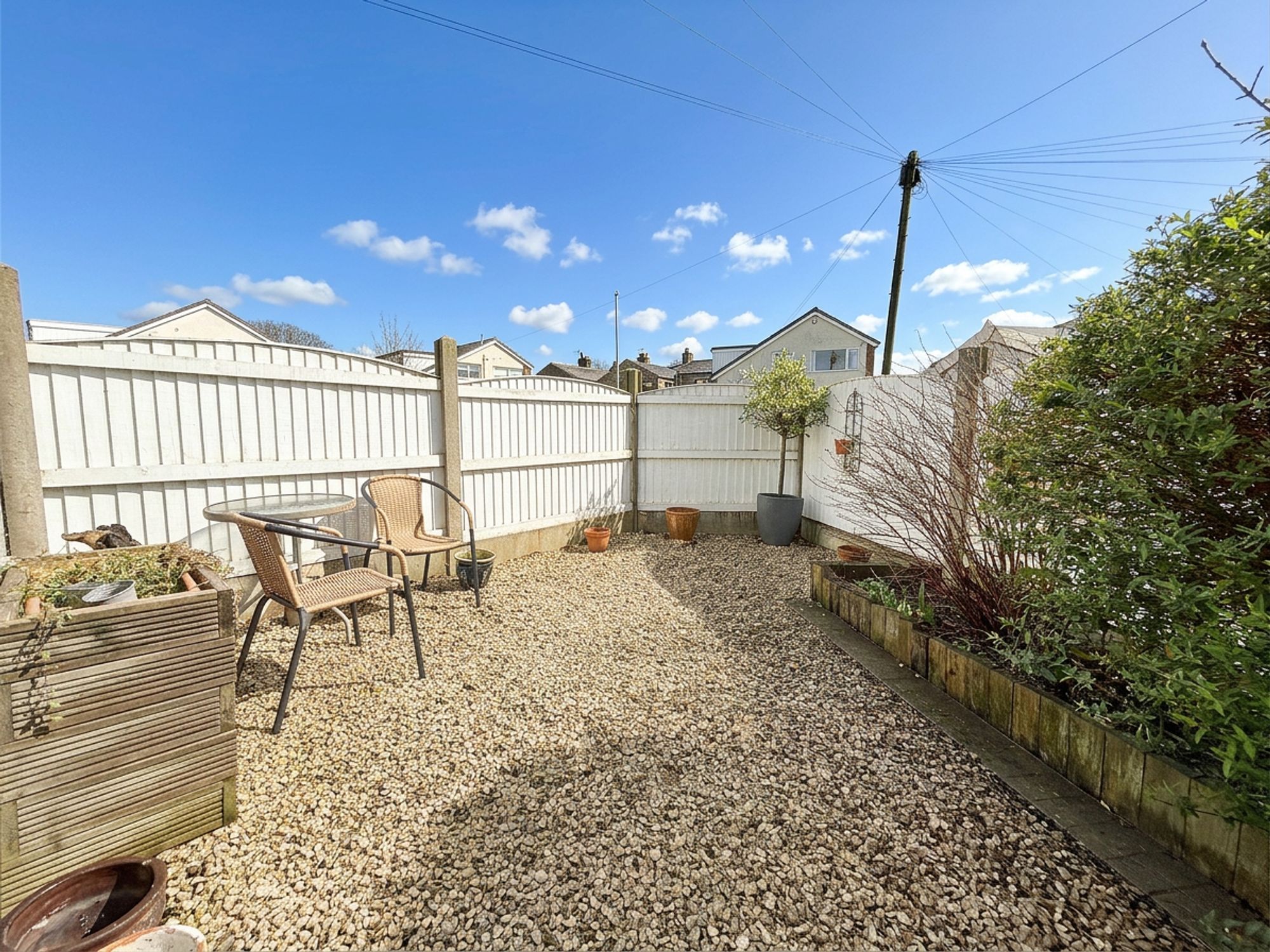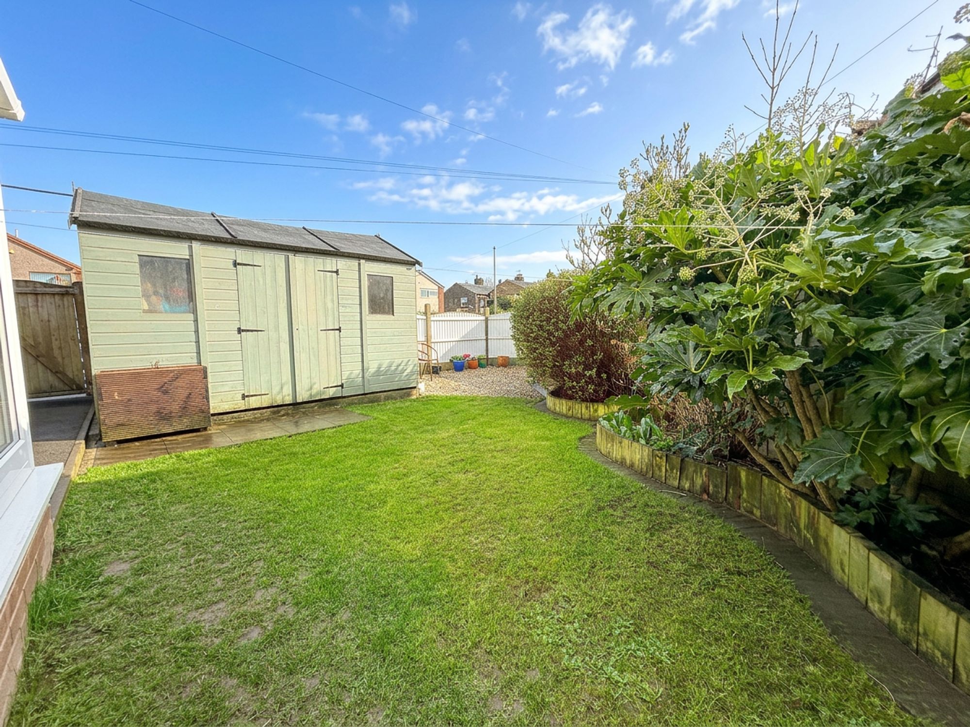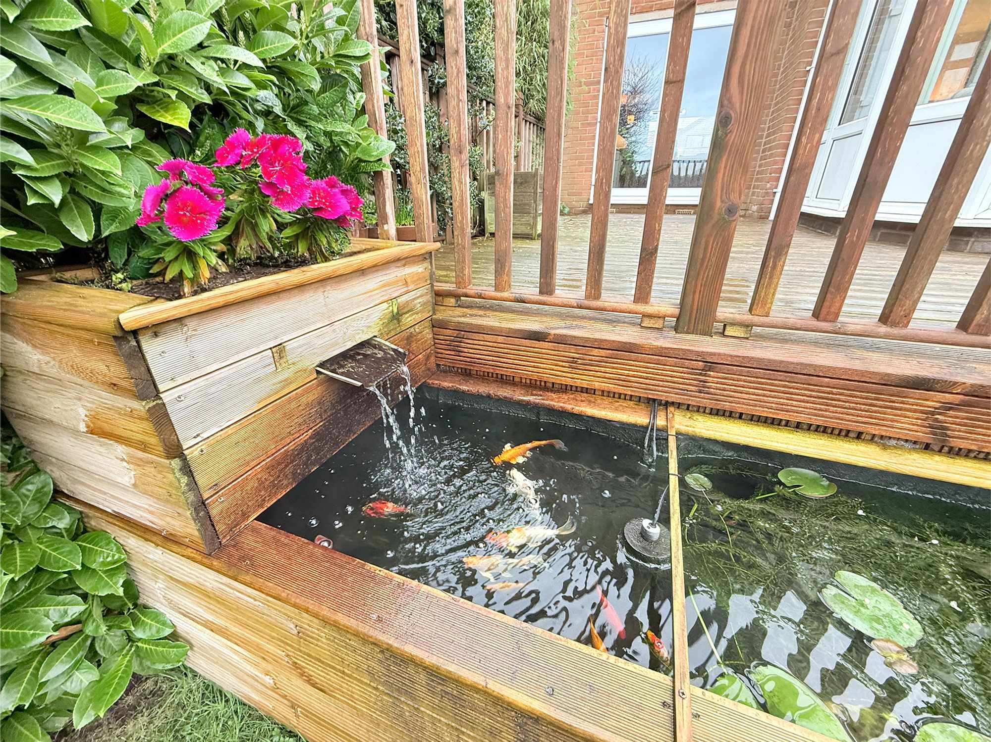 A generous garden wrapping from the side of the property around to the rear. From the driveway there is a stone-flagged patio area with a double shed and pebbled seating area. This leads to a grassed lawn with raised wooden planting beds along the borders. Across the rear of the property is a spacious raised wooden decking area with built-in lighting, providing the ideal space for outdoor seating and enjoying the far-reaching views. The decking leads to an additional lawn with mature planted borders and a raised wooden koi pond complete with water feature and integrated flower bed.