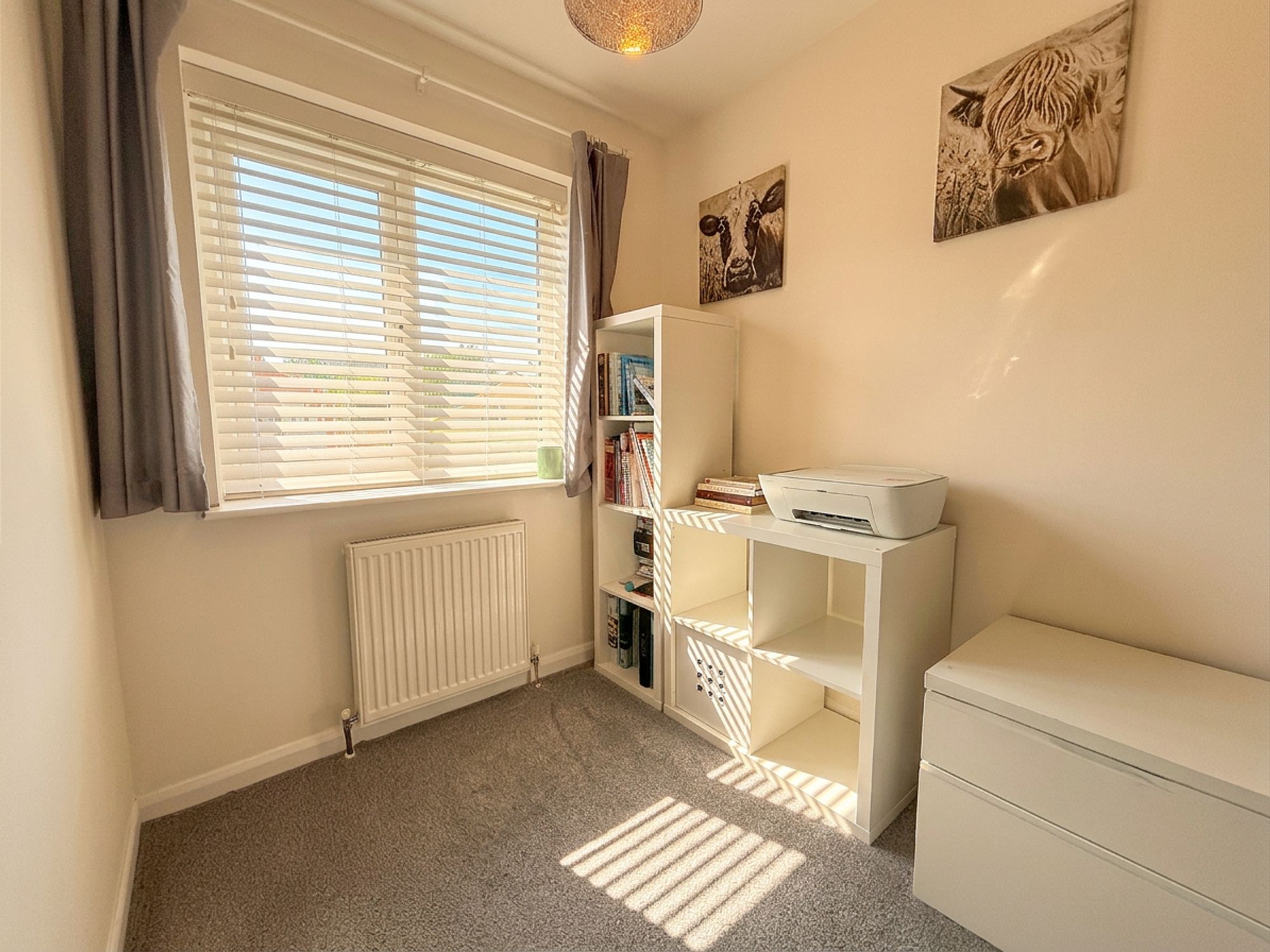 A single bedroom located to the front of the property, neutrally decorated with matching carpeting. The room benefits from built-in storage cupboards over the bulkhead.
