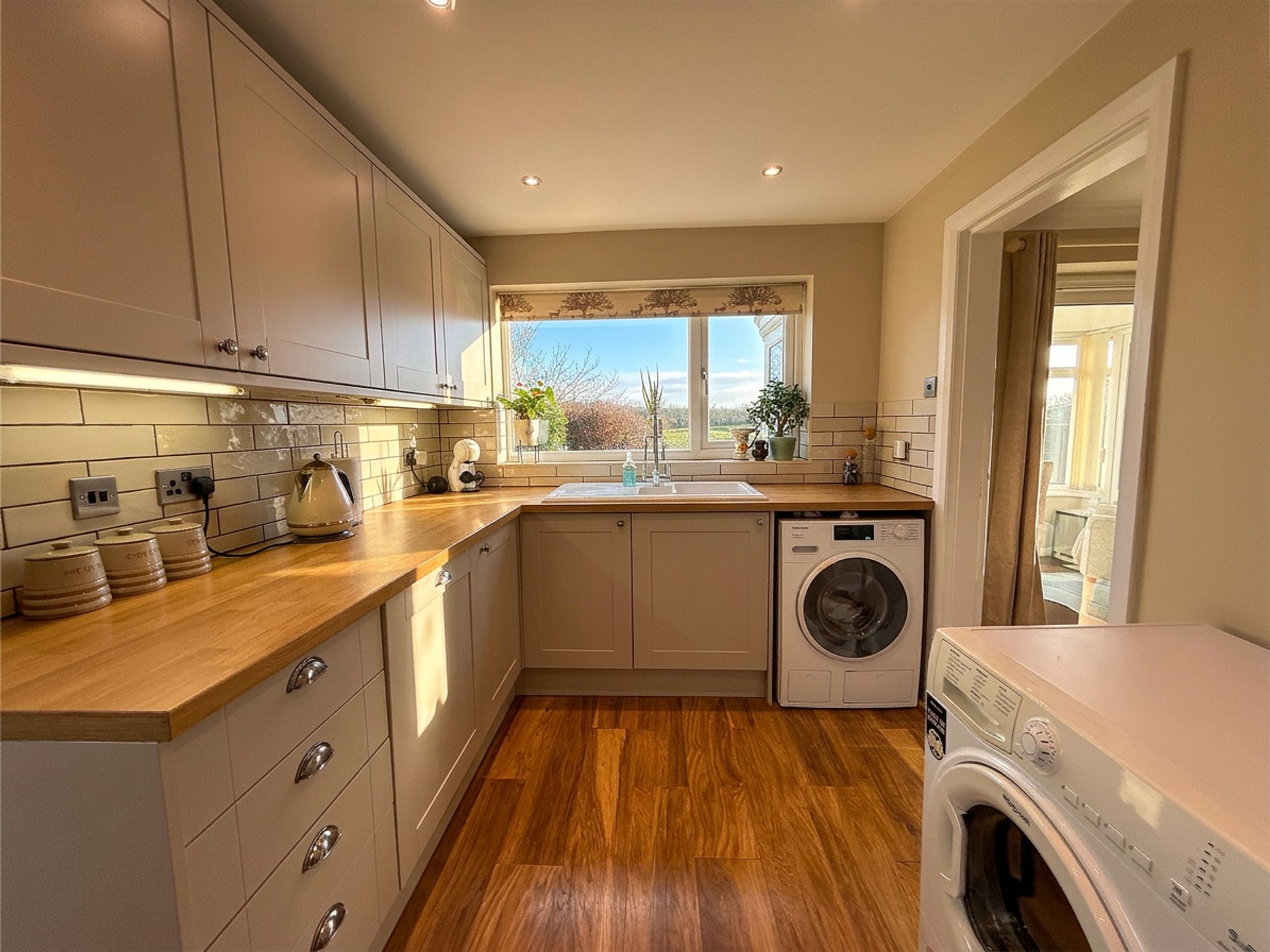 A spacious kitchen which has been extended into the former garage space. Fitted with shaker-style kitchen units with wood-effect worktops and matching wood-effect laminate flooring, complemented by white tiled splashbacks. Integrated appliances include a five-ring gas hob, electric oven, electric grill, microwave and dishwasher. There is also dedicated space for a washing machine and tumble dryer. A white sink with chrome mixer tap overlooks the garden and surrounding fields. The kitchen also features a large pantry cupboard ideal for housing an integrated fridge freezer. Access leads to a side porch which provides additional space for appliances such as a fridge or tumble dryer and an external door to the side of the property. There is also space within the kitchen for a small dining table or breakfast bar.