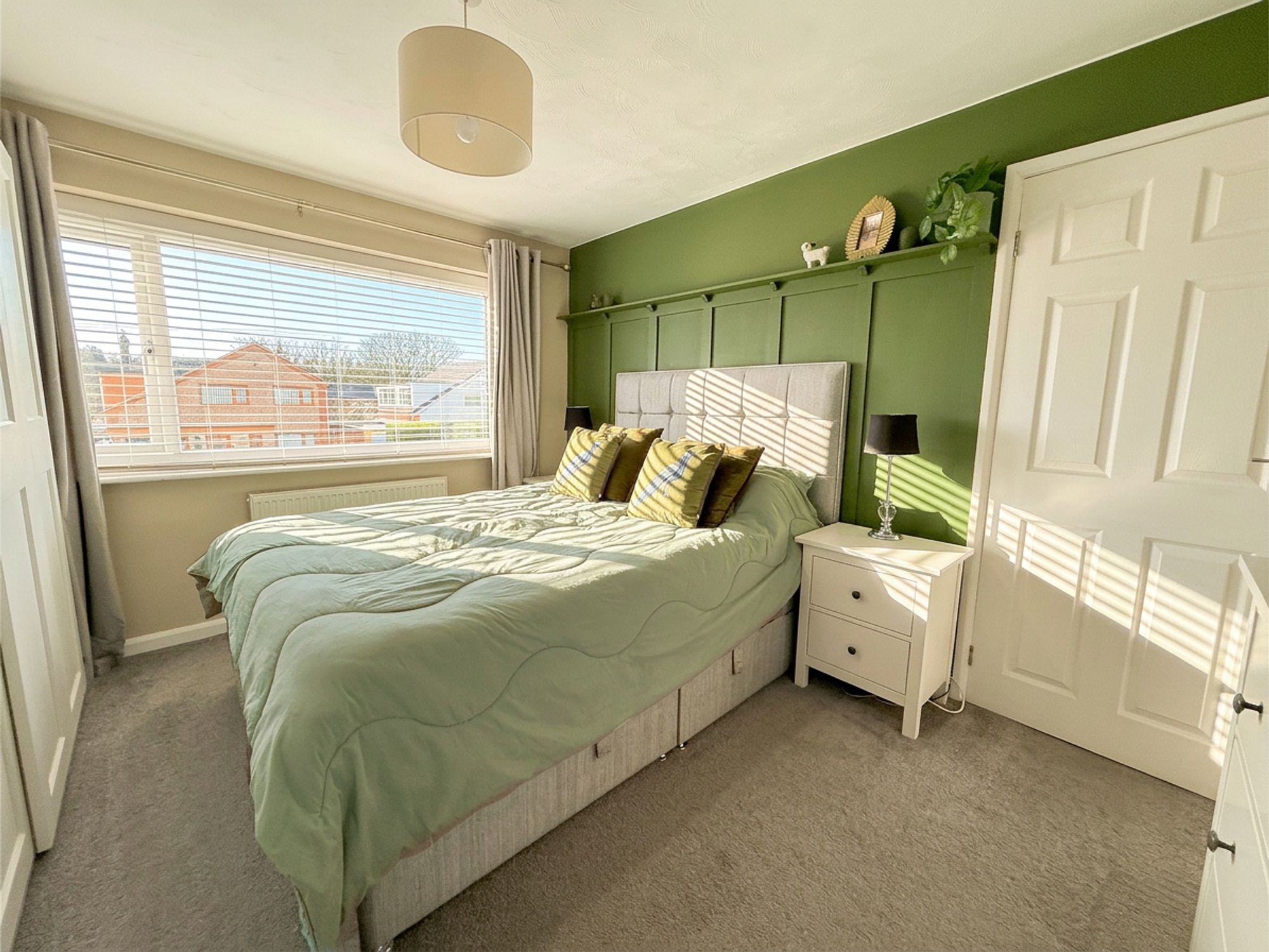 Located to the front of the property, this spacious principal bedroom is neutrally decorated with matching carpeting and features a panelled accent wall with built-in shelving. There is ample space for a king-sized bed and additional freestanding furniture. A full wall of sliding-door wardrobes is currently installed and available by separate negotiation.