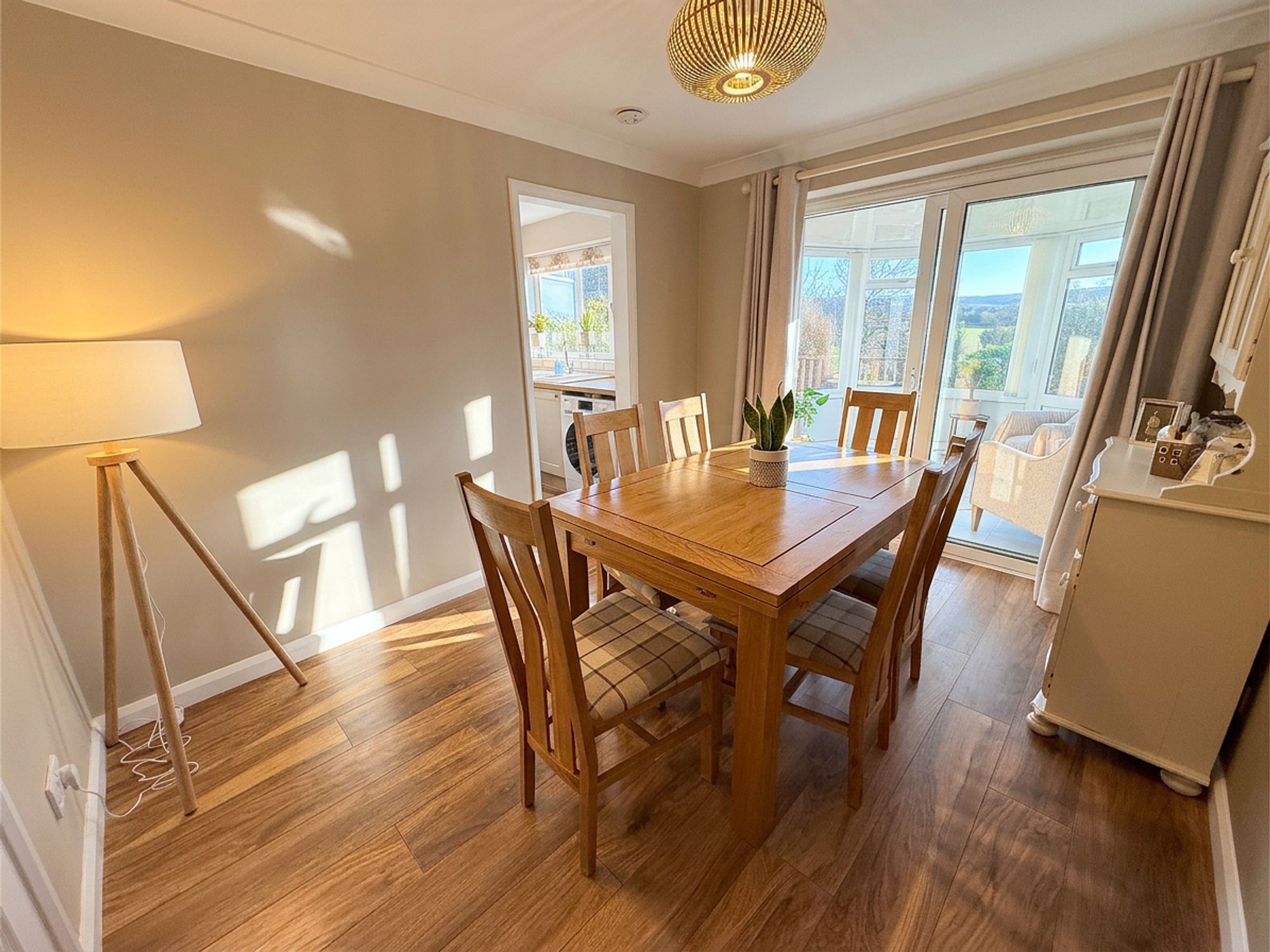 A spacious dining room, neutrally decorated with wood-effect flooring and ample space for a full family dining suite. Sliding glass doors provide access to the conservatory and flood the room with natural light. The dining room also provides direct access to the kitchen.