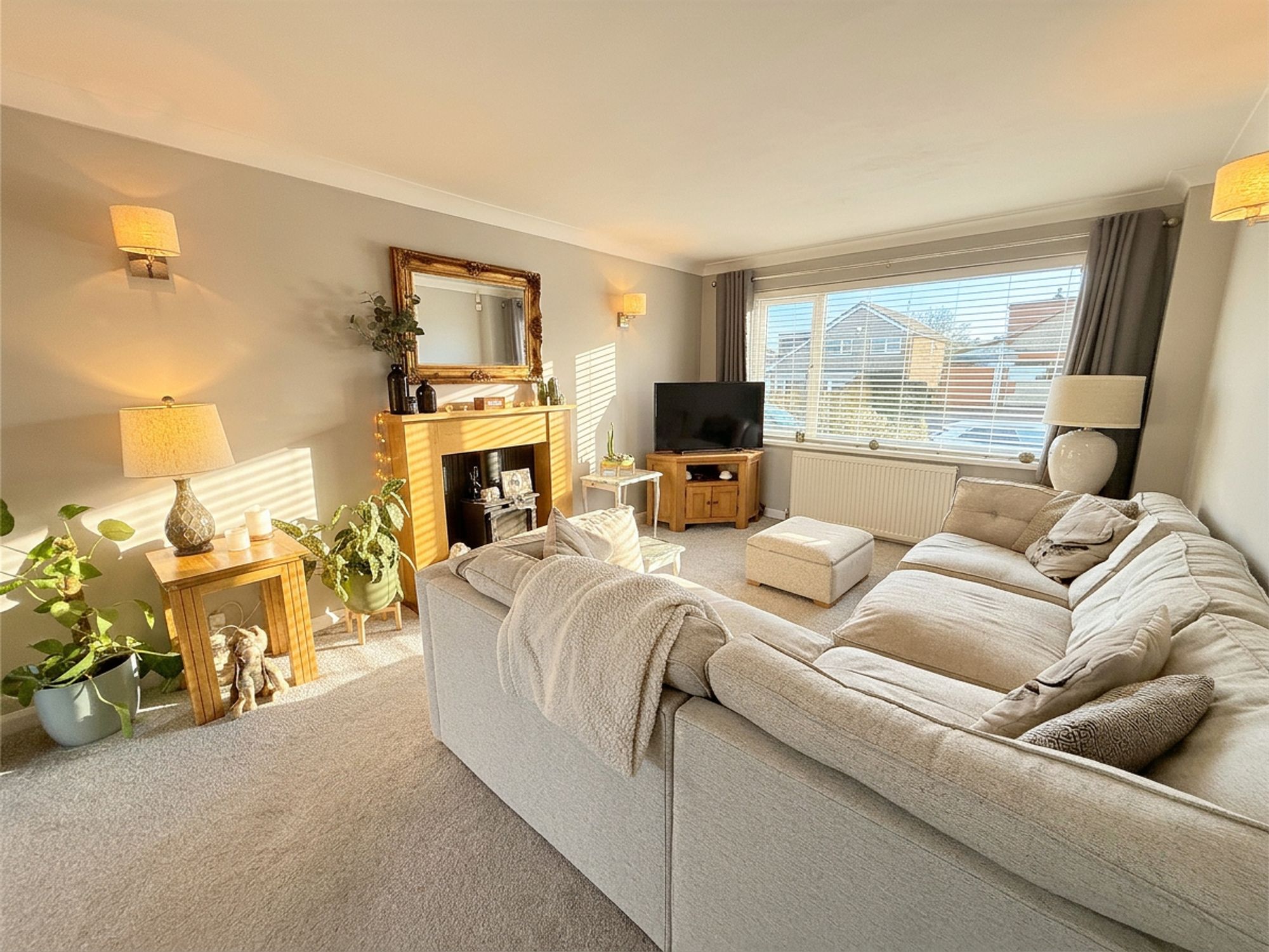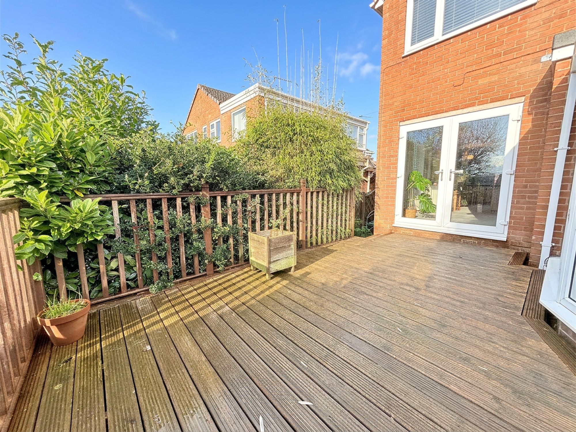 A generous living room spanning the full depth of the property, offering ample space for a variety of family seating arrangements. Neutrally decorated with fitted carpeting, the room is filled with natural light thanks to dual aspect windows and benefits from French doors leading directly onto the rear wooden decking, ideal for indoor-outdoor living during the warmer months. The room features a wooden mantel with tiled hearth and wood-effect electric fire.