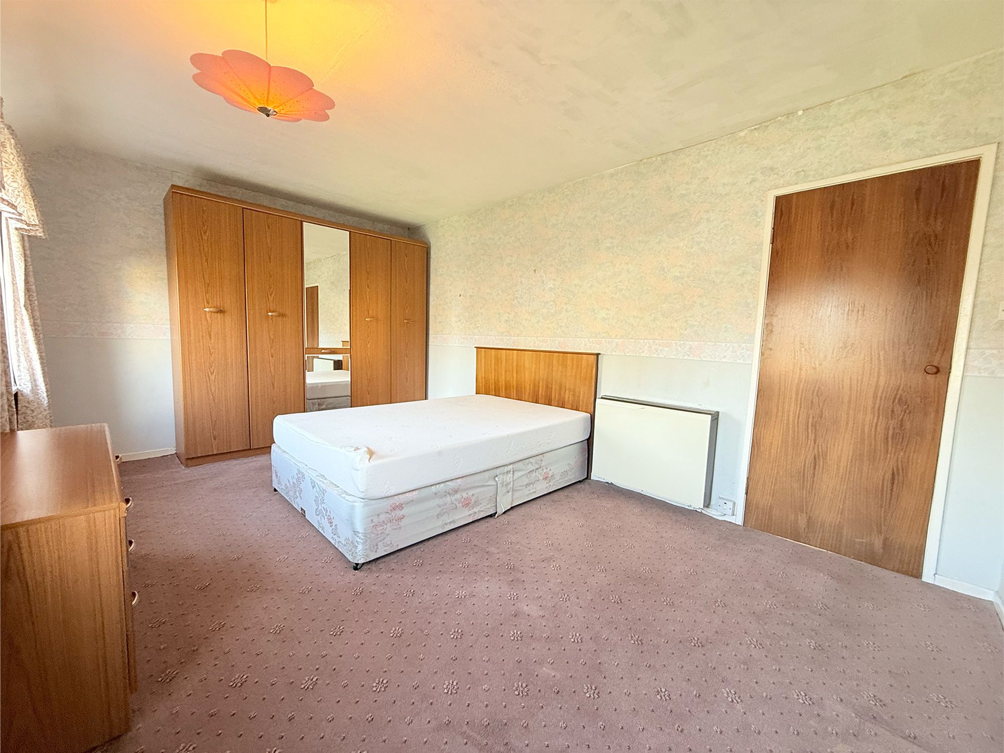 Situated at the rear, this well-proportioned double bedroom enjoys views over the garden. It offers ample space for a double bed and furniture, along with built-in floor-to-ceiling storage housing the Emerson heater.