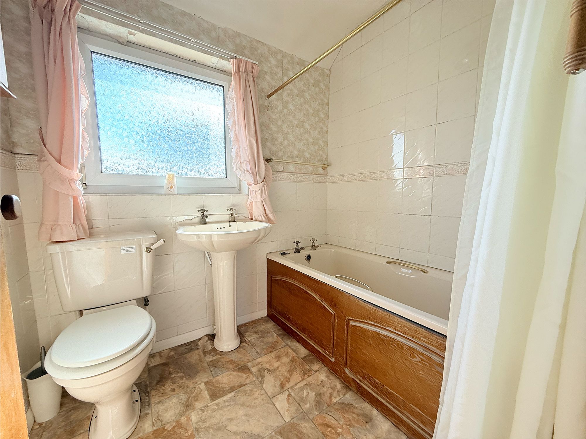 The bathroom is fitted with a full-sized bath with chrome mixer tap, pedestal sink with chrome mixer tap, and WC. The space is finished with tiled walls and linoleum flooring.