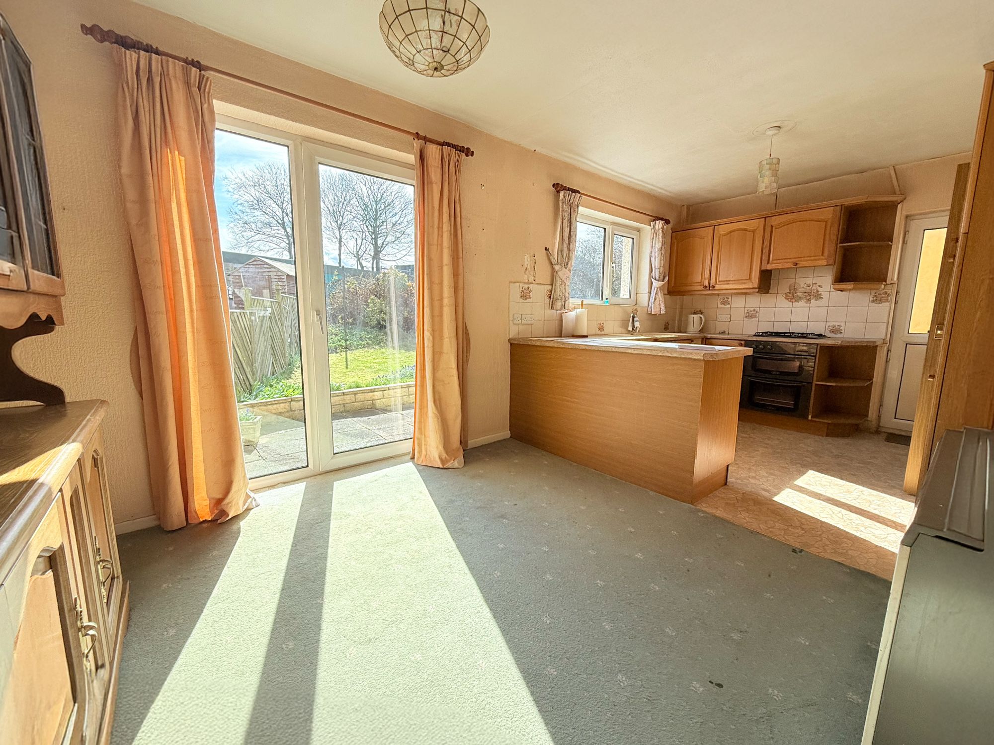 Positioned at the rear of the property, this impressive dining kitchen spans the full width of the home, creating a fantastic space for both everyday living and entertaining. The kitchen is fitted with a gas cooker, four-ring gas hob, and a sink with chrome mixer tap, along with space under the worktop for a washing machine. There is a dedicated area beneath the stairs for a freestanding fridge freezer, as well as a useful breakfast bar and ample worktop space. The dining area comfortably accommodates a full family dining suite and enjoys pleasant views over the rear garden. A glazed door opens directly onto the patio, making it ideal for indoor-outdoor dining, while a further side door adds convenience.