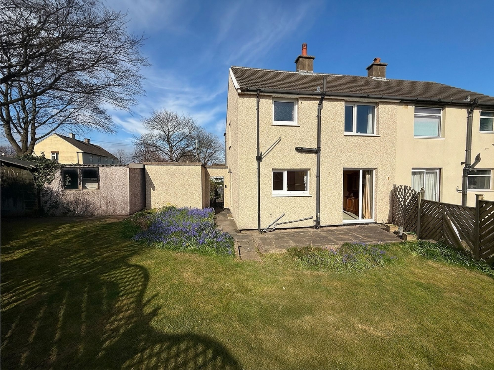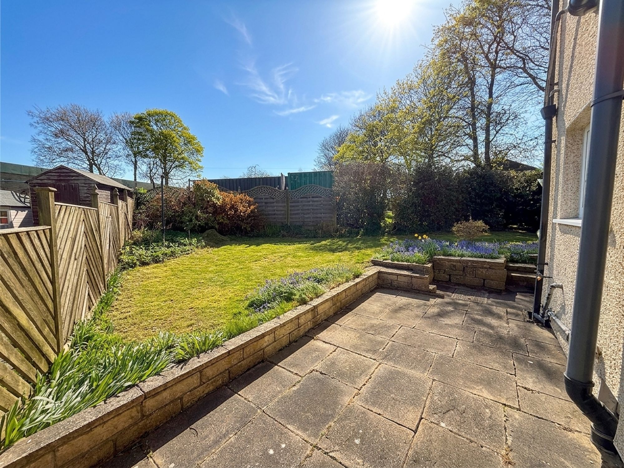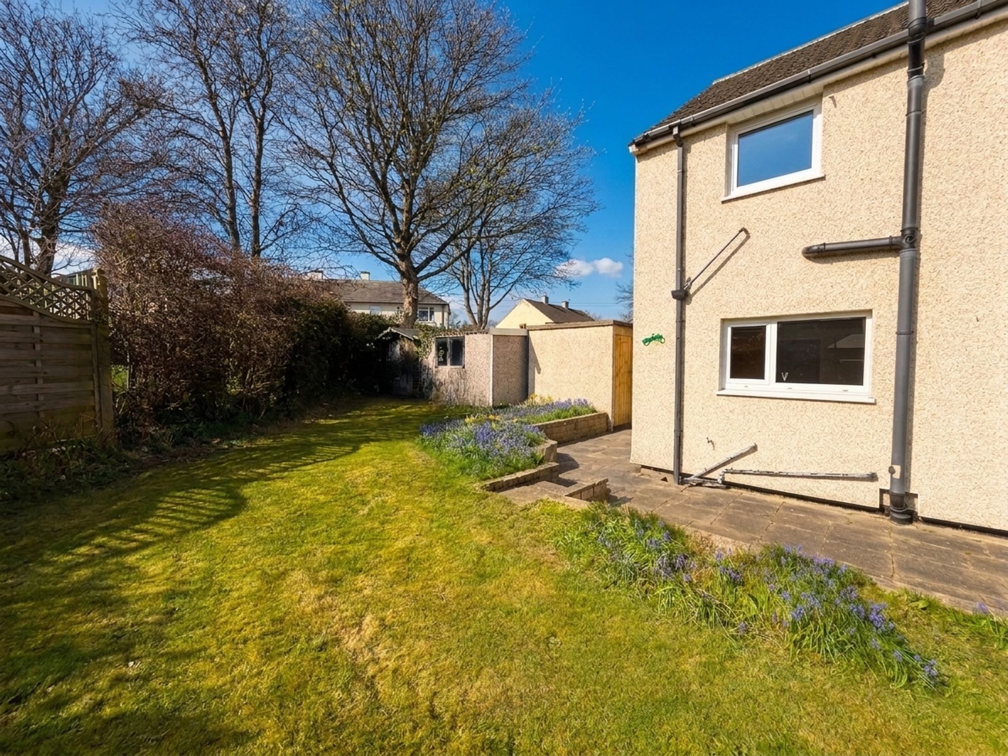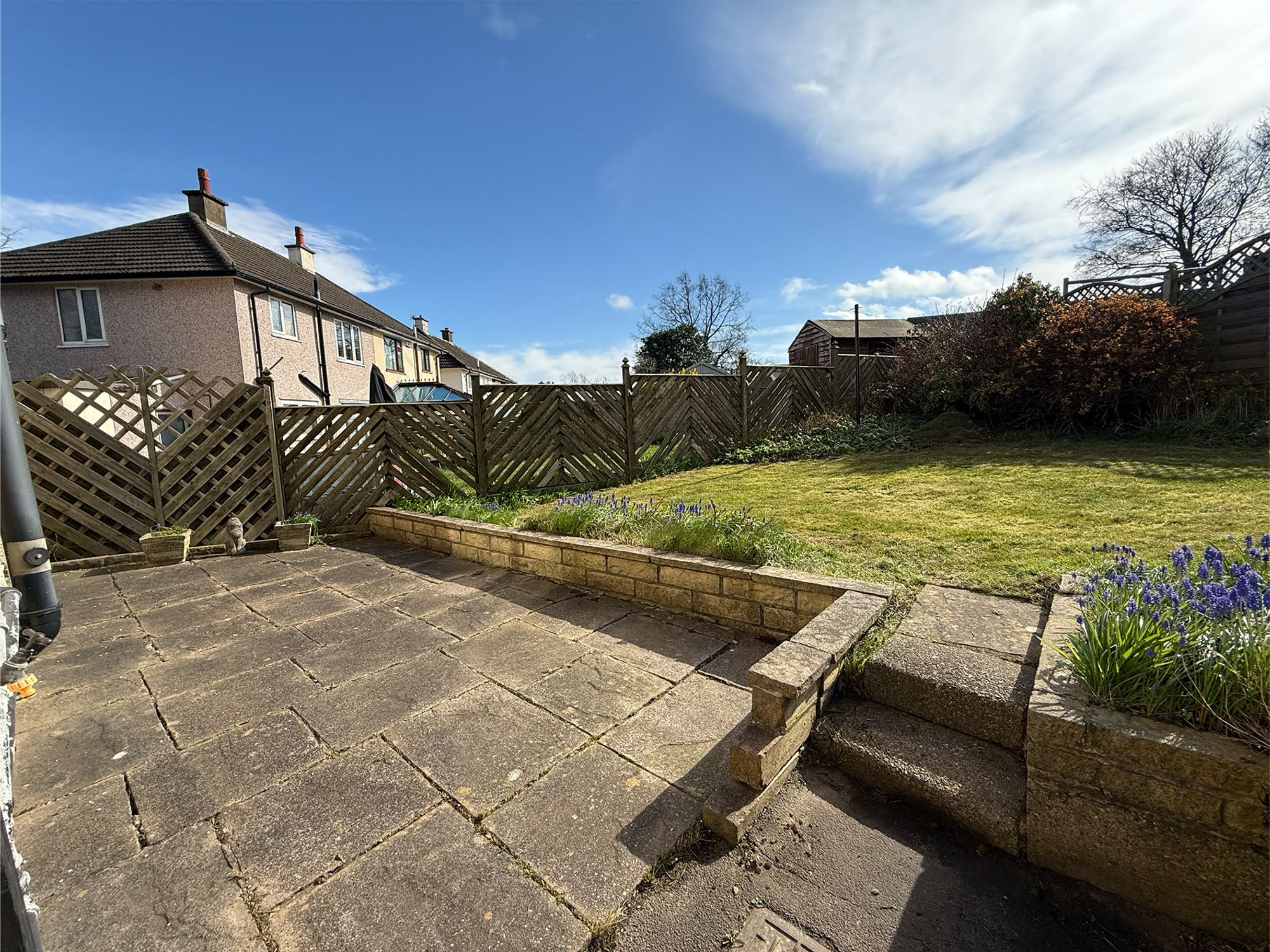 The rear garden is accessed via sliding doors from the kitchen, opening onto a stone-flagged patio area, perfect for outdoor seating. Steps lead up to a raised lawn bordered by mature flower beds, with a further stone pathway leading to a shed. To the side of the property is a useful area for bin storage, along with access to an outhouse fitted with electrics.