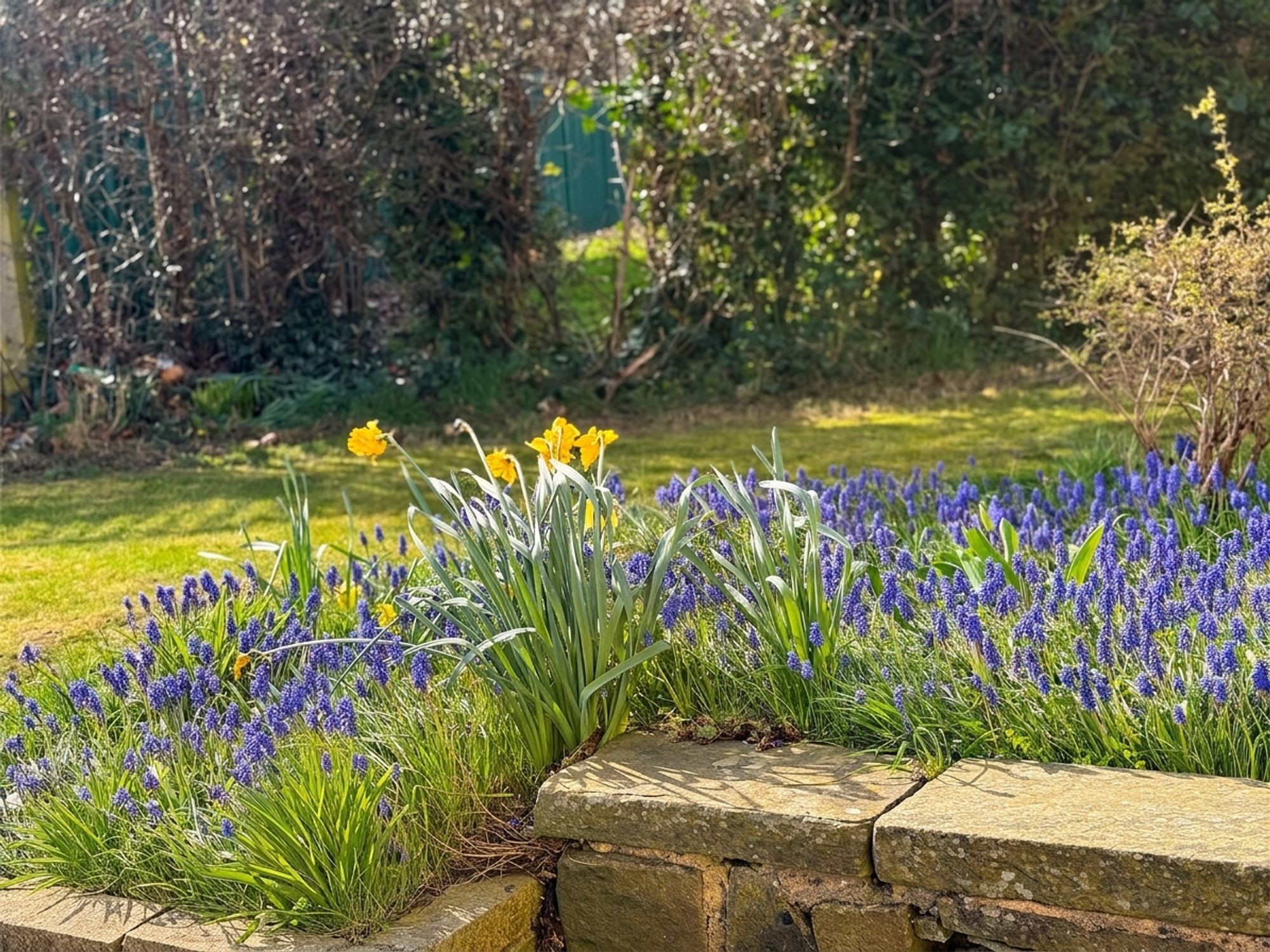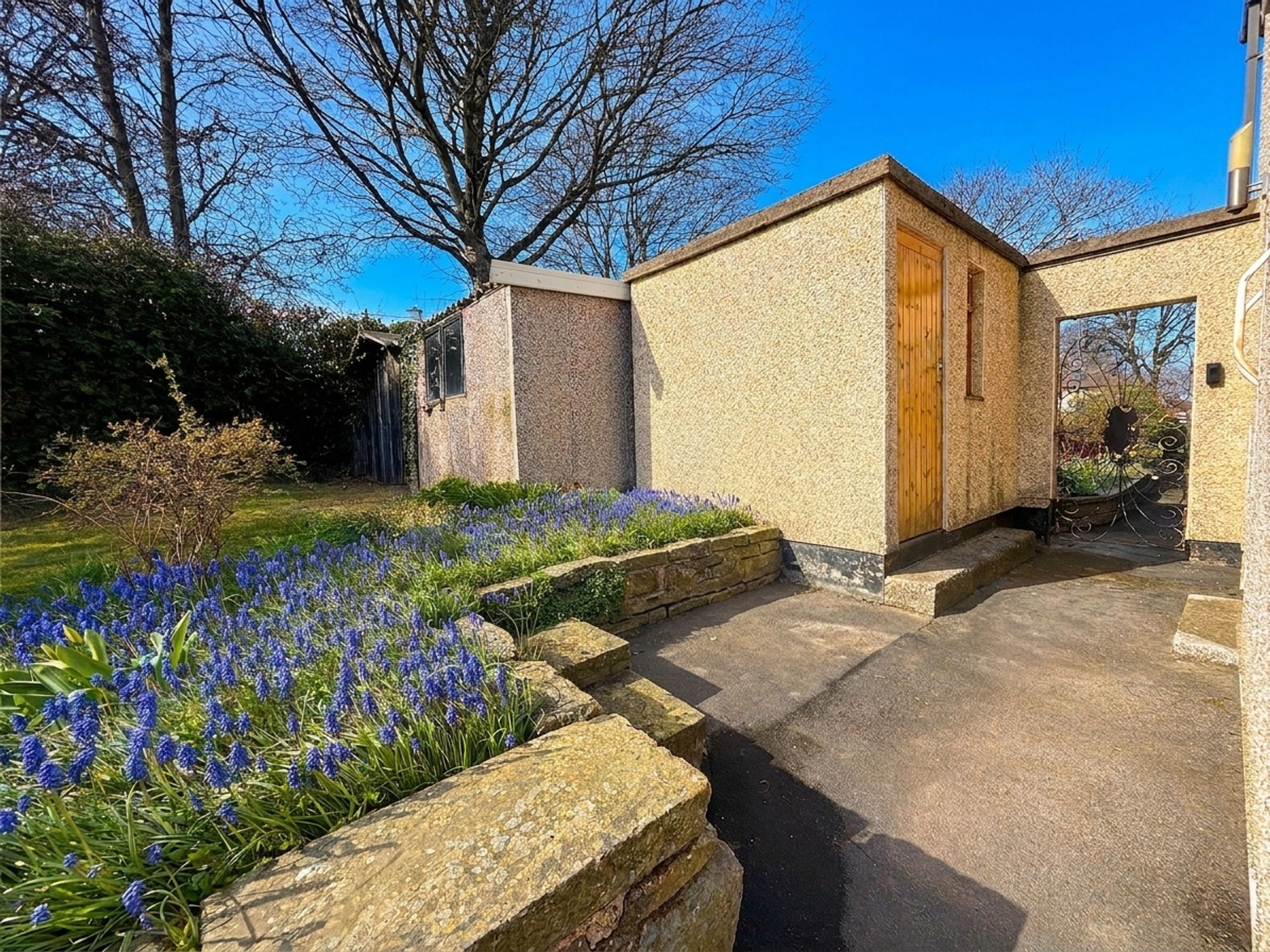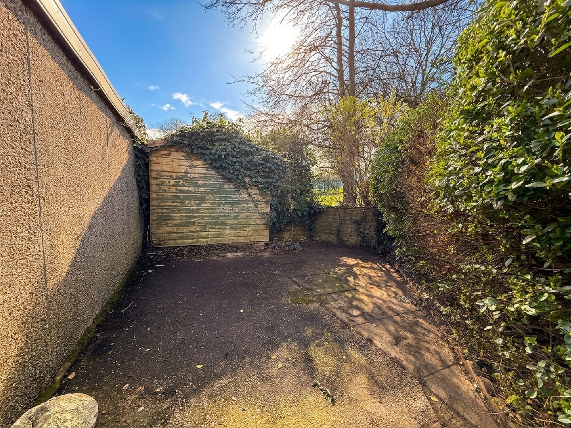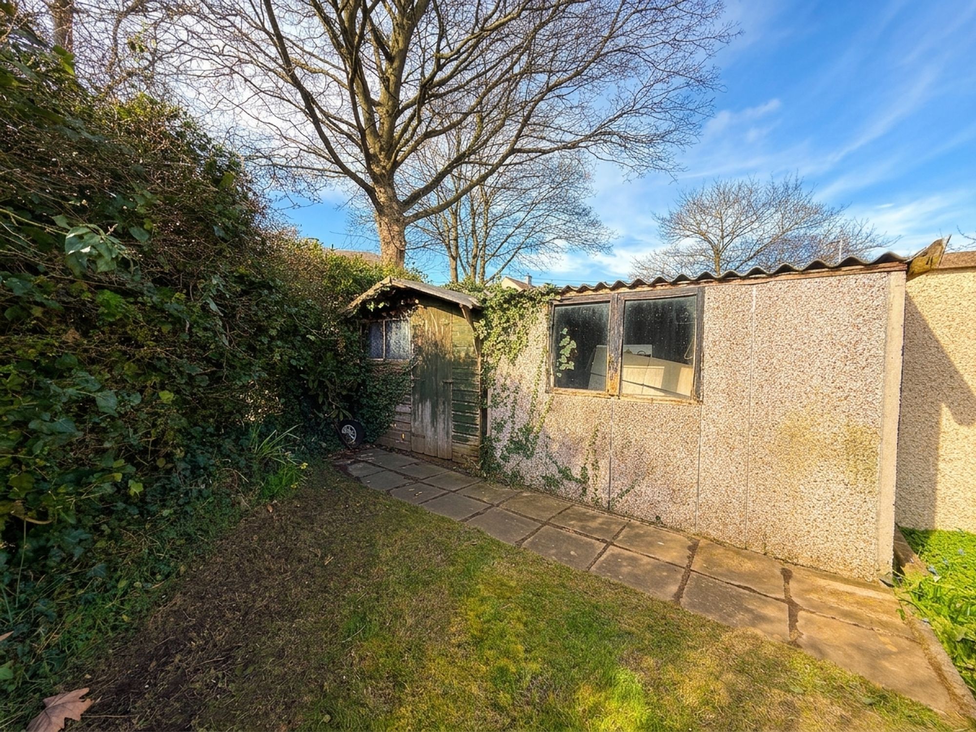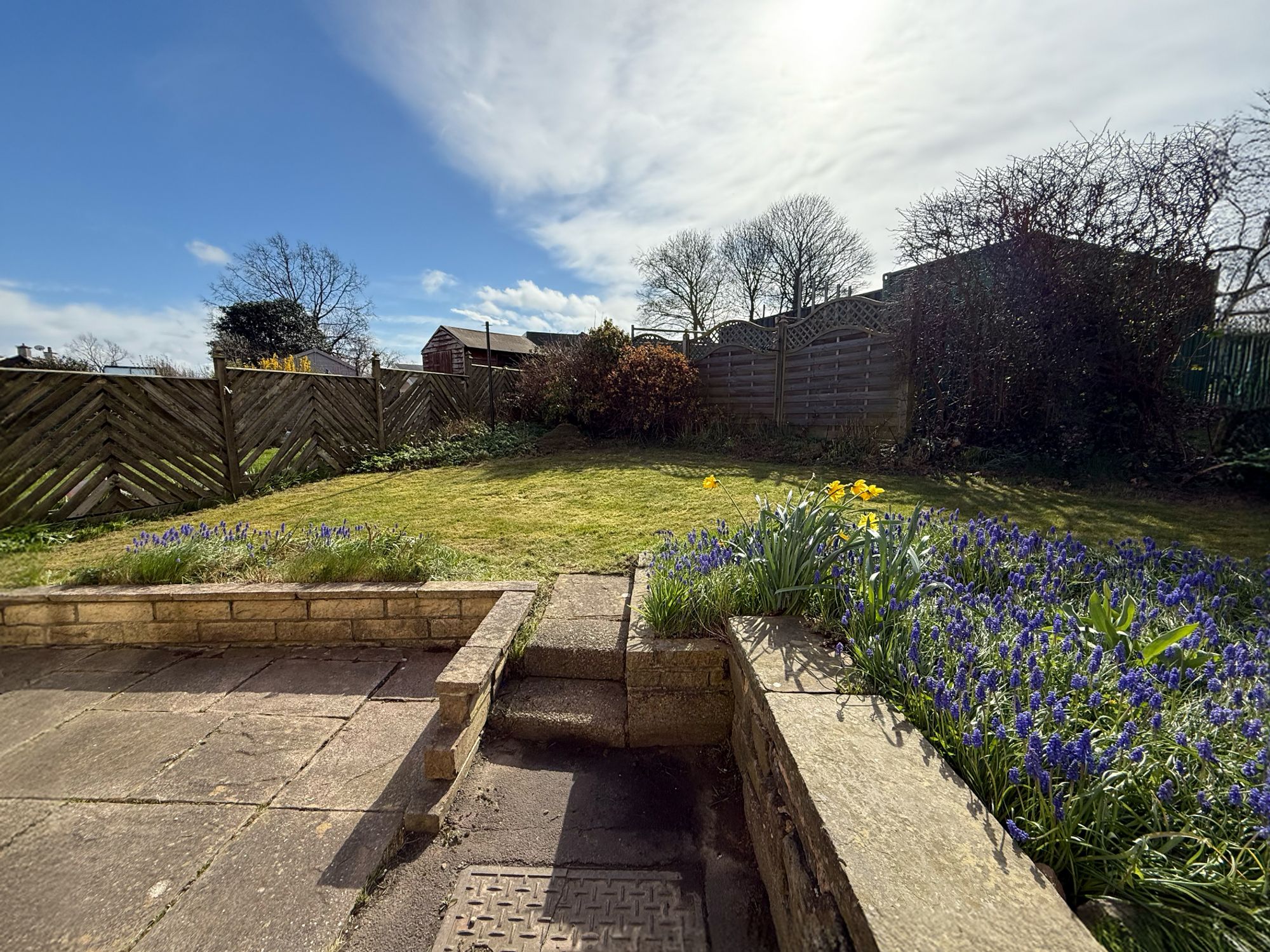 The rear garden is accessed via sliding doors from the kitchen, opening onto a stone-flagged patio area, perfect for outdoor seating. Steps lead up to a raised lawn bordered by mature flower beds, with a further stone pathway leading to a shed. To the side of the property is a useful area for bin storage, along with access to an outhouse fitted with electrics.