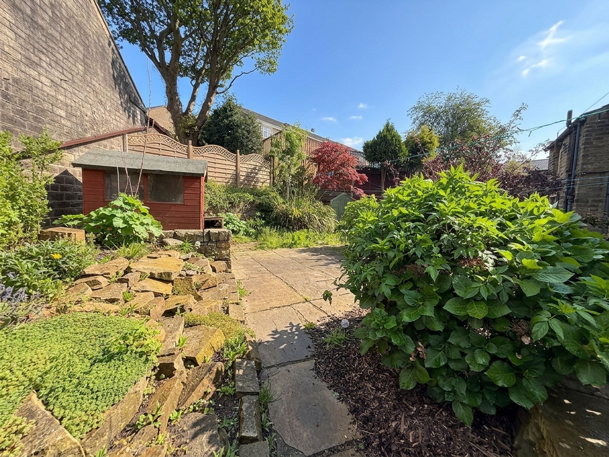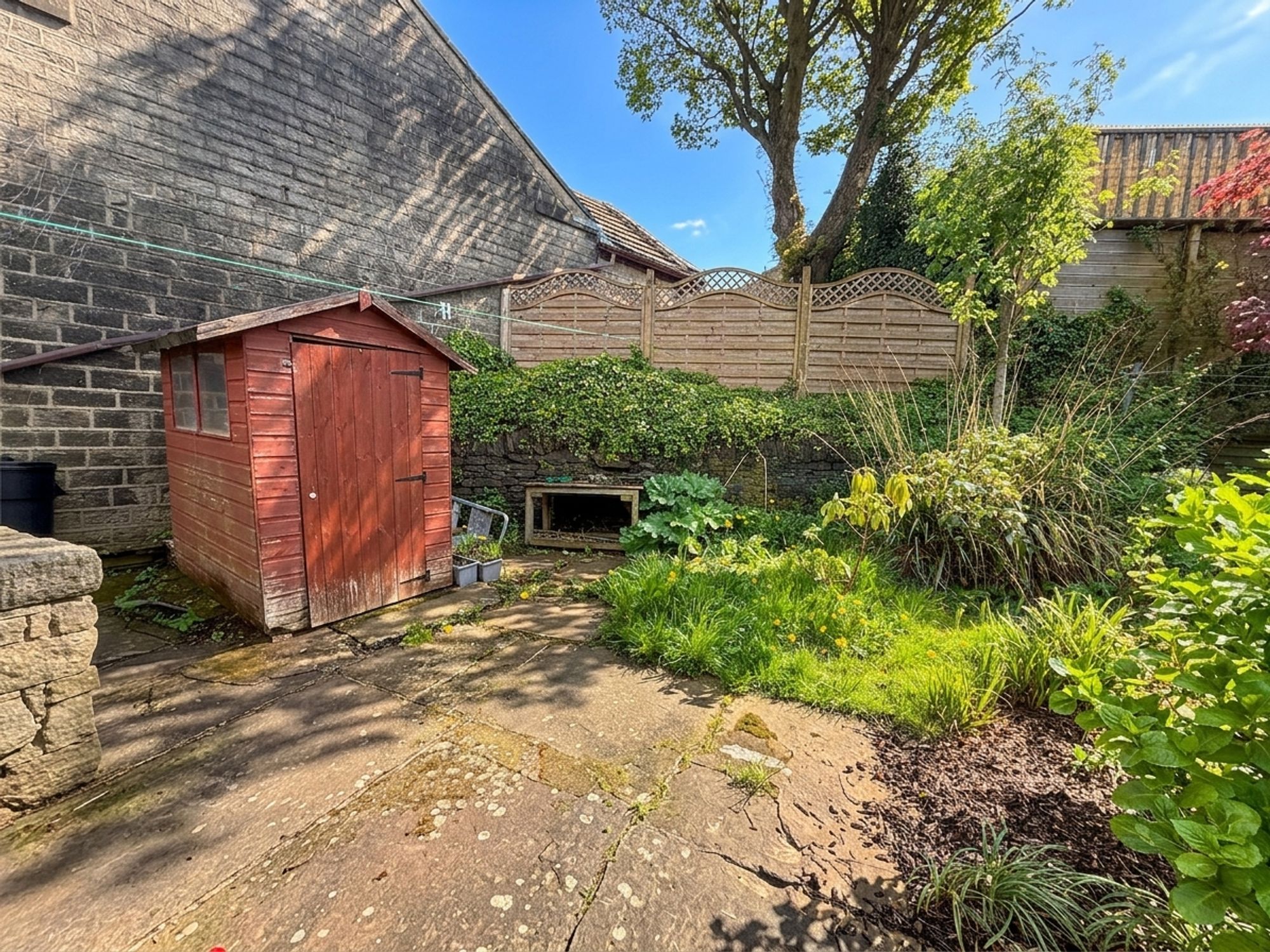 The property benefits from a garden with a stone-flagged patio and planted beds, along with a useful garden shed. There is also a separate external store cupboard located to the roadside, providing additional storage space.