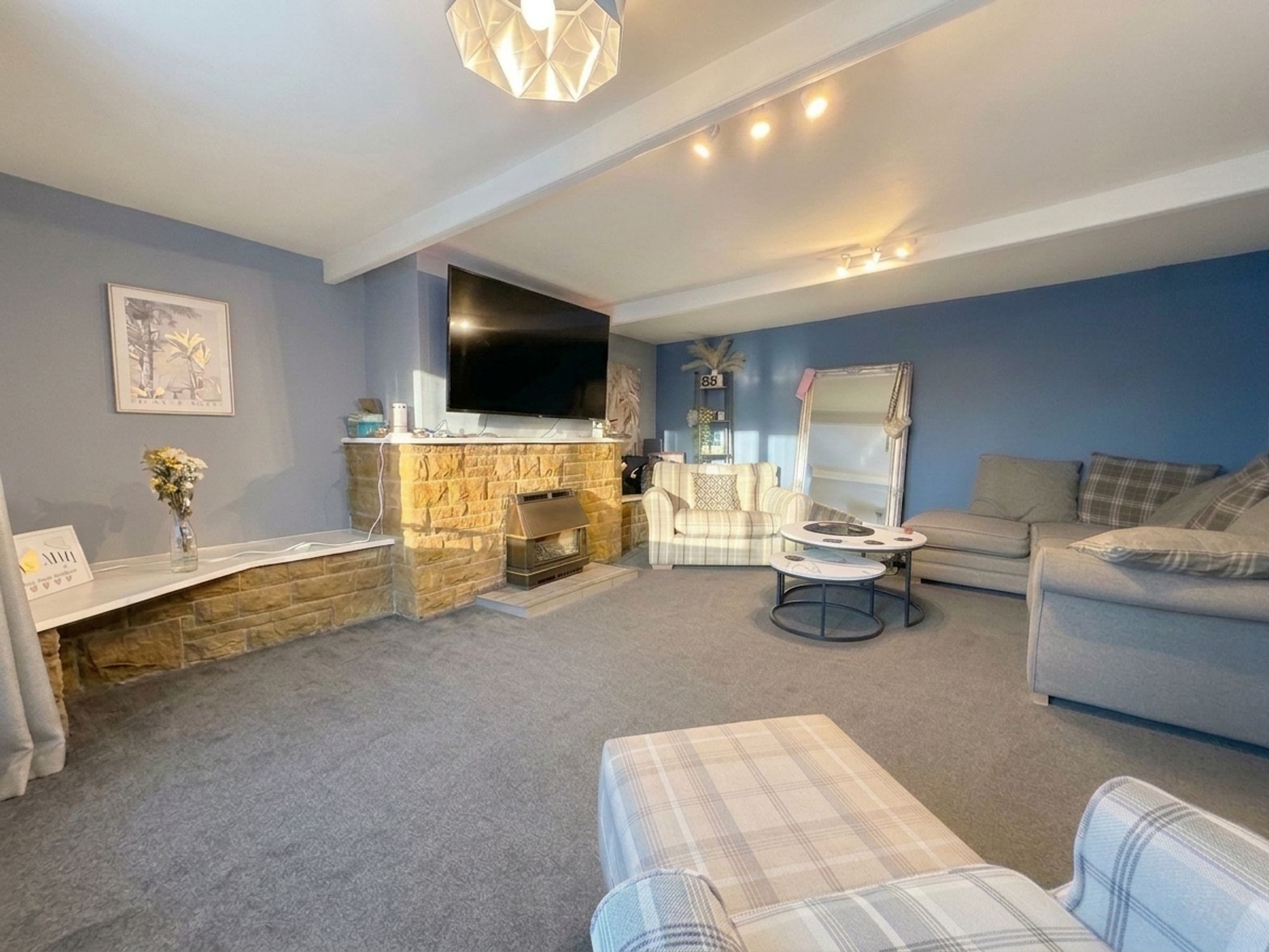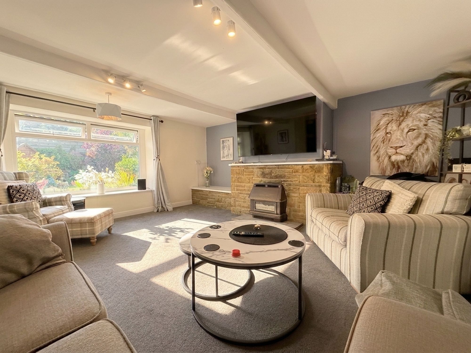 A bright and spacious open-plan living area with a large front-facing window flooding the room with natural light. Neutrally decorated with plush carpeting, the space offers ample room for a variety of seating arrangements and is centred around a coal-effect gas fire, creating a cosy focal point.