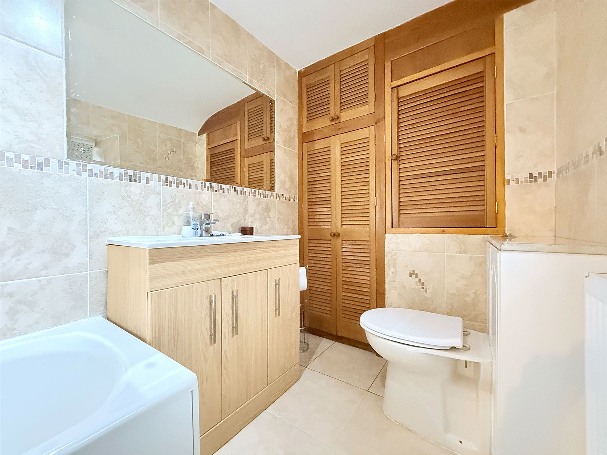 A modern family bathroom fitted with a full-size bath with chrome mixer tap and separate electric shower with handheld attachment. There is also a contemporary vanity unit with sink, WC, and built-in storage. Finished with neutral tiling to the walls and floors, the room further benefits from electric underfloor heating.