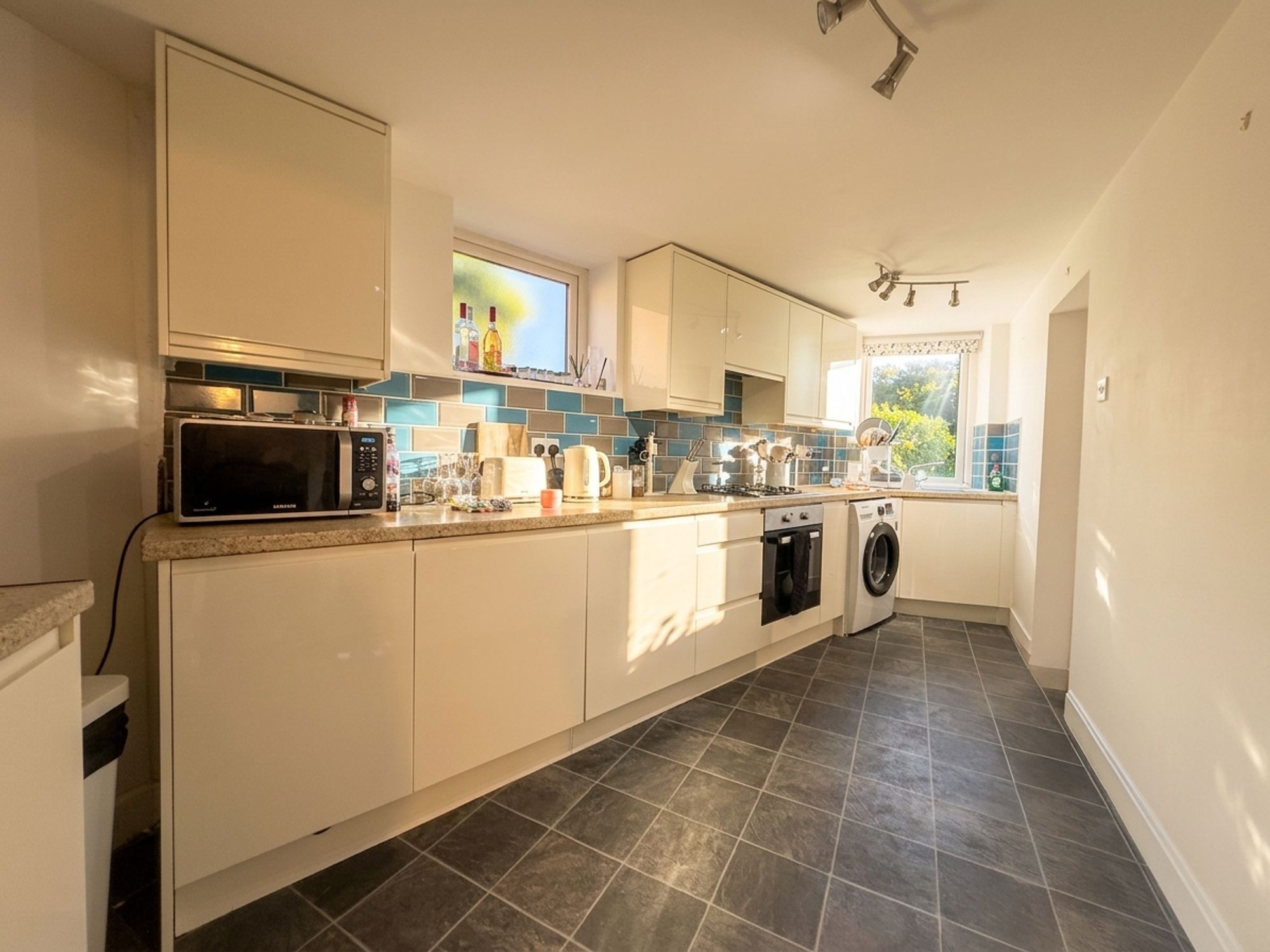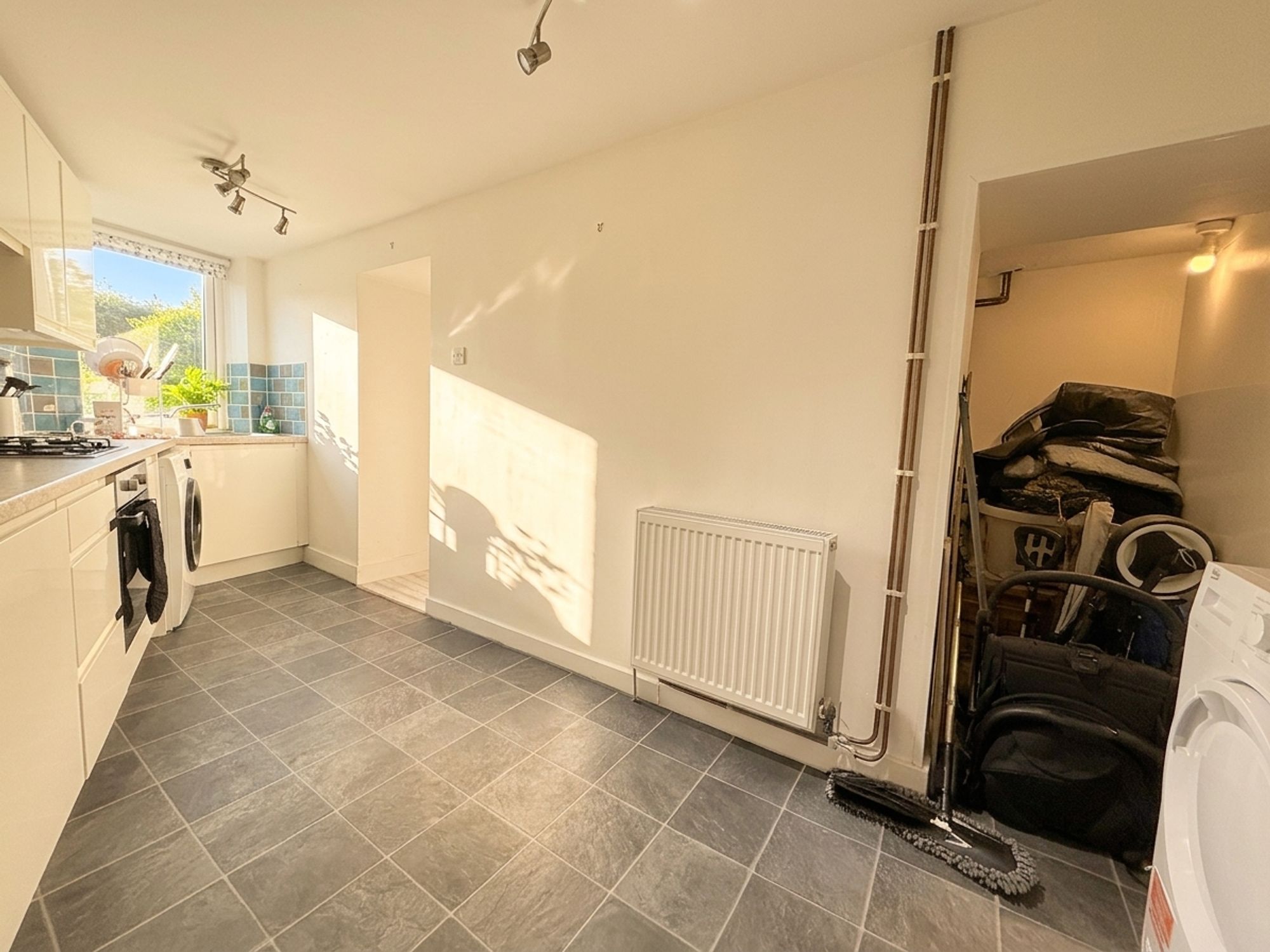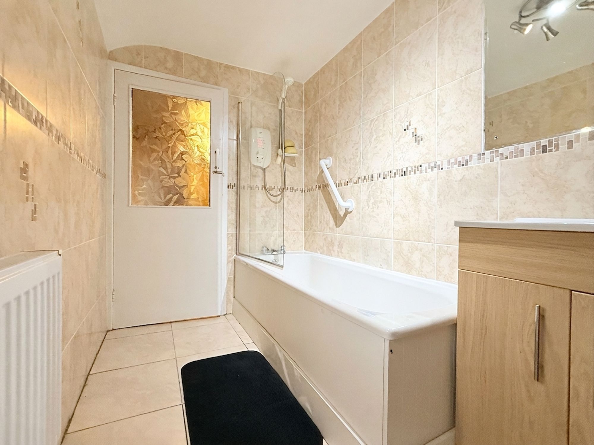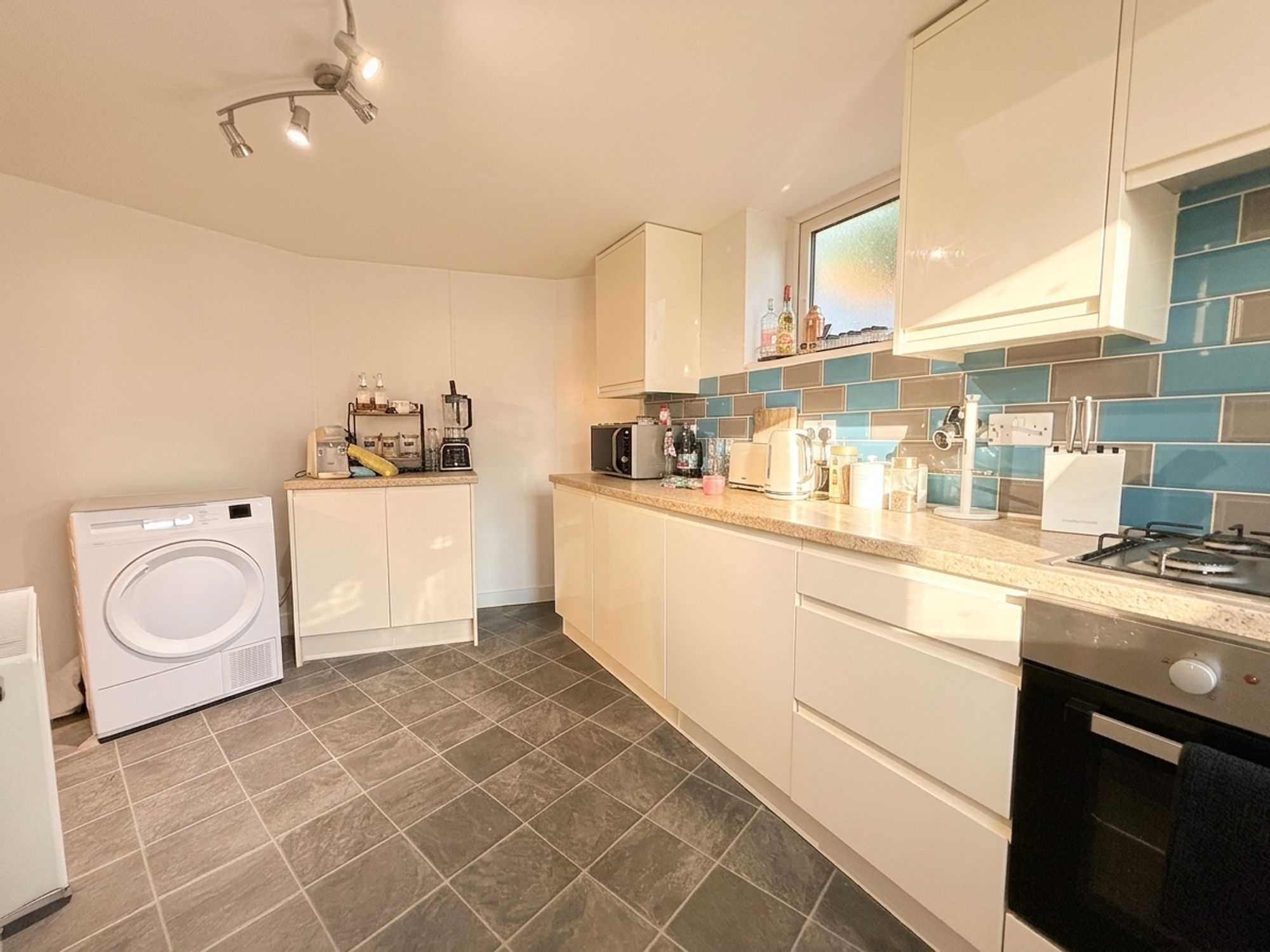 Fitted with cream gloss cabinetry and matching worktops, the kitchen is both stylish and practical. Integrated appliances include a under counter fridge and freezer, electric oven with four-ring gas hob. There is dedicated space for a washing machine, along with useful under-stairs storage ideal for additional appliances or general storage. Finished with tile-effect flooring and complementary tiled splash-backs, the kitchen also offers space for a small dining table.