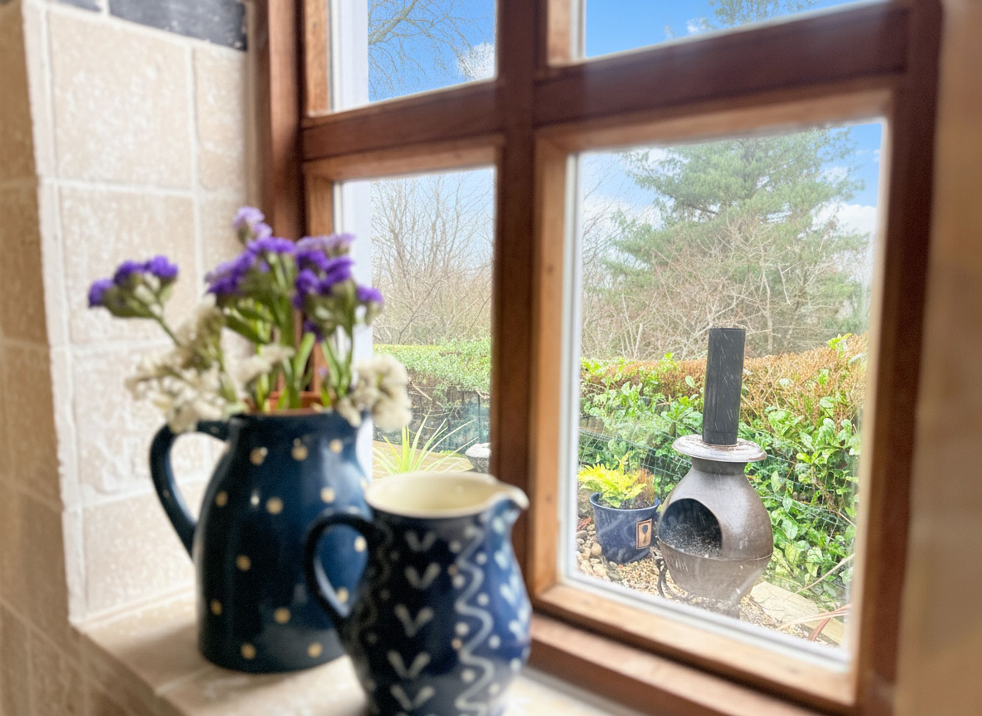 This bright and airy kitchen is fitted with charming Shaker-style units in a striking blue tone, beautifully complemented by patterned tiled worktops and neutral natural stone splash-backs, creating a characterful yet practical space. The kitchen is well equipped with an integrated under-counter fridge, space for a washing machine, a chrome sink with a farmhouse-style mixer tap, built-in wine storage, and a freestanding gas range cooker with a five-ring gas hob. At the centre of the room sits an island with a built-in breakfast bar and additional shelving, ideal for casual dining and extra storage. The room benefits from an external door leading directly onto the rear garden and enjoys plenty of natural light courtesy of dual-aspect windows, offering pleasant garden views and far-reaching outlooks beyond. The boiler is discreetly positioned above the island for ease of maintenance while the kitchen cabinets are enhanced with built-in display spotlights.