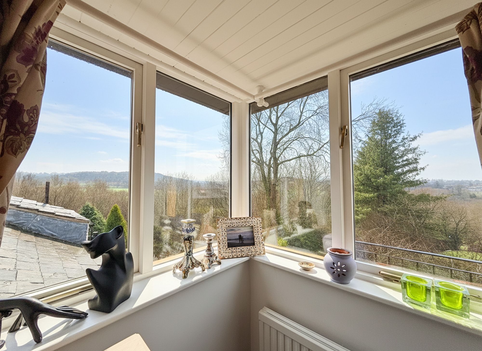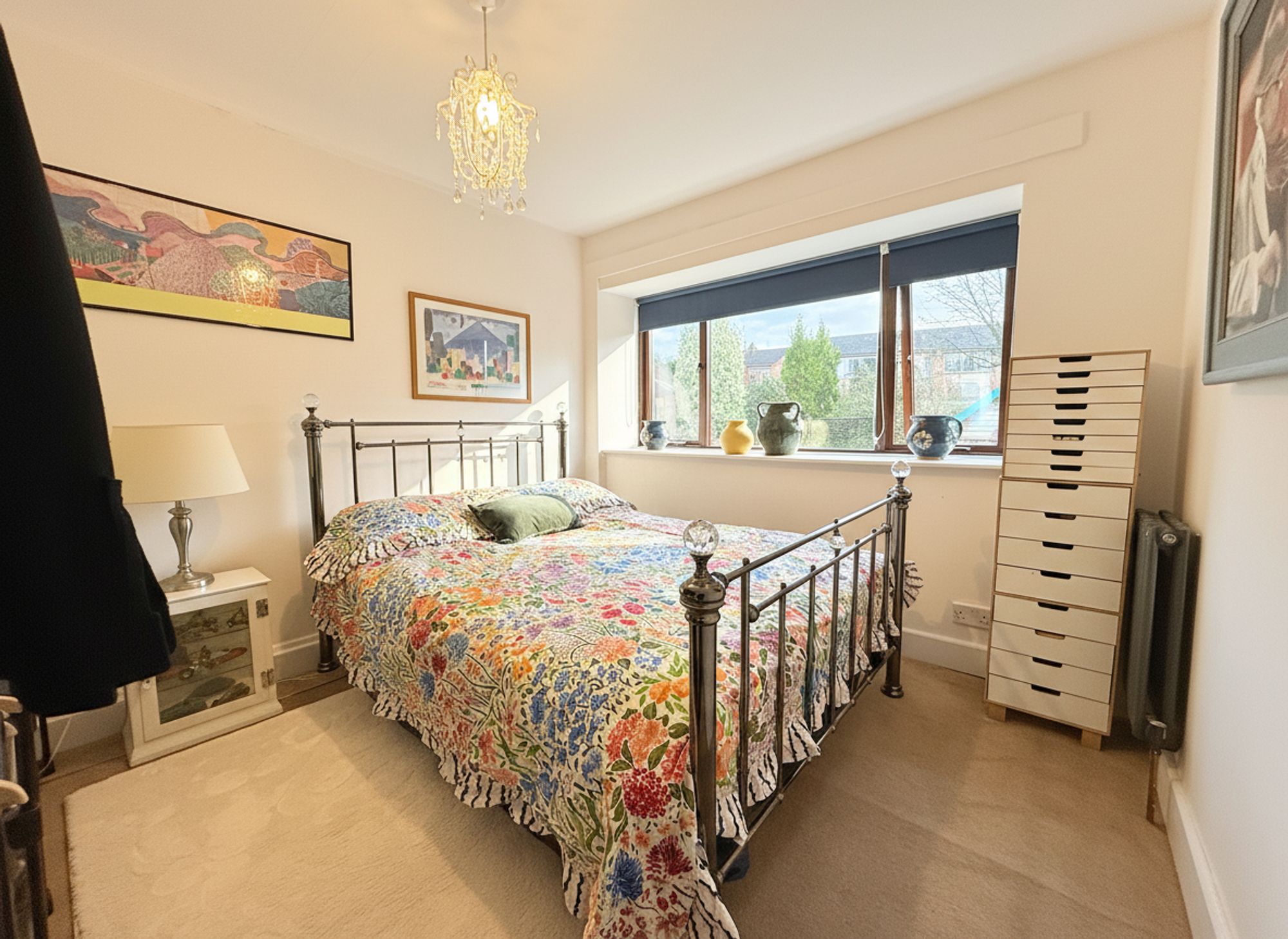 Located to the rear of the property, this stunning principal bedroom is flooded with natural light courtesy of dual-aspect windows and glazed French doors, which offer far-reaching views across the valley. The room is extremely spacious, providing ample space for a king-size bed along with additional bedroom furniture. Built-in storage runs across one wall, while still allowing plenty of room for further freestanding furniture if desired. The bedroom also benefits from access to a private balcony overlooking the garden and surrounding countryside, an ideal spot to enjoy warmer months, morning coffee, or peaceful evenings. Being west-facing, the balcony enjoys beautiful sunsets.