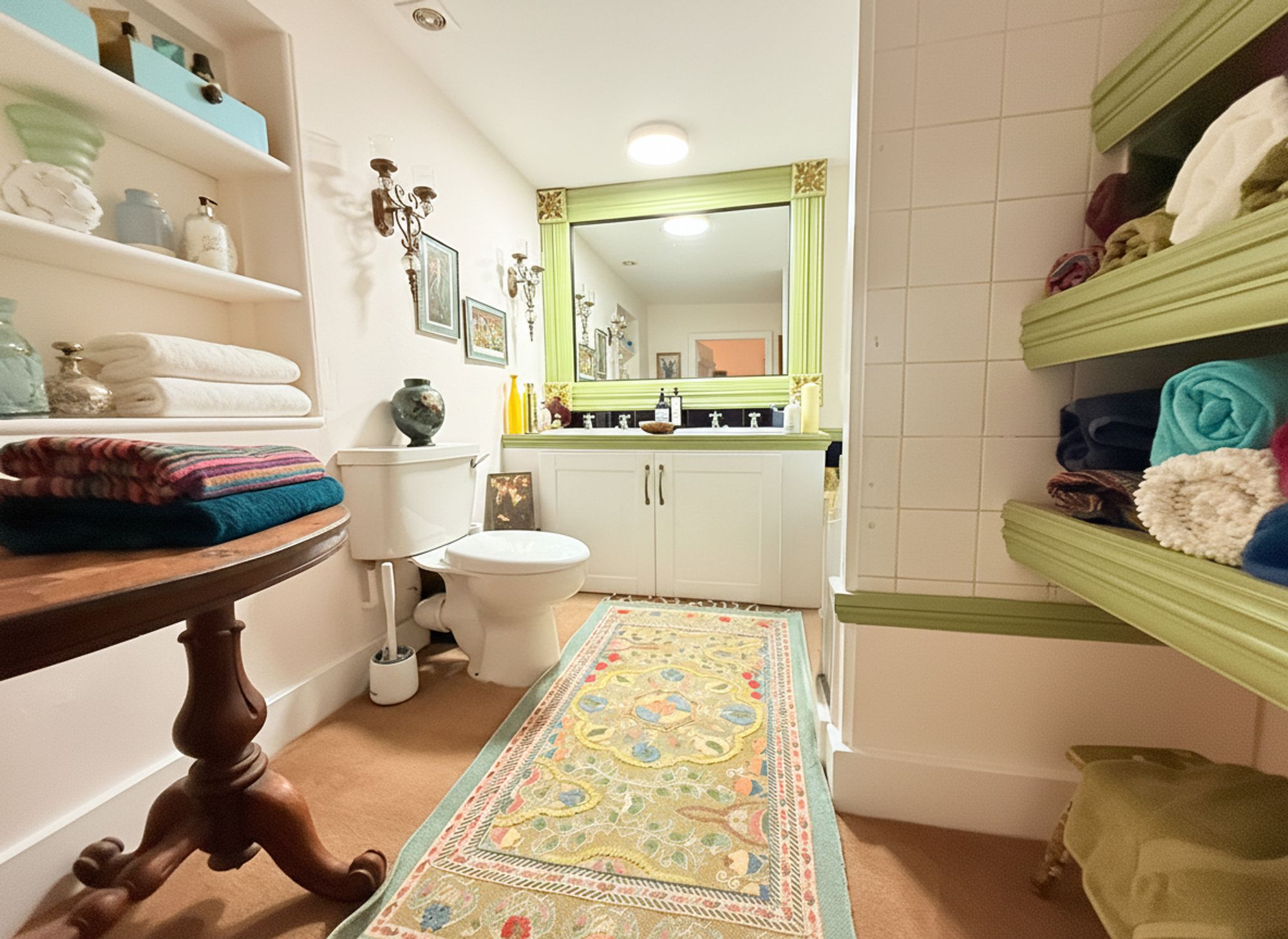 A well-appointed bathroom fitted with a double-sink vanity unit featuring chrome taps, deep blue tiled worktops, and storage below. The suite includes a WC and a full-sized bath with a chrome mixer tap and handheld shower attachment, as well as a separate shower fitted with a handheld attachment. The room also benefits from a built-in storage area, ideal for linens, along with additional space for freestanding furniture. Finished with crisp deep blue tiling to complement the vanity unit, the bathroom offers a stylish and practical space.