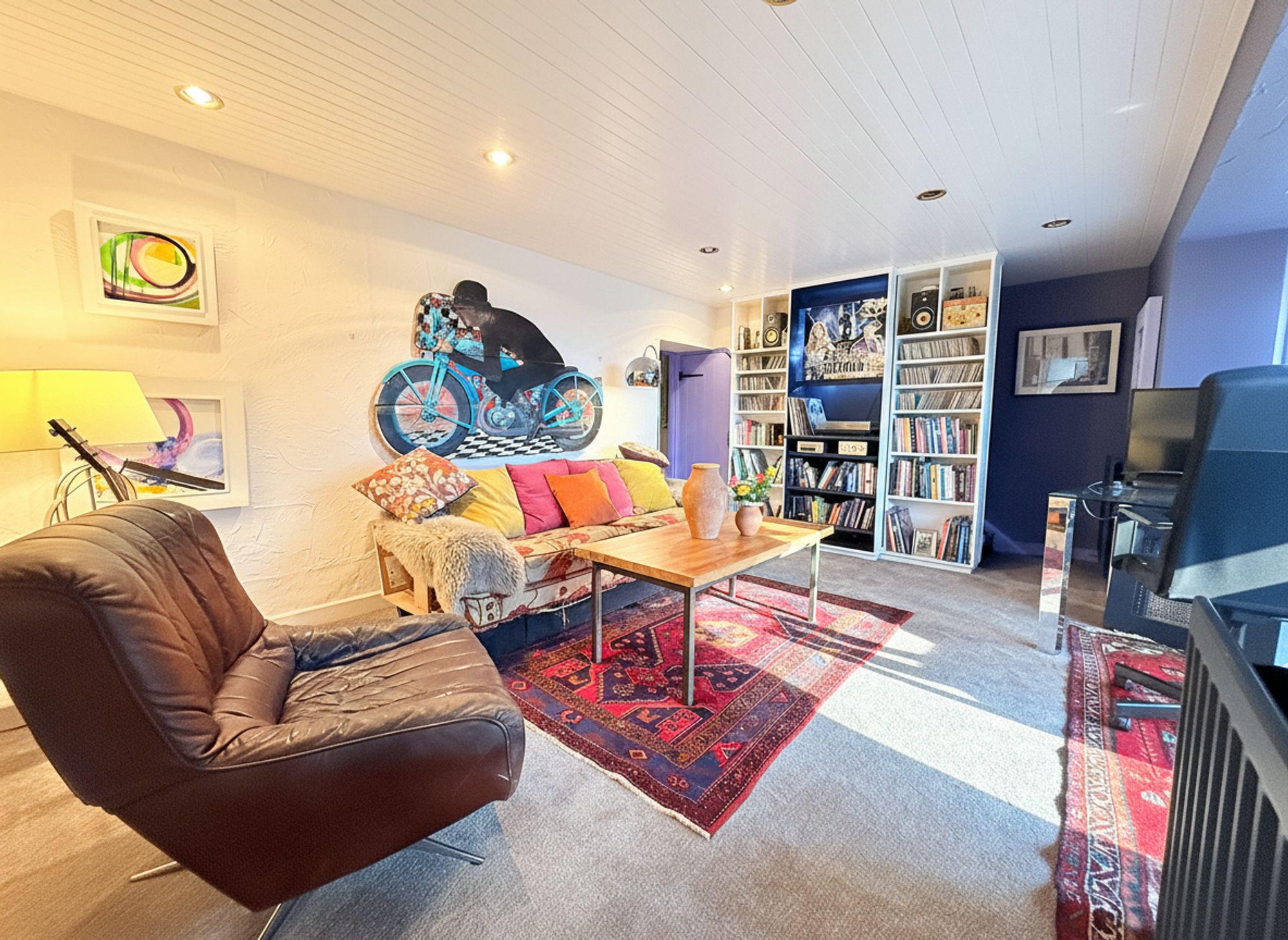 Located to the rear of the property, this bright and spacious room benefits from stunning views over the rear garden, with French doors opening directly onto the garden patio. Decorated in striking tones and finished with plush carpeting, the room feels both elegant and inviting. There is ample space for a full family dining suite, while the versatile layout also allows the room to be used as an ideal sitting room, perfect for enjoying sunsets over the horizon. The space is further enhanced by built-in storage and a convenient under-stairs cupboard, adding both character and practicality.
