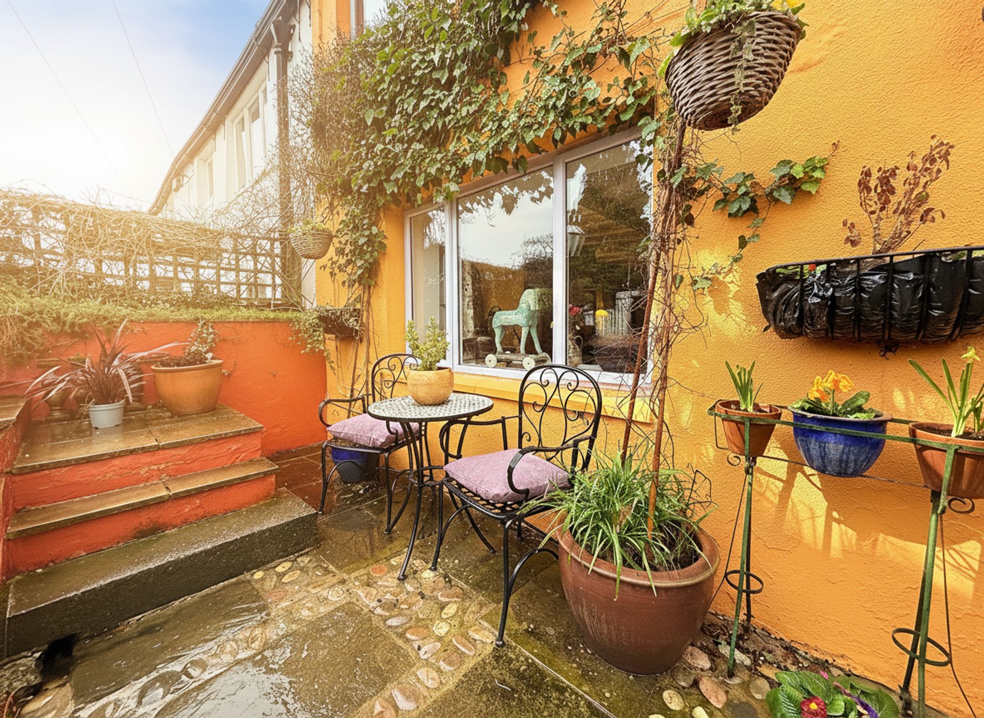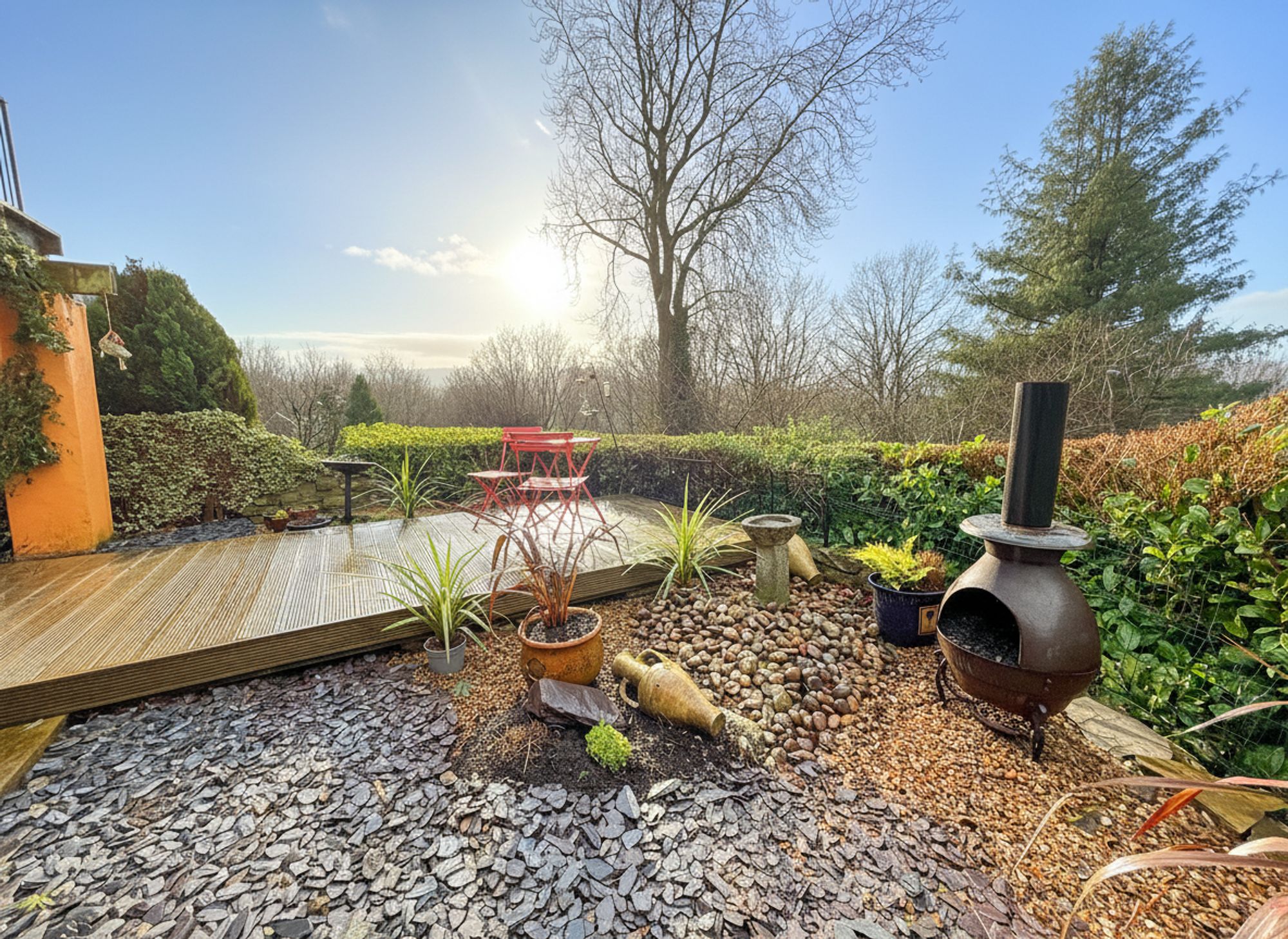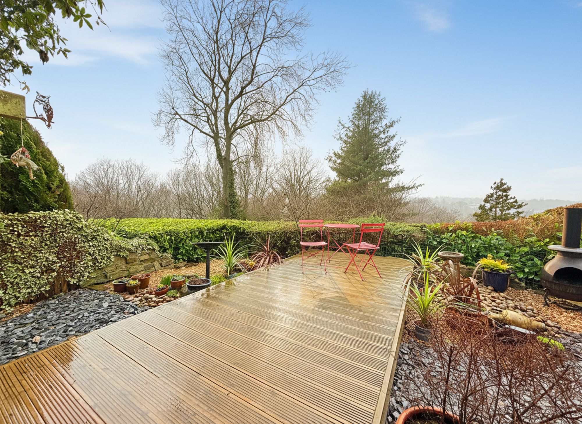 Beautifully presented and full of charm, the rear garden enjoys far-reaching views across the valley and is perfectly orientated to soak up glowing evening sunsets. The main garden is finished with a slate-chipped lawn and a raised wooden decking area, flowing directly from the dining room French doors and creating a delightful spot for alfresco dining or long summer evenings outdoors. Thoughtfully landscaped, the garden features gently pebbled planting beds and mature hedging that frame the space beautifully, giving it a well-established, almost storybook feel. The garden sweeps gracefully from the rear of the property around to the side, where a further garden area continues the same tasteful design. A softly curving slate-chipped pathway winds through the pebbled lawn, leading to a gated access point, bordered by raised stone planting beds and mature hedges that add both structure and a sense of seclusion.