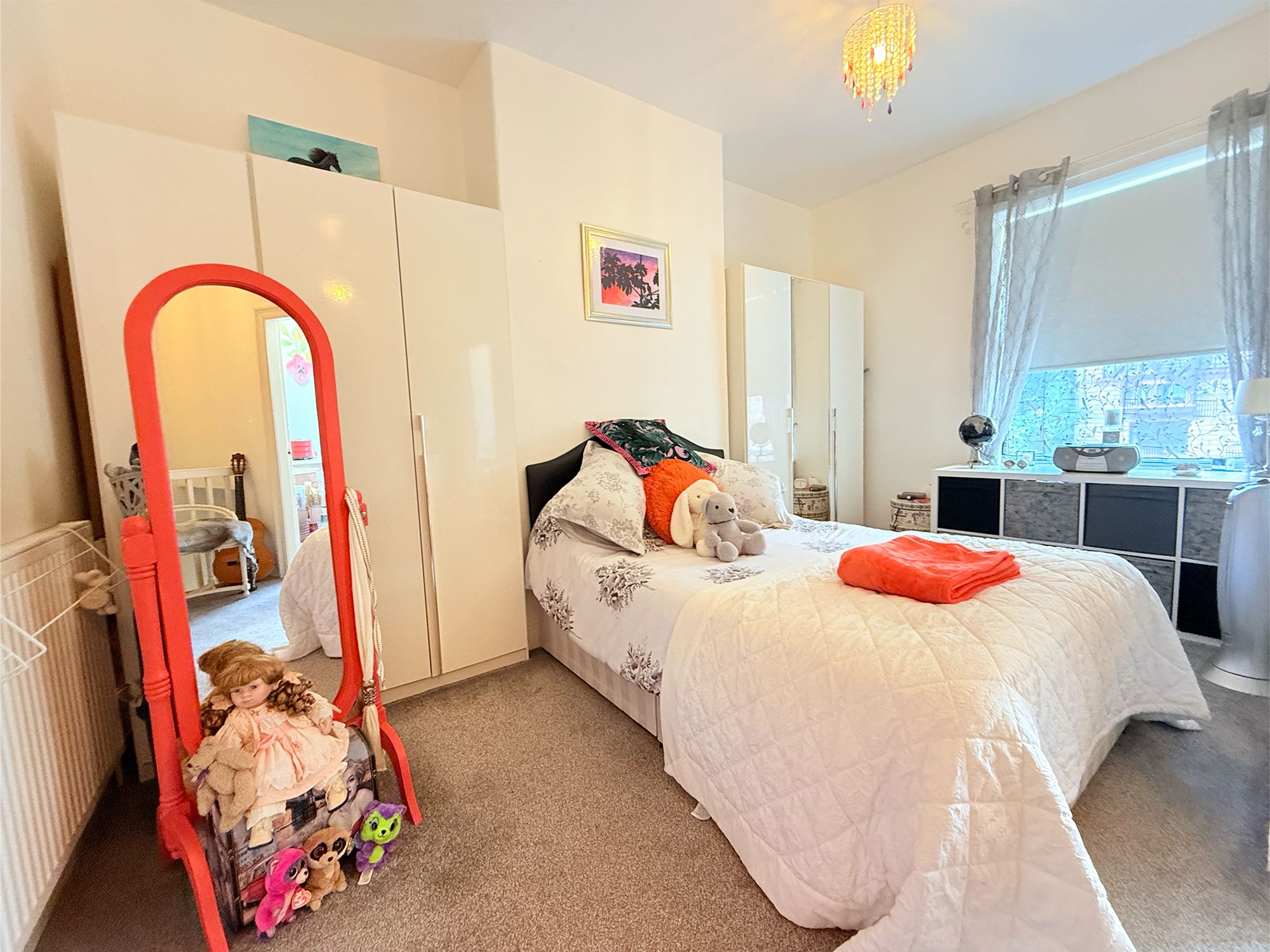 A generously proportioned double bedroom spanning the full depth and width of the property. The room is tastefully decorated in neutral tones and complemented by plush grey carpeting. Character features include a chimney breast and impressively high ceilings, creating both charm and a sense of space. The layout is perfectly suited for fitted full-height wardrobes on either side of the chimney breast, while still leaving ample room for additional free-standing furniture. Conveniently, the bedroom benefits from direct access to the bathroom.