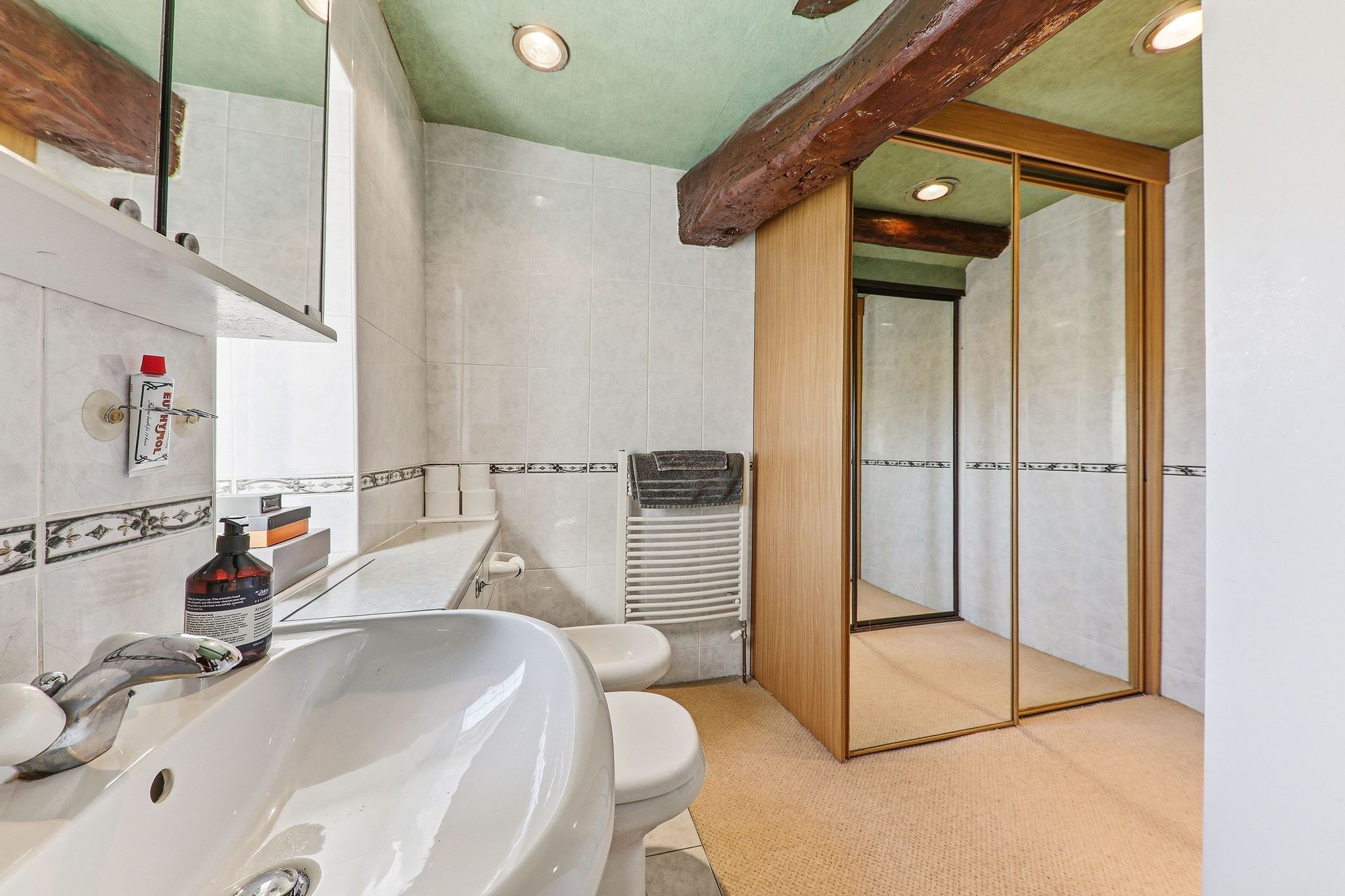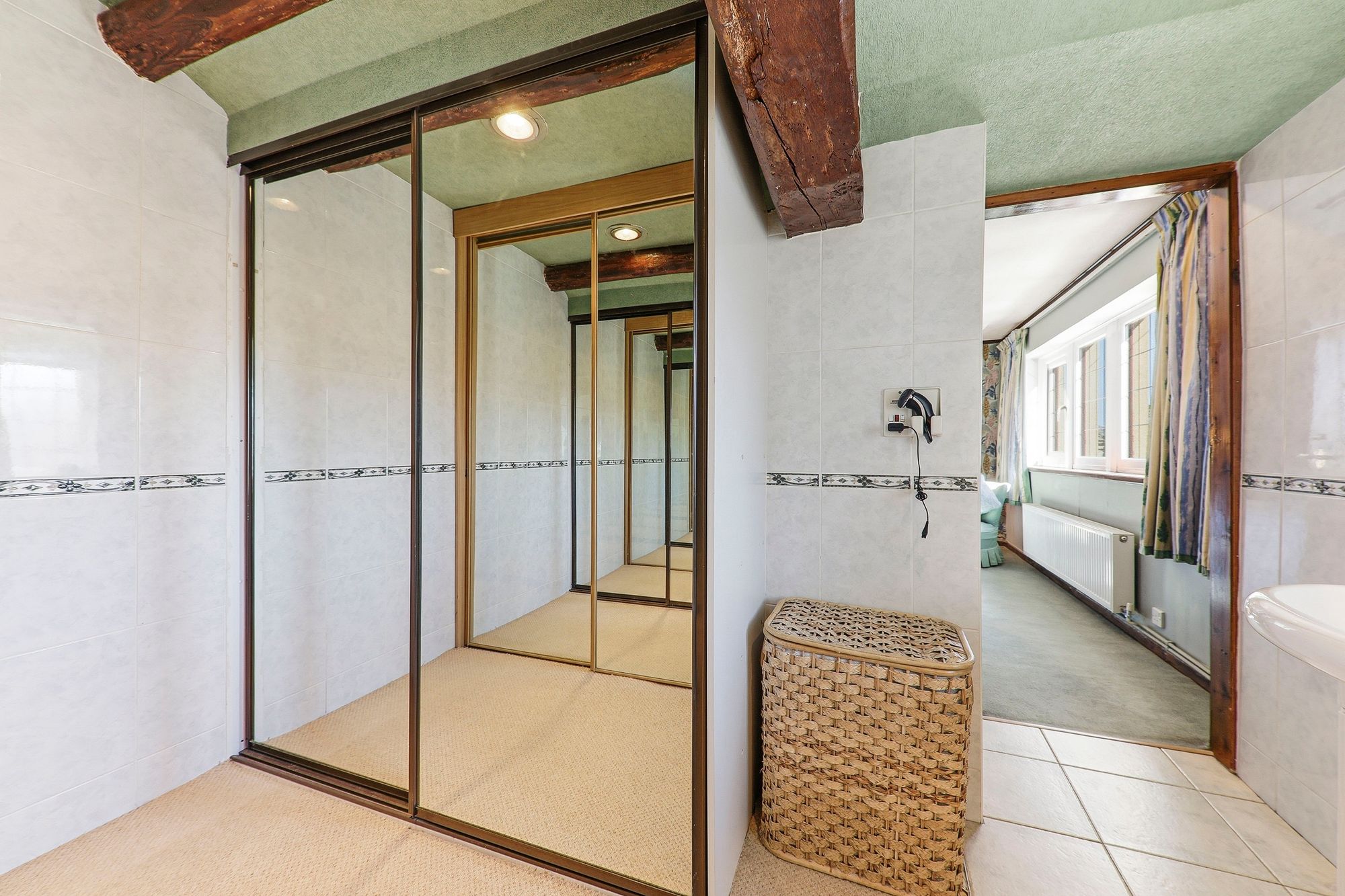 A fabulous sized en-suite and dressing area serving the master bedroom, beautifully enhanced by original exposed beams which add character and charm. The space benefits from two sliding mirrored wardrobes, providing ample storage while enhancing the sense of light and space. The en-suite is well appointed with a wash basin, bidet and W.C., all incorporated within a stylish vanity unit offering further storage, along with a heated towel rail for added comfort.