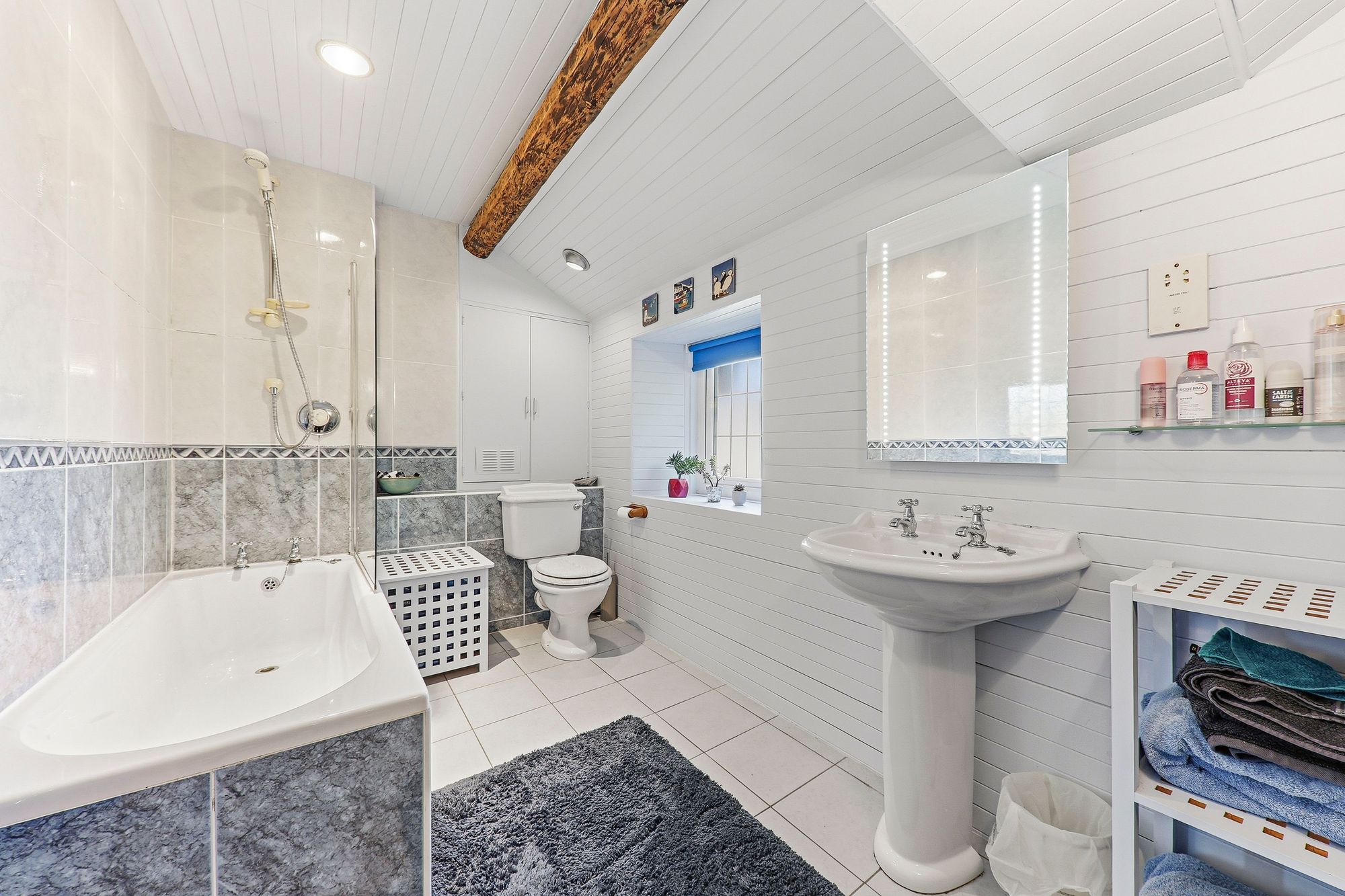The house bathroom is well appointed, featuring a full-size bath with shower over and glass screen, a wash basin with illuminated mirror above, W.C. and a chrome heated towel rail. The space is beautifully styled with complementary two-tone tiling and an attractive border, enhanced by pastel blue panelling which adds a soft, charming touch. Tiled flooring completes the look, while a useful storage cupboard and exposed beams further enhance both the practicality and character.