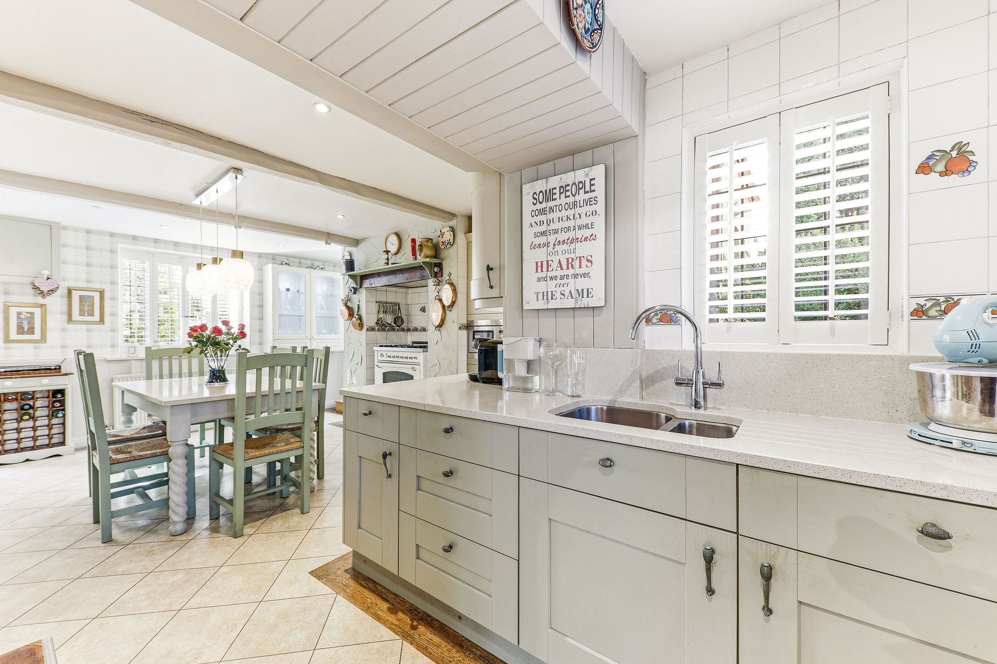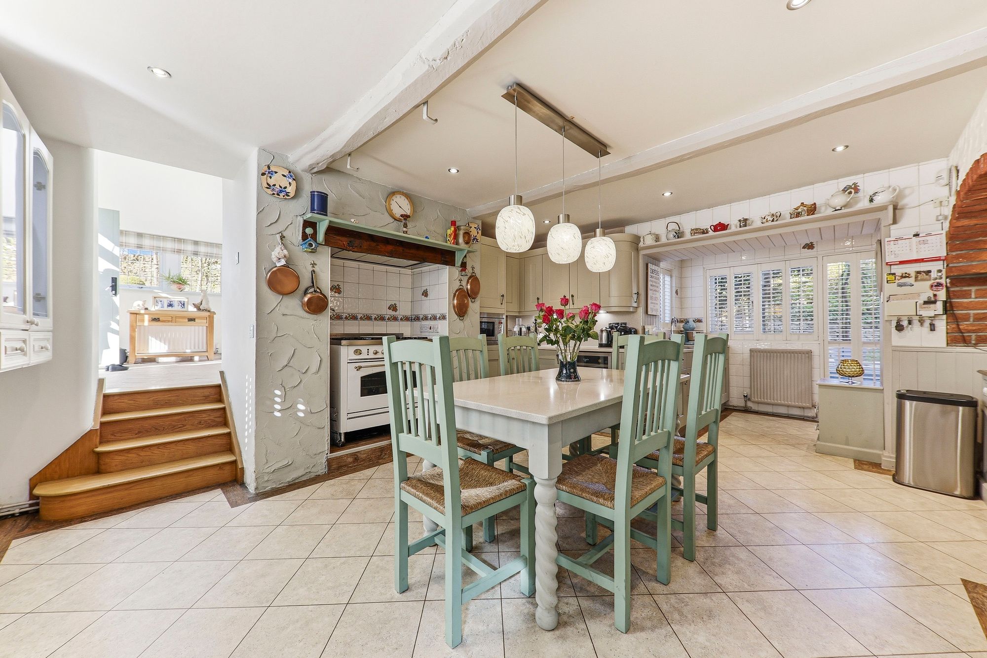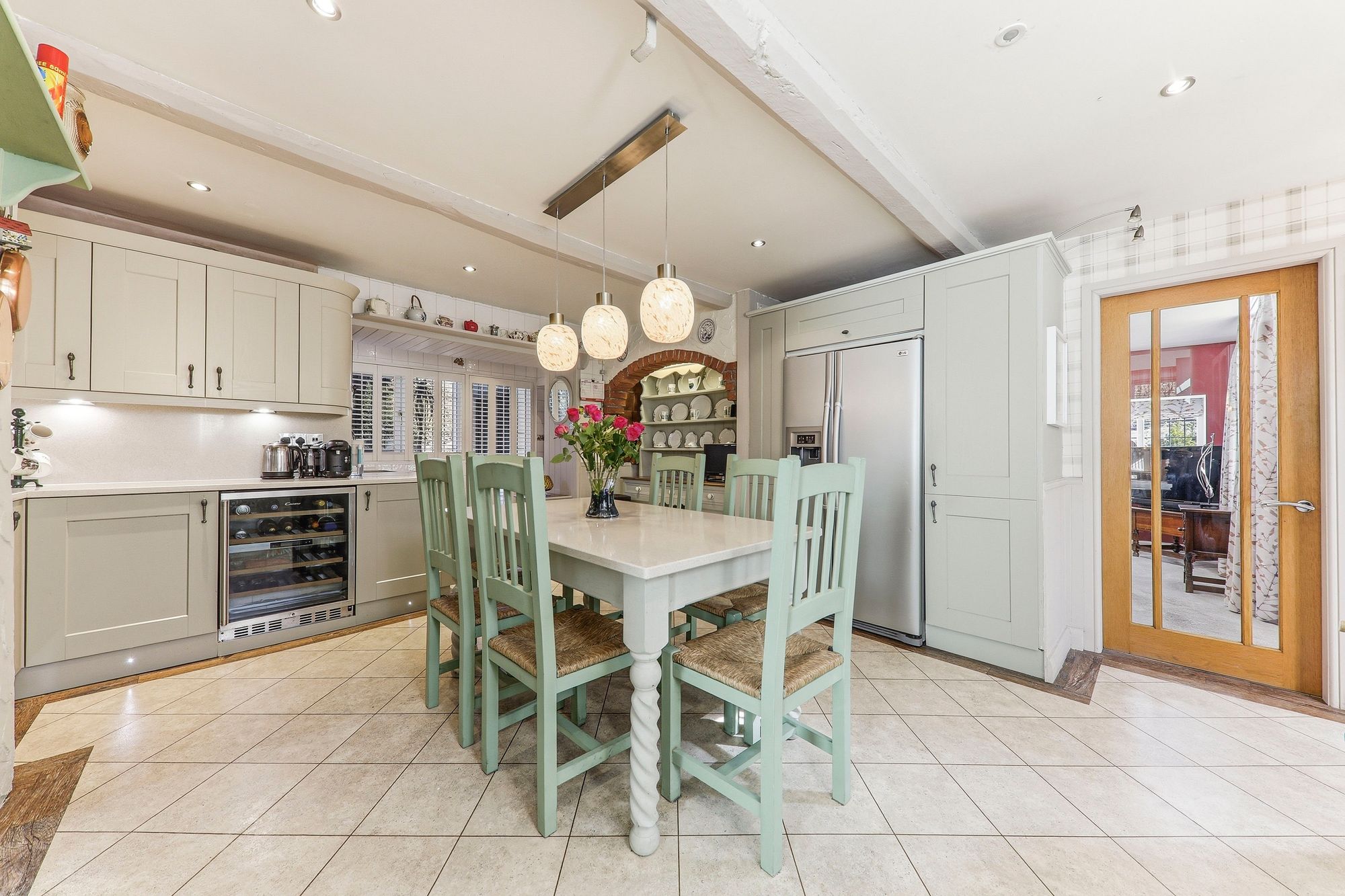 A classic country farmhouse kitchen beautifully appointed with a range of shaker-style units complemented by luxurious work surfaces. The exposed chimney breast creates a striking focal point, housing the freestanding cooker, with additional space for a large American-style fridge freezer. Integrated appliances include a wine cooler, microwave and a sink with mixer tap. Generous in size, the kitchen comfortably accommodates a family sized dining table and chairs, creating an incredibly sociable and inviting setting at the heart of the home.