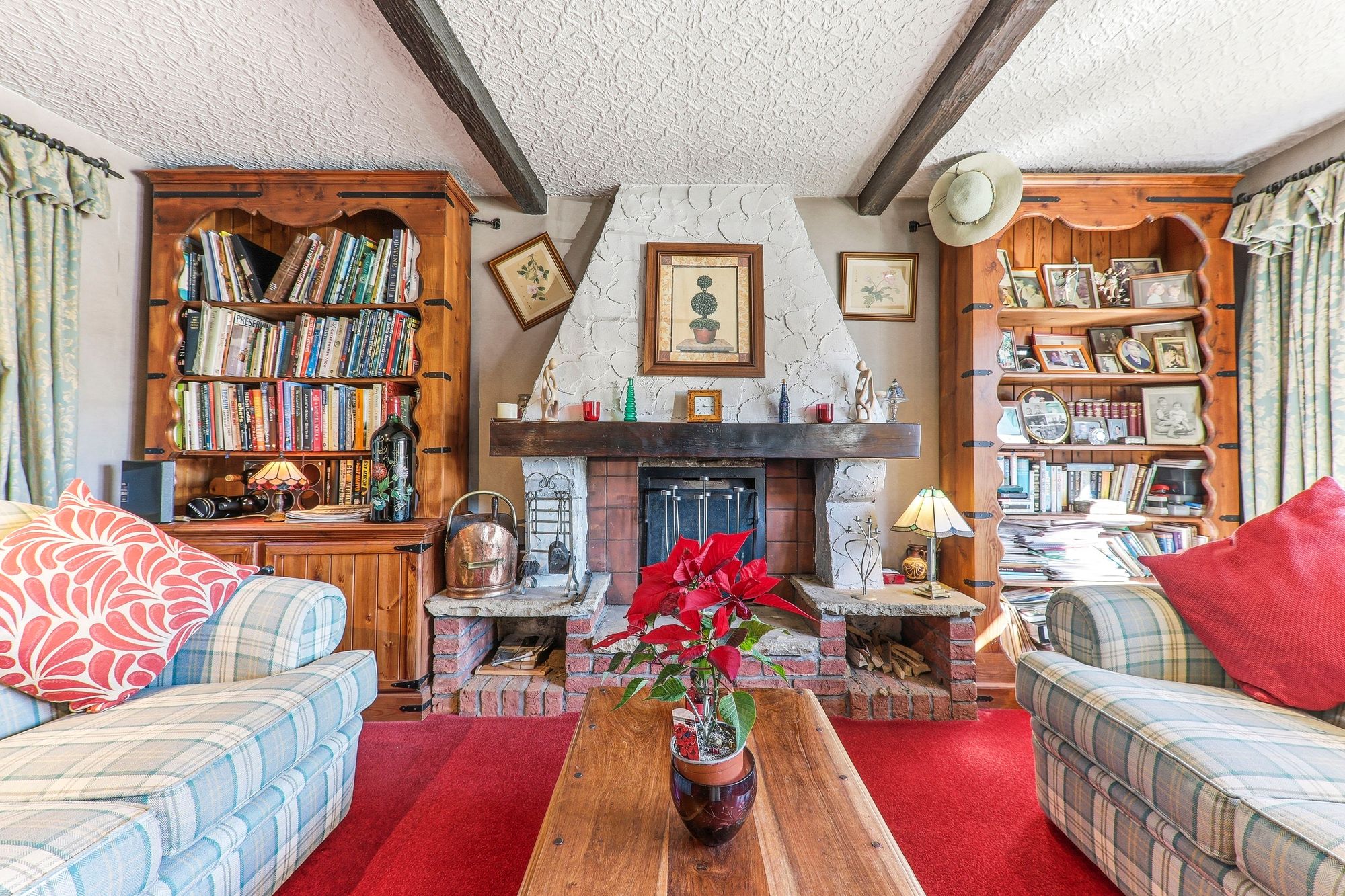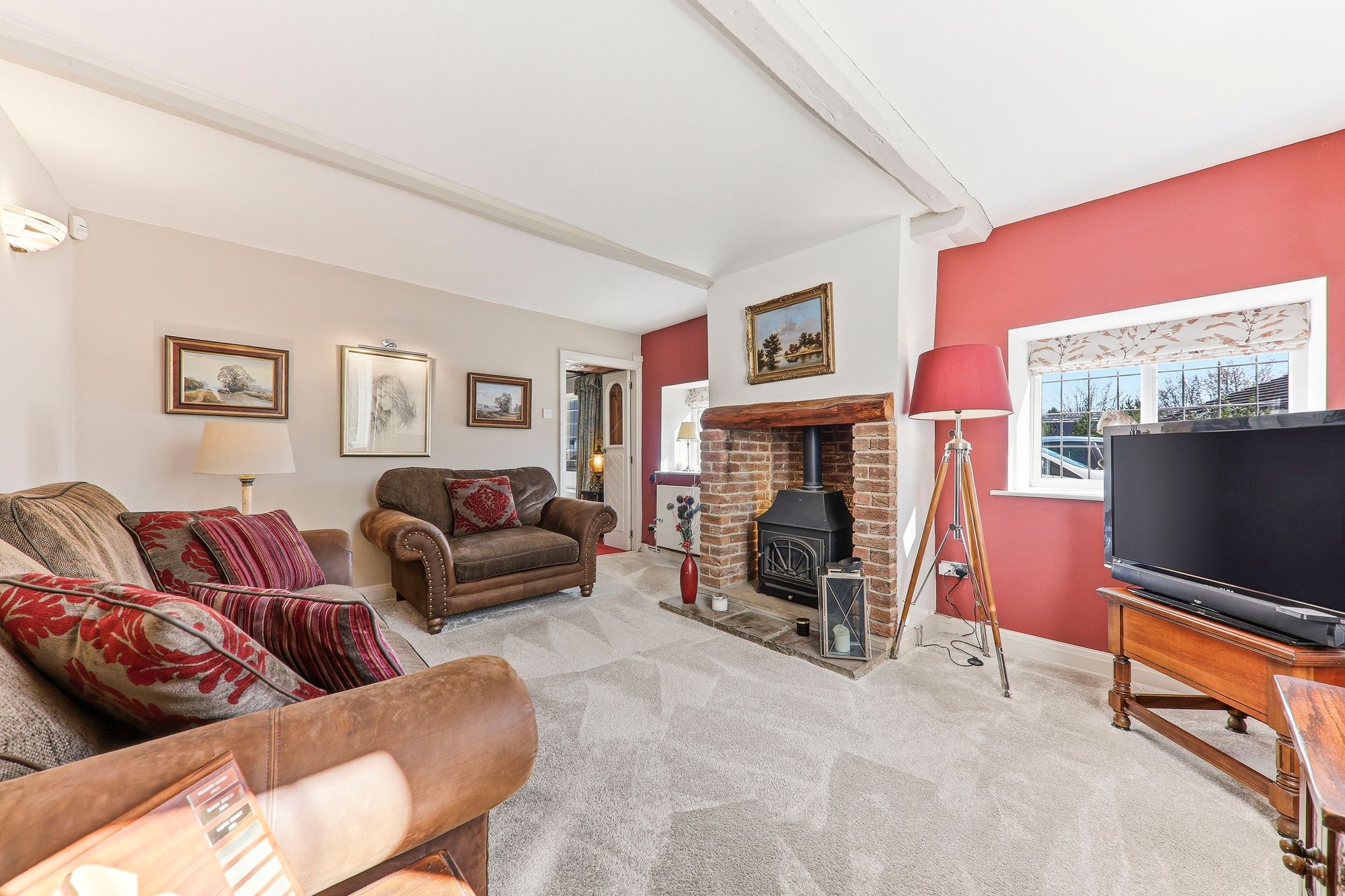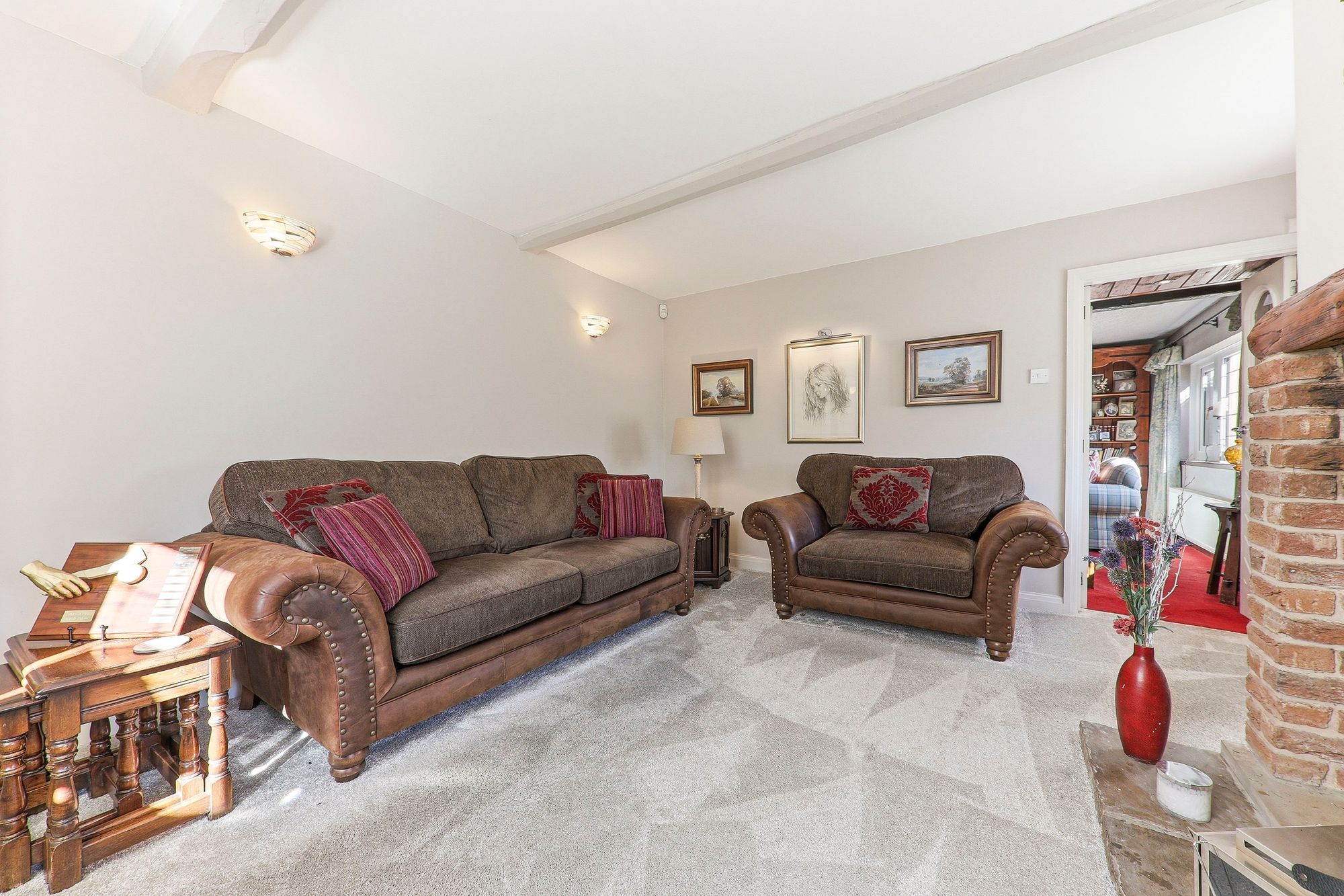 The lounge is beautifully decorated in soft, neutral tones with plush carpet underfoot. The main focal point is the charming coal-effect gas stove, set within an exposed brick and stone surround, adding character and a cosy ambience. Windows to multiple aspects flood the room with natural light while framing idyllic views over the property’s grounds, enhancing the sense of tranquillity and connection to the surrounding landscape.