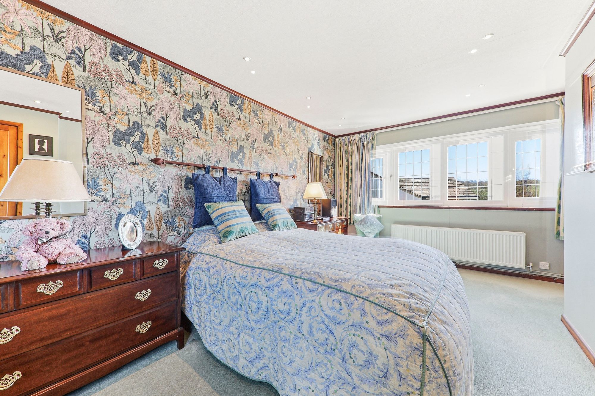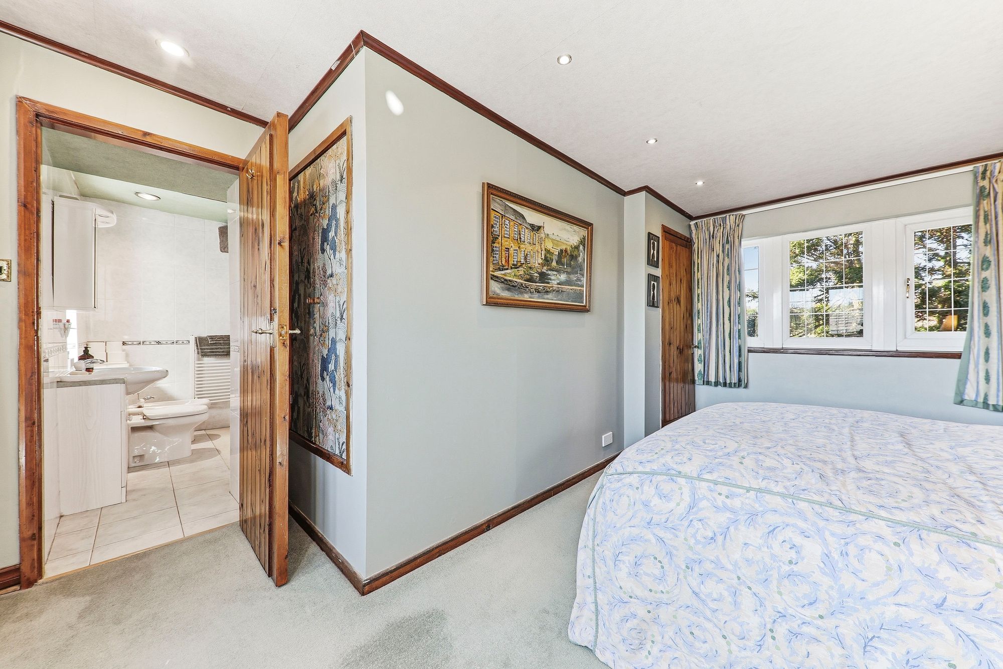 A luxurious master bedroom, flooded with natural light courtesy of dual aspect windows, both of which beautifully frame idyllic views of the surrounding countryside. Generous in proportion, the room offers a wonderful sense of space and tranquillity, featuring a large storage cupboard while still providing ample room for a variety of freestanding furniture.