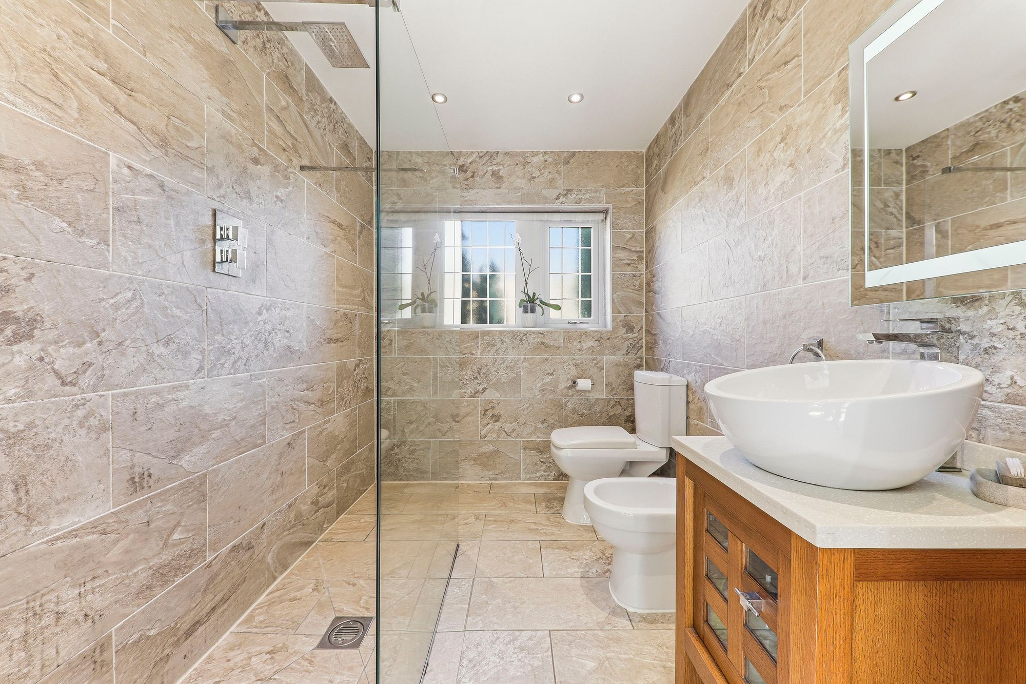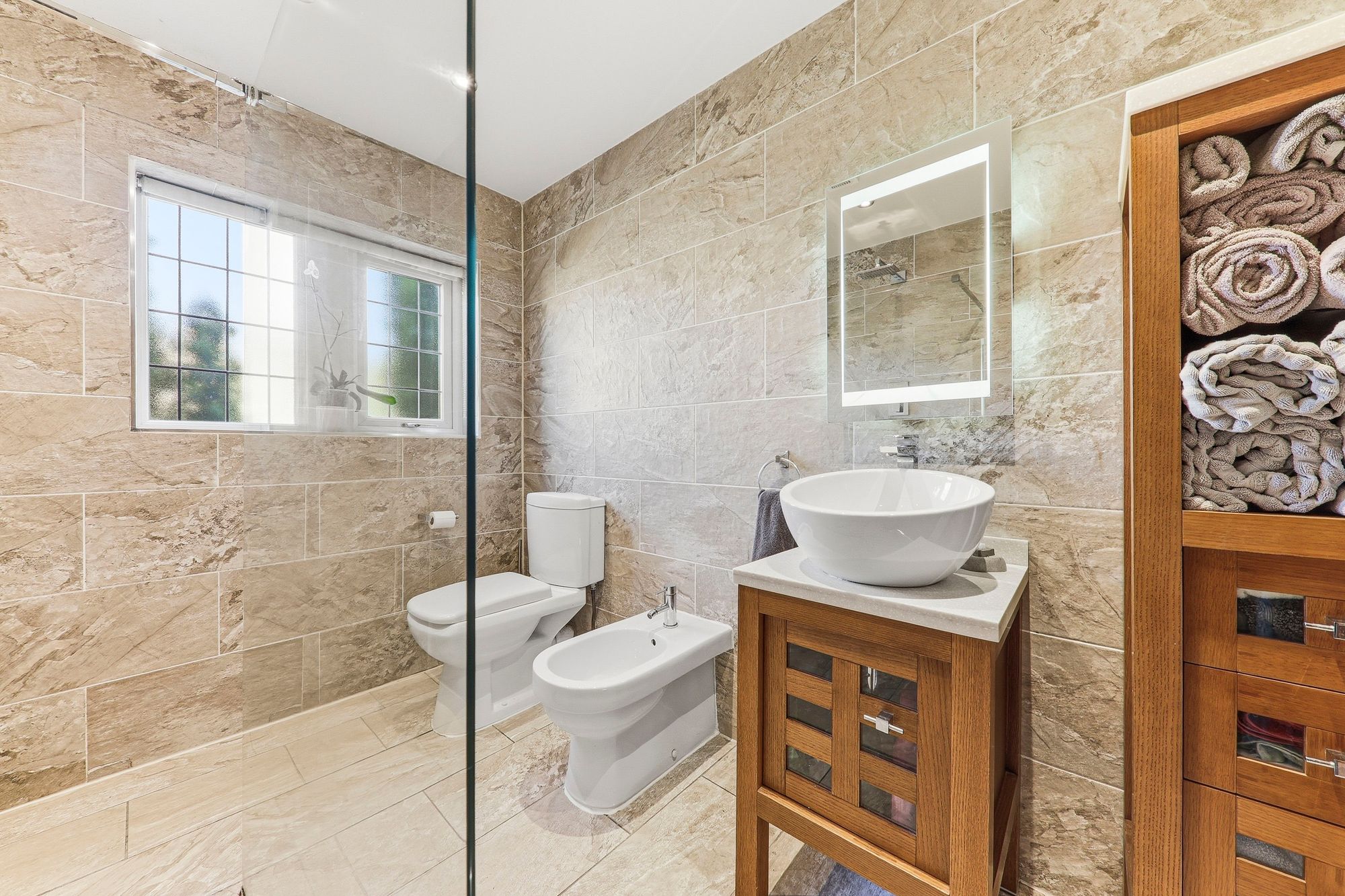 A recently fitted contemporary downstairs wet room, stylishly designed with a walk-in shower featuring a rainfall shower head, a wash basin set within a sleek vanity unit with illuminated mirror above, along with a W.C. and bidet. Fully tiled for easy maintenance, the room further benefits from underfloor heating as well as a heated towel rail adding a touch of everyday luxury and comfort.