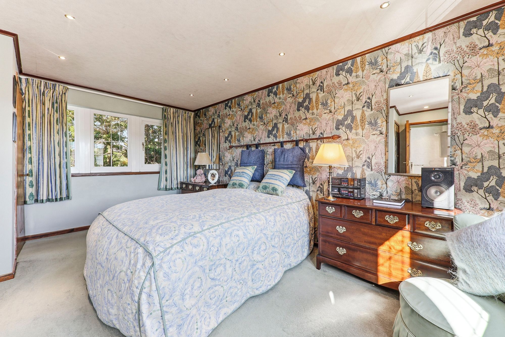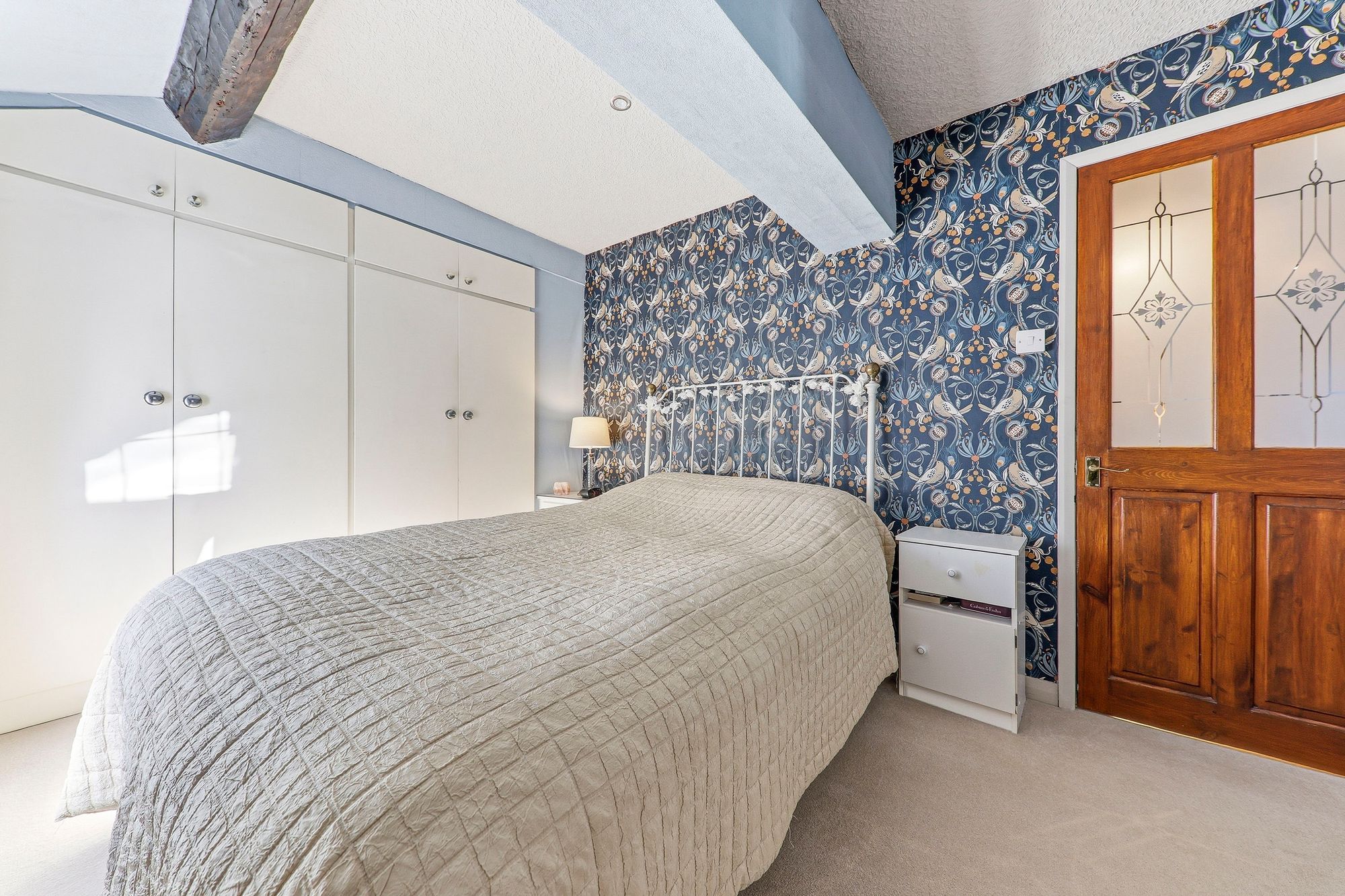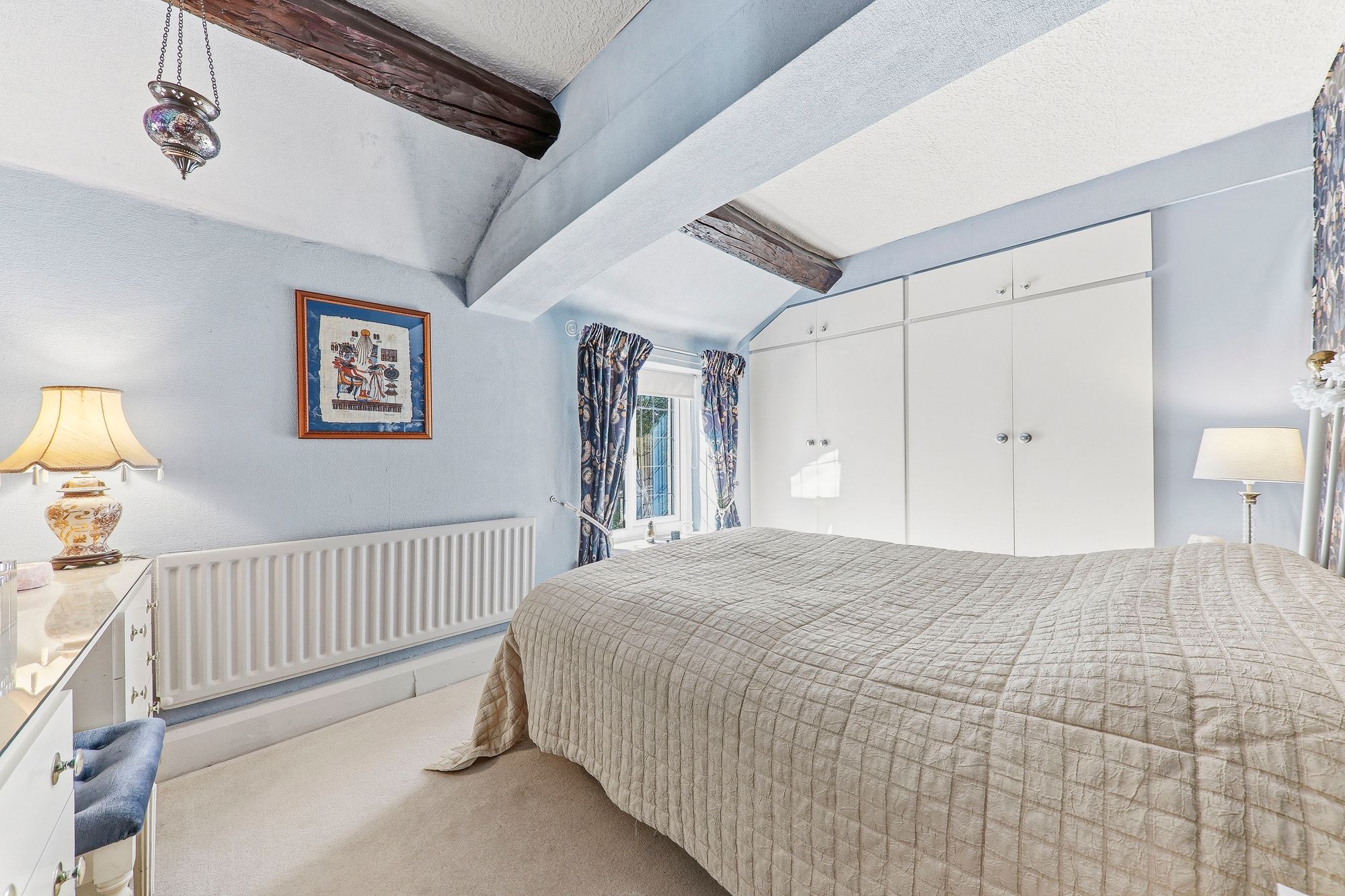 Another well-proportioned double bedroom positioned to the rear of the property, enjoying delightful views over the garden and woodland beyond, creating a truly tranquil backdrop. Full of character, the room features beams and benefits from a full bank of fitted wardrobes, providing excellent storage, along with a dedicated dressing area that further enhances its practicality and appeal.
