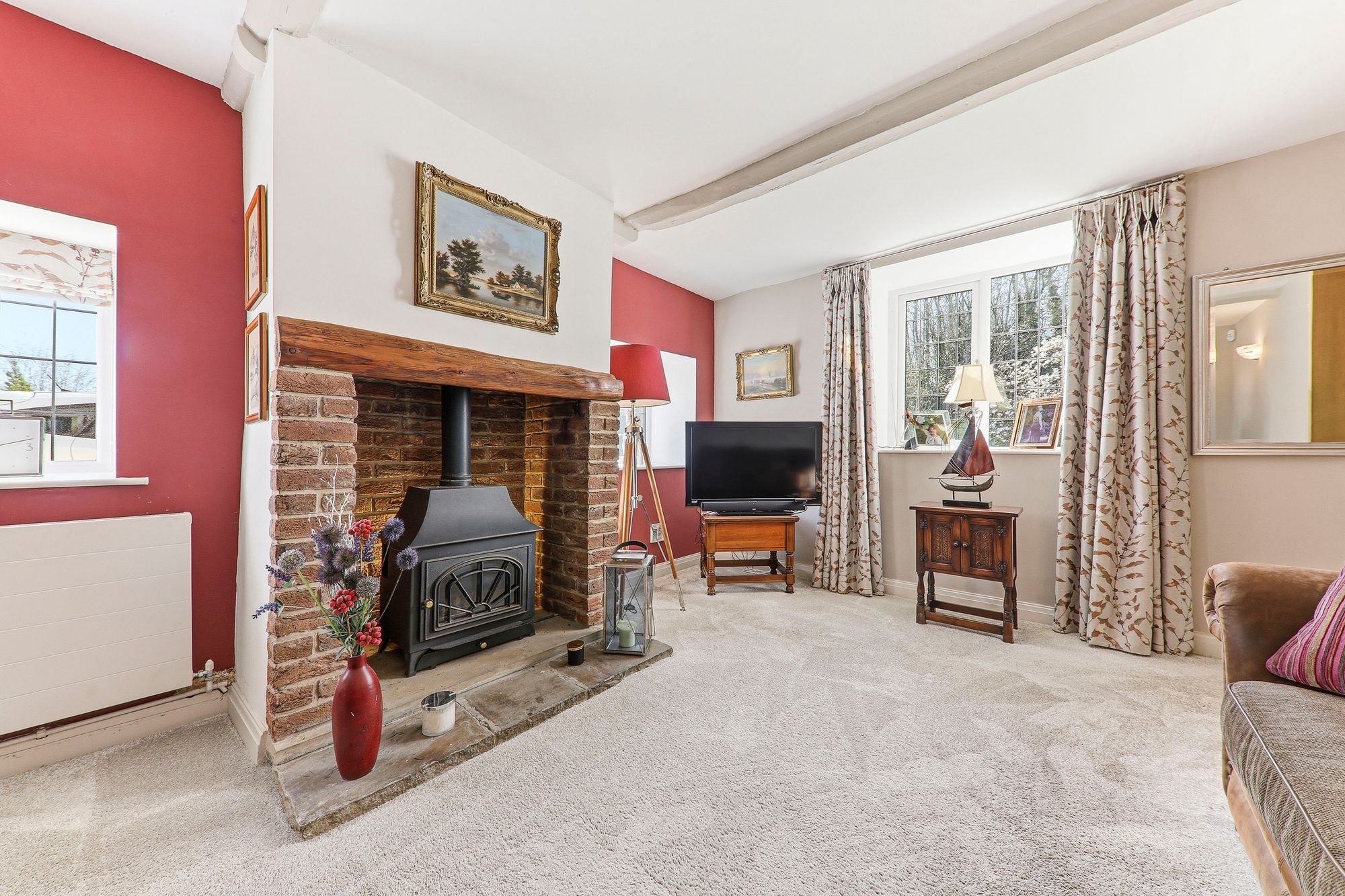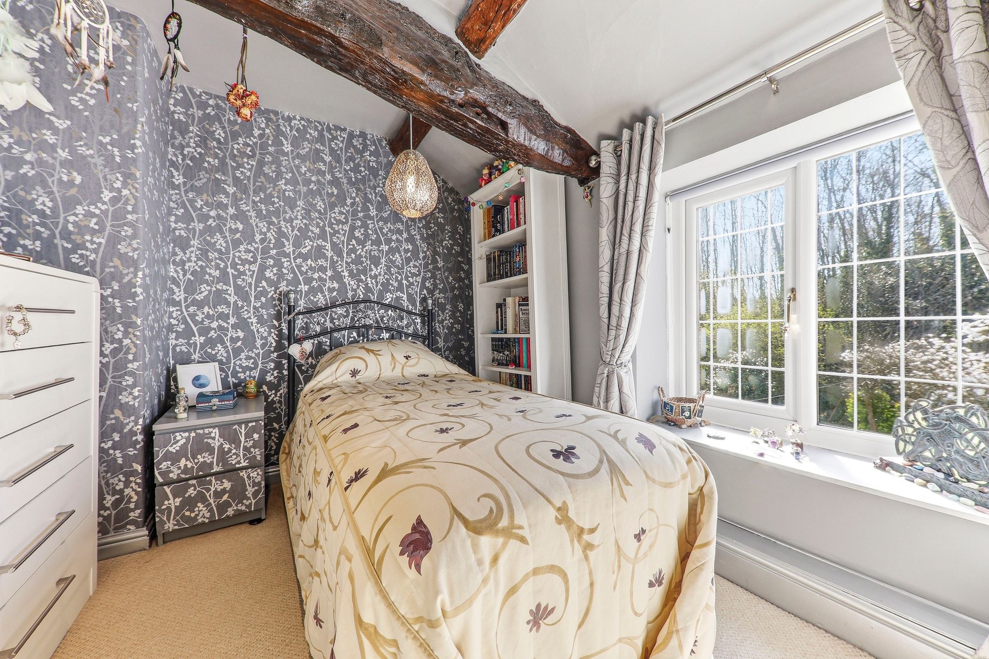 Also located to the rear of the property, this double bedroom enjoys lovely views over the garden and woodland beyond. Generous in size, the room offers ample space for a range of freestanding furniture, while exposed beams and charming window seats add character and a cosy inviting feel.