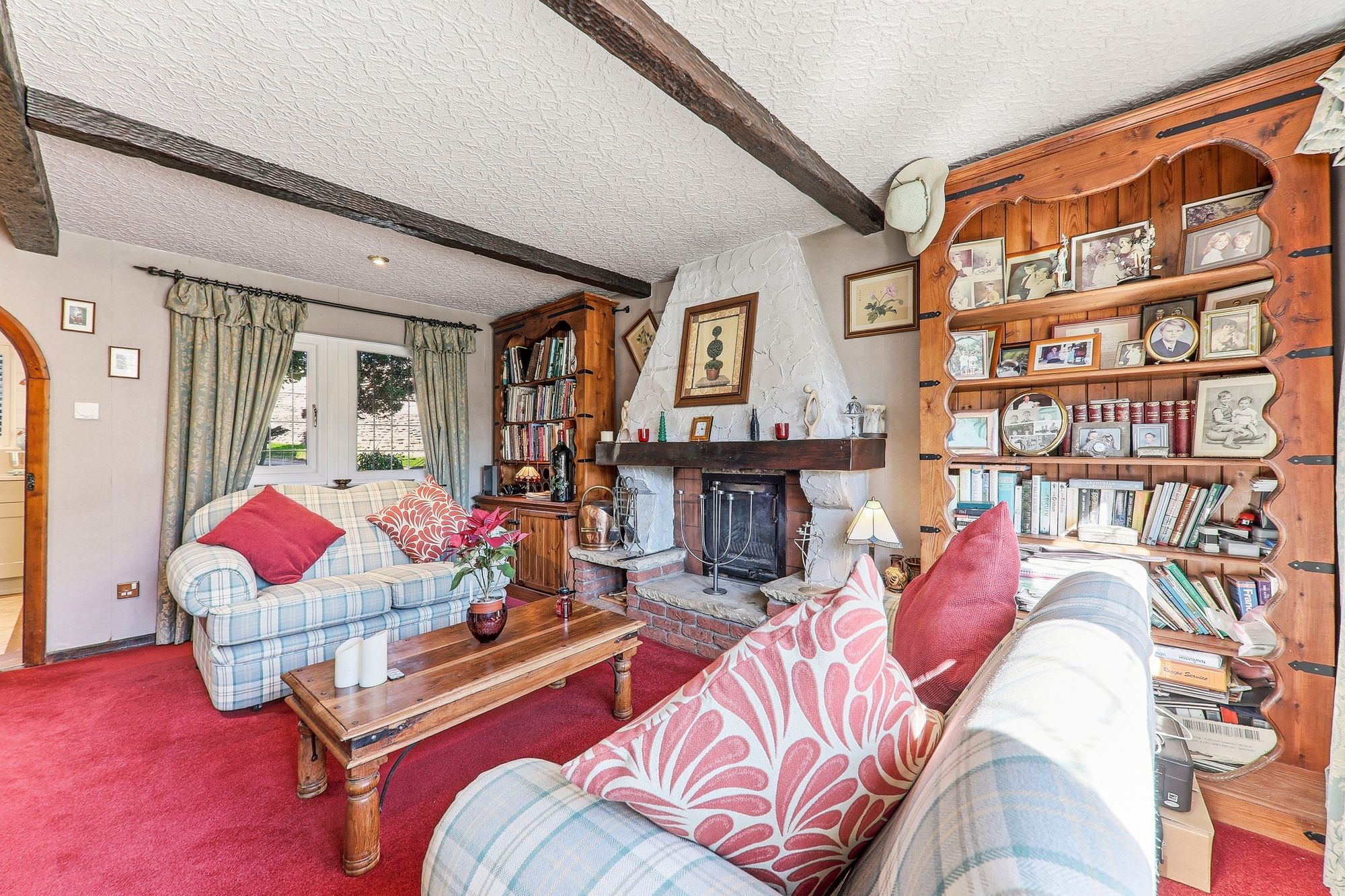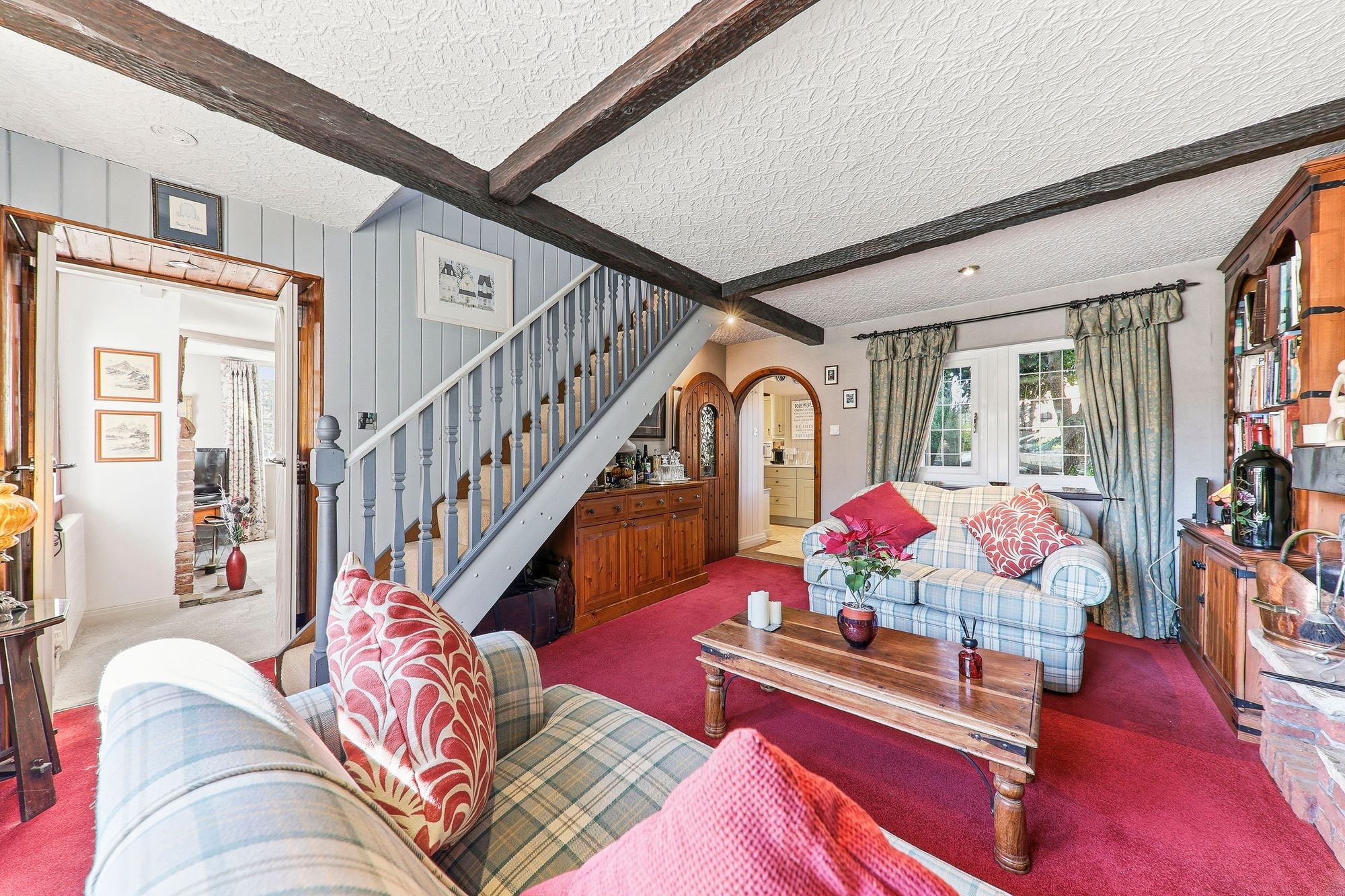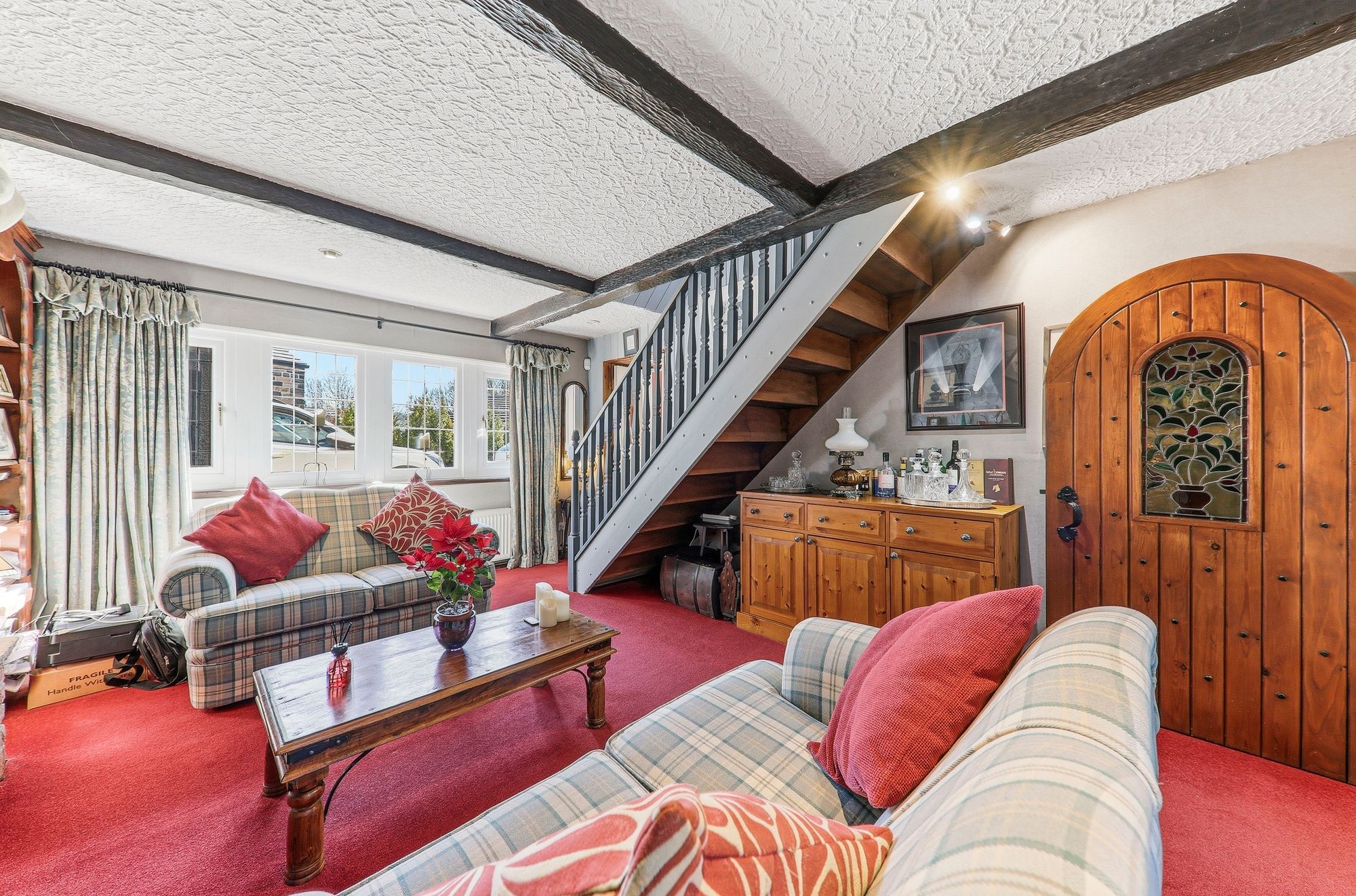 A beautiful arched doorway, enhanced with stained glass detailing from the dining kitchen, opens into this incredibly versatile room, currently utilised as a study/second reception room but equally suited as a formal dining room or home office. The main focal point is the striking exposed brick and stone fireplace, housing a multi-fuel fire that casts a warm and inviting ambience on chilly evenings. Double doors lead through to the lounge and an open staircase rises to the first-floor landing, enhancing both the flow and charm of this unique space.