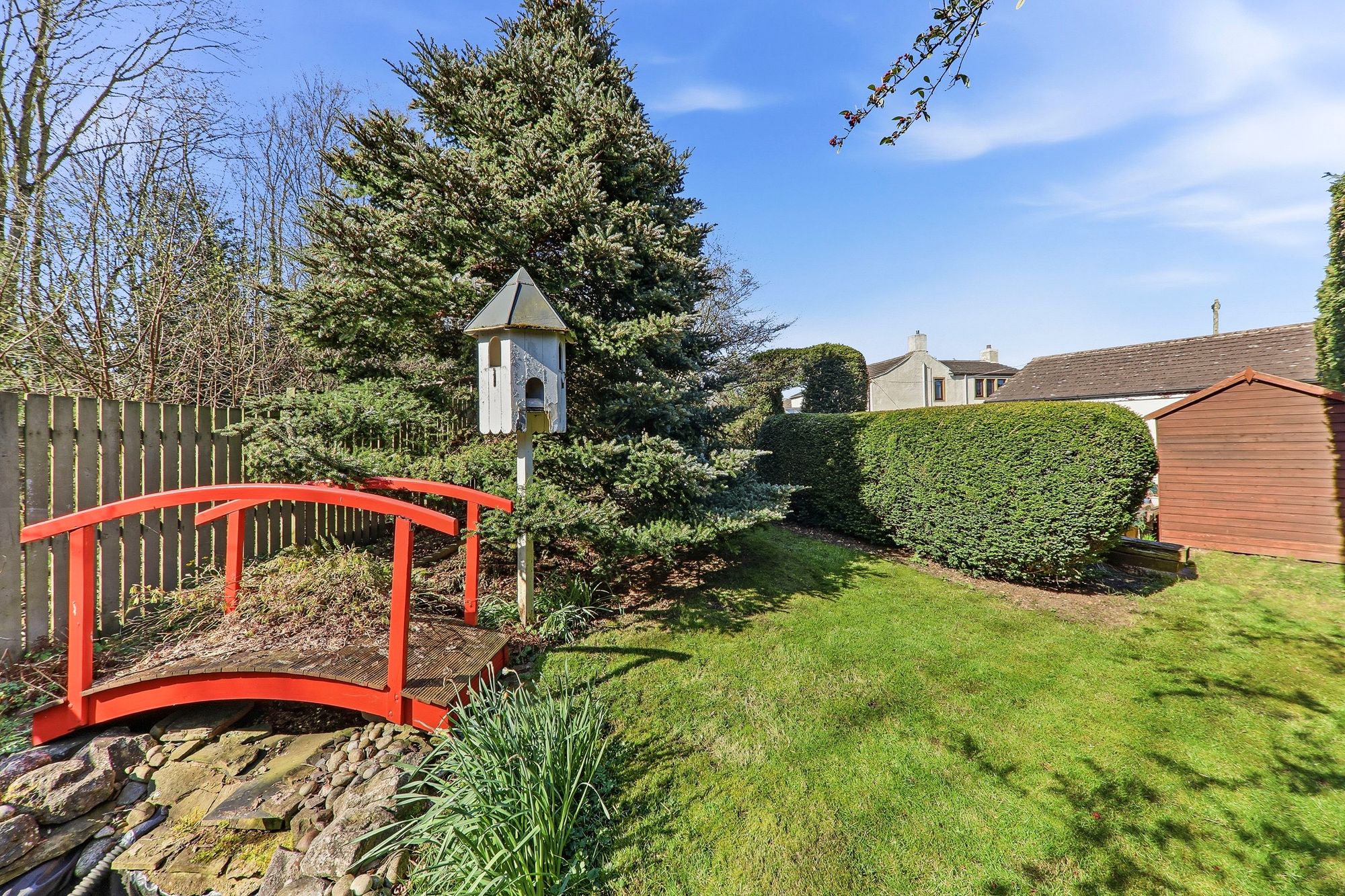 Externally, the property is truly exceptional, set within magnificent fully enclosed gardens that are a real asset to the home. Accessed via two vehicular gates and a pedestrian gate, the property immediately offers a sense of privacy and seclusion, with ample driveway parking and a detached double garage benefiting from power and water supply. The south-facing gardens have been lovingly landscaped and meticulously maintained, creating a breathtaking outdoor haven. Expansive lawn & patio areas are framed by deep, well-stocked borders featuring manicured topiary, mature shrubs and seasonal planting, providing year-round colour and interest. A charming pergola walkway adorned with mature wisteria gently guides you through the grounds, enhancing the sense of tranquillity and romance. A beautiful natural wildlife pond forms a peaceful focal point, while additional features include raised vegetable beds and a selection of fruit trees, including fig, cherry, plum and greengage.