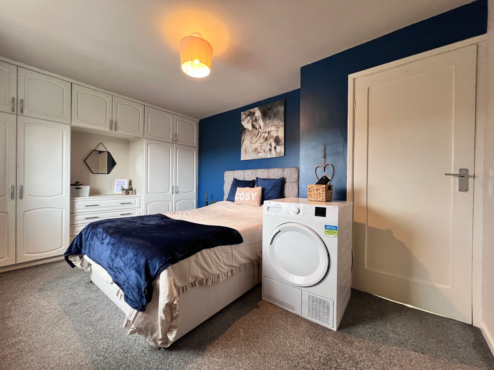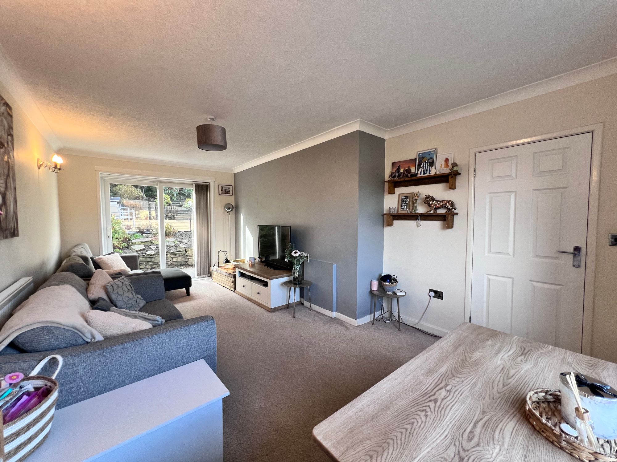 Flooded with natural light courtesy of the front-facing window and patio doors which lead directly out to the rear garden, this bright and inviting room offers a wonderful connection between indoor and outdoor living. Decorated in tasteful tones, the space is generously proportioned, providing ample room for a variety of freestanding furniture as well as a dining table and chairs, making it ideal for both relaxing and entertaining.