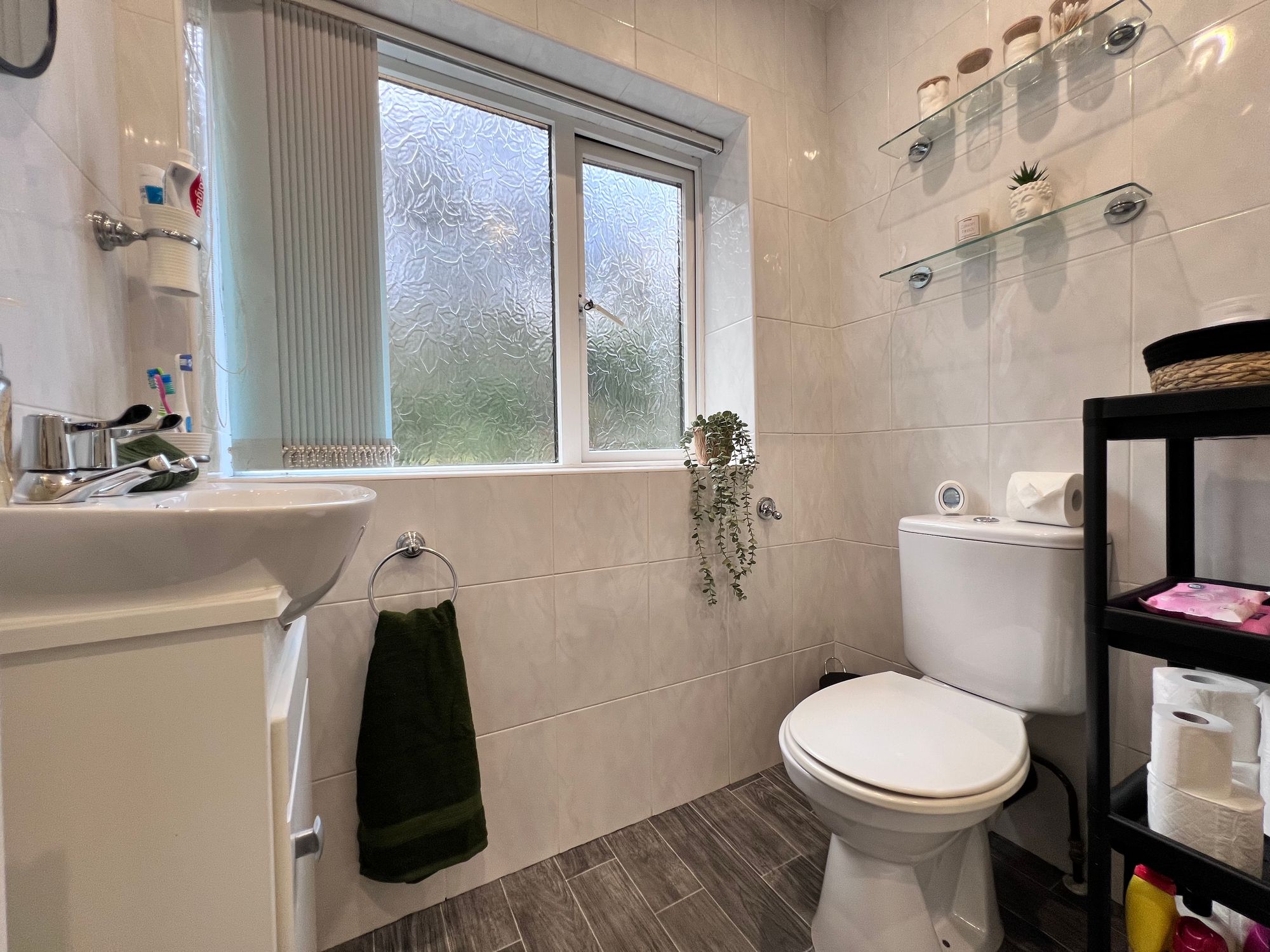 The shower room is contemporary in design, featuring a walk-in shower cubicle with electric shower, along with a wash basin set within a vanity unit and a low-level W.C. The walls are fully tiled for easy maintenance, complemented by wood-effect lino flooring, creating a clean, stylish and practical finish.