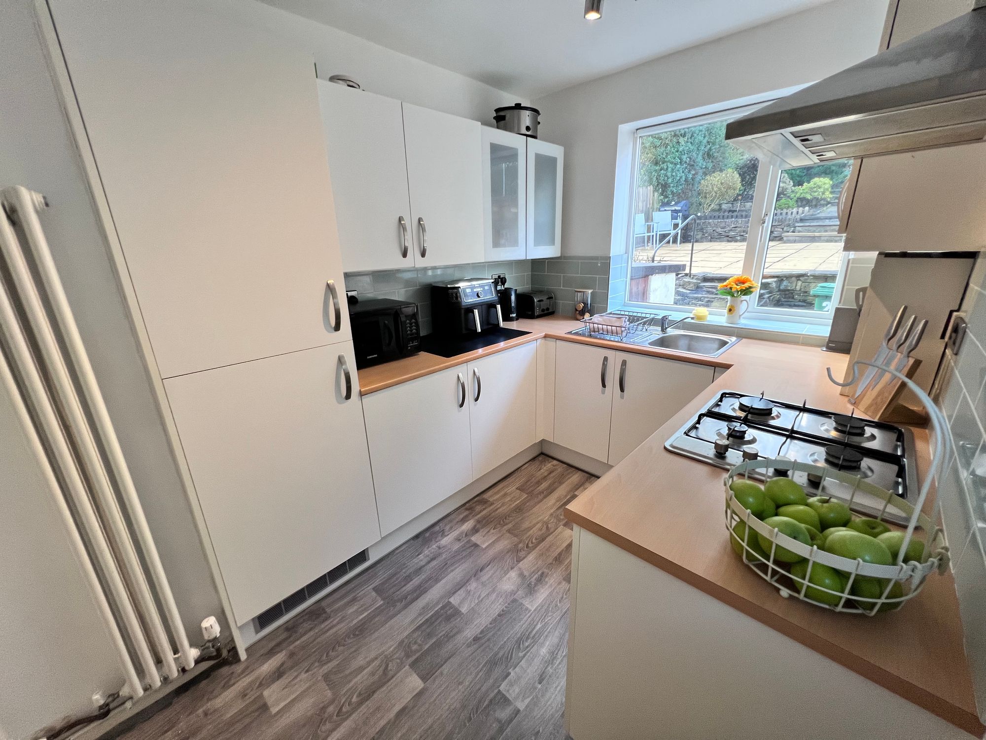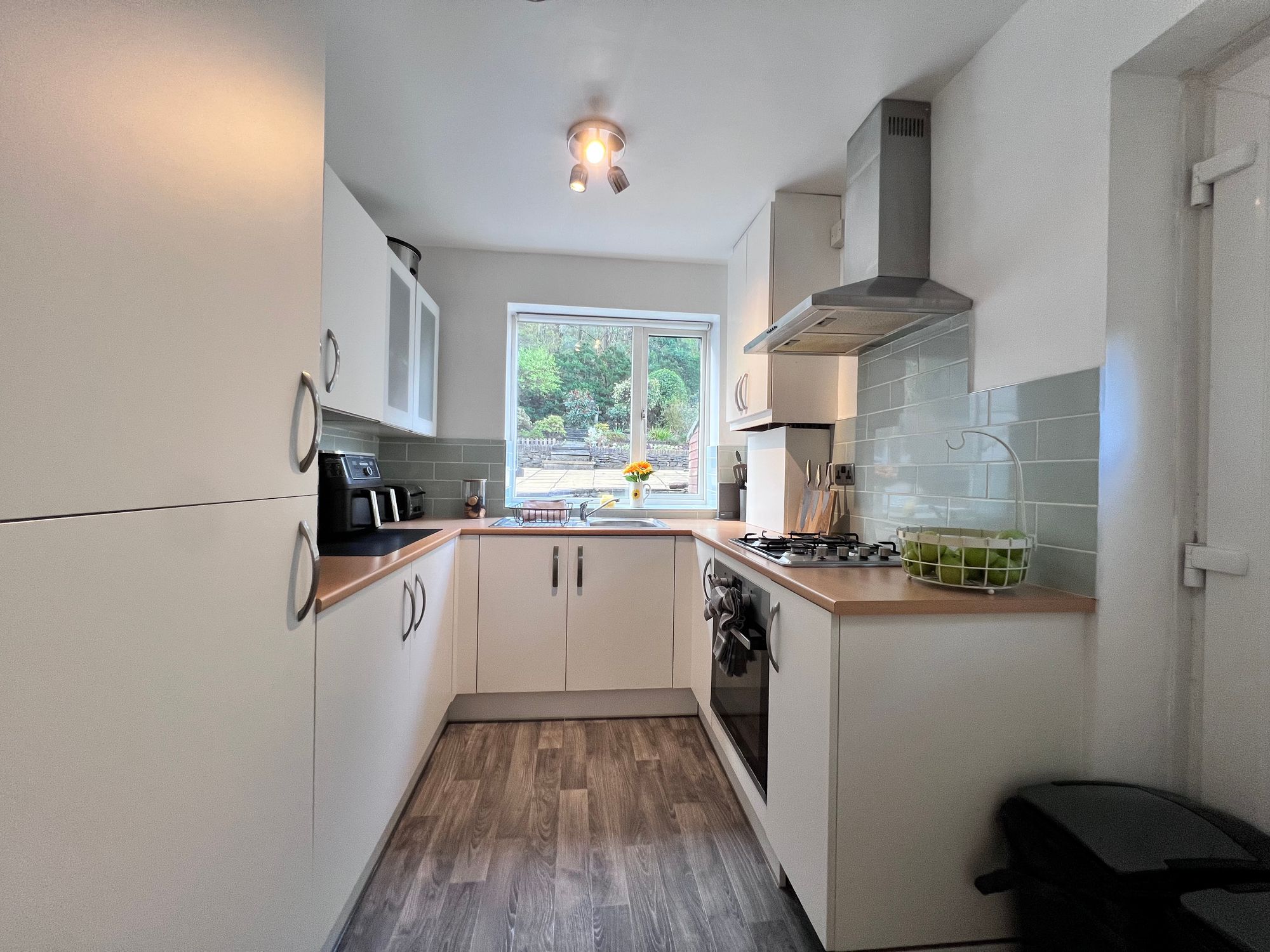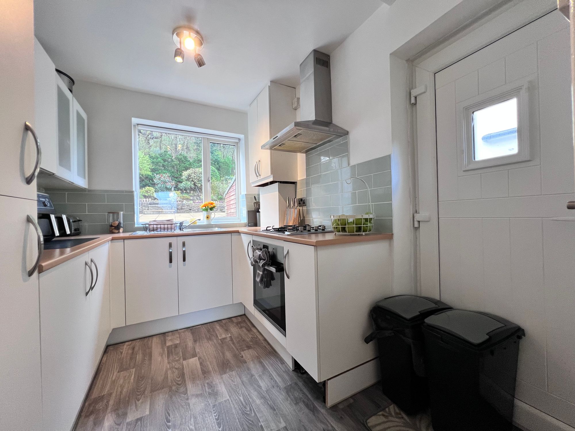 A crisp and contemporary kitchen, beautifully flooded with natural light courtesy of the large window, which perfectly frames idyllic views over the rear garden and woodland beyond, a truly uplifting outlook to enjoy every day. The space is stylishly appointed with a range of modern white wall and base units, creating a fresh, clean and inviting aesthetic. Integrated appliances include an electric oven, four-ring gas hob, fridge freezer and a stainless steel sink with mixer tap. A door leads to a useful under-stairs storage cupboard, while a further door provides convenient access to the side of the property, making this a wonderfully functional and well-designed space.