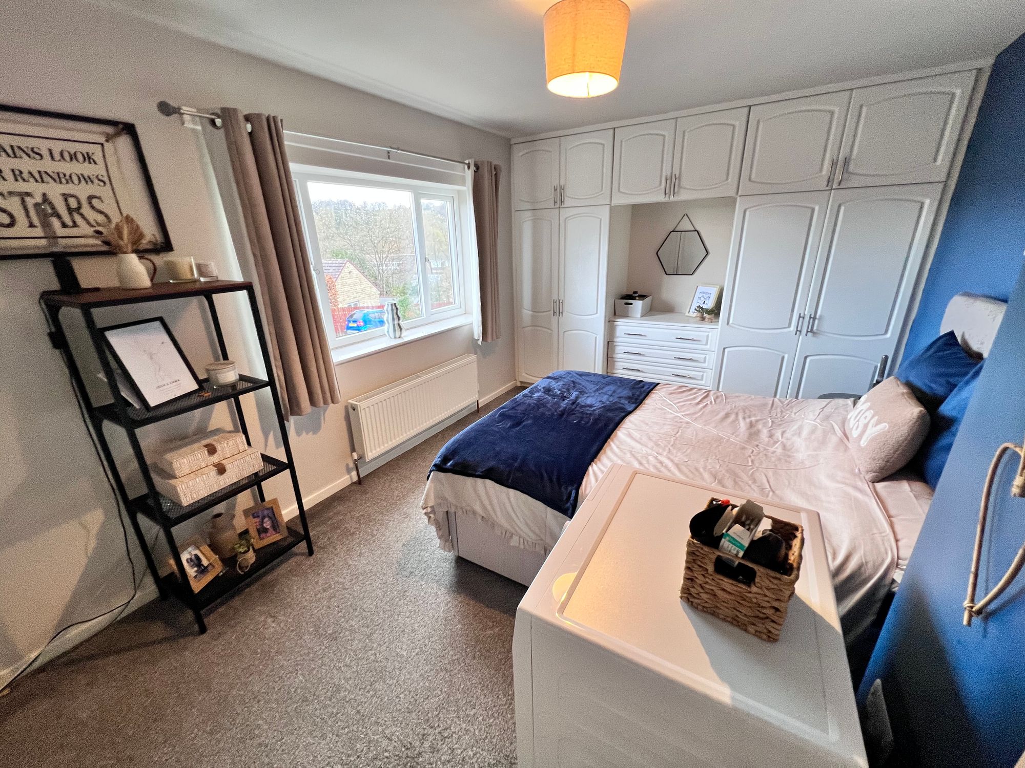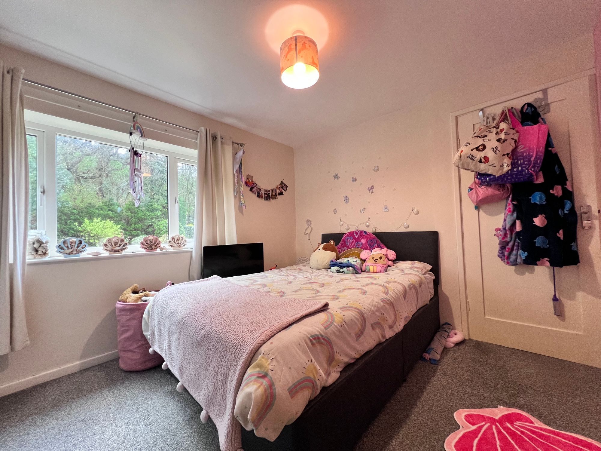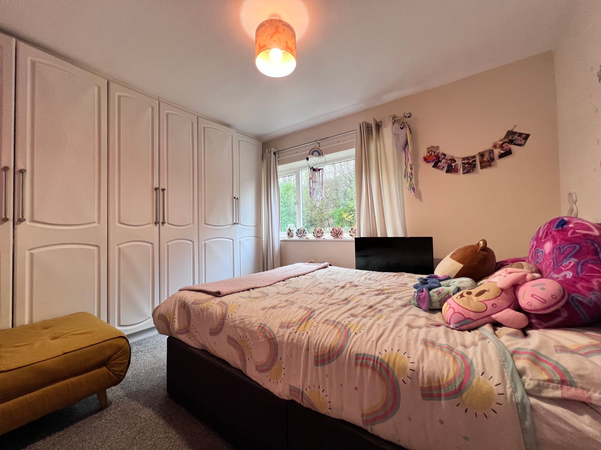 Another well-proportioned double bedroom positioned to the rear of the property, enjoying delightful views over the rear garden and woodland beyond, creating a wonderfully tranquil backdrop. The room benefits from a full bank of fitted wardrobes, providing excellent storage while maintaining a spacious and uncluttered feel.