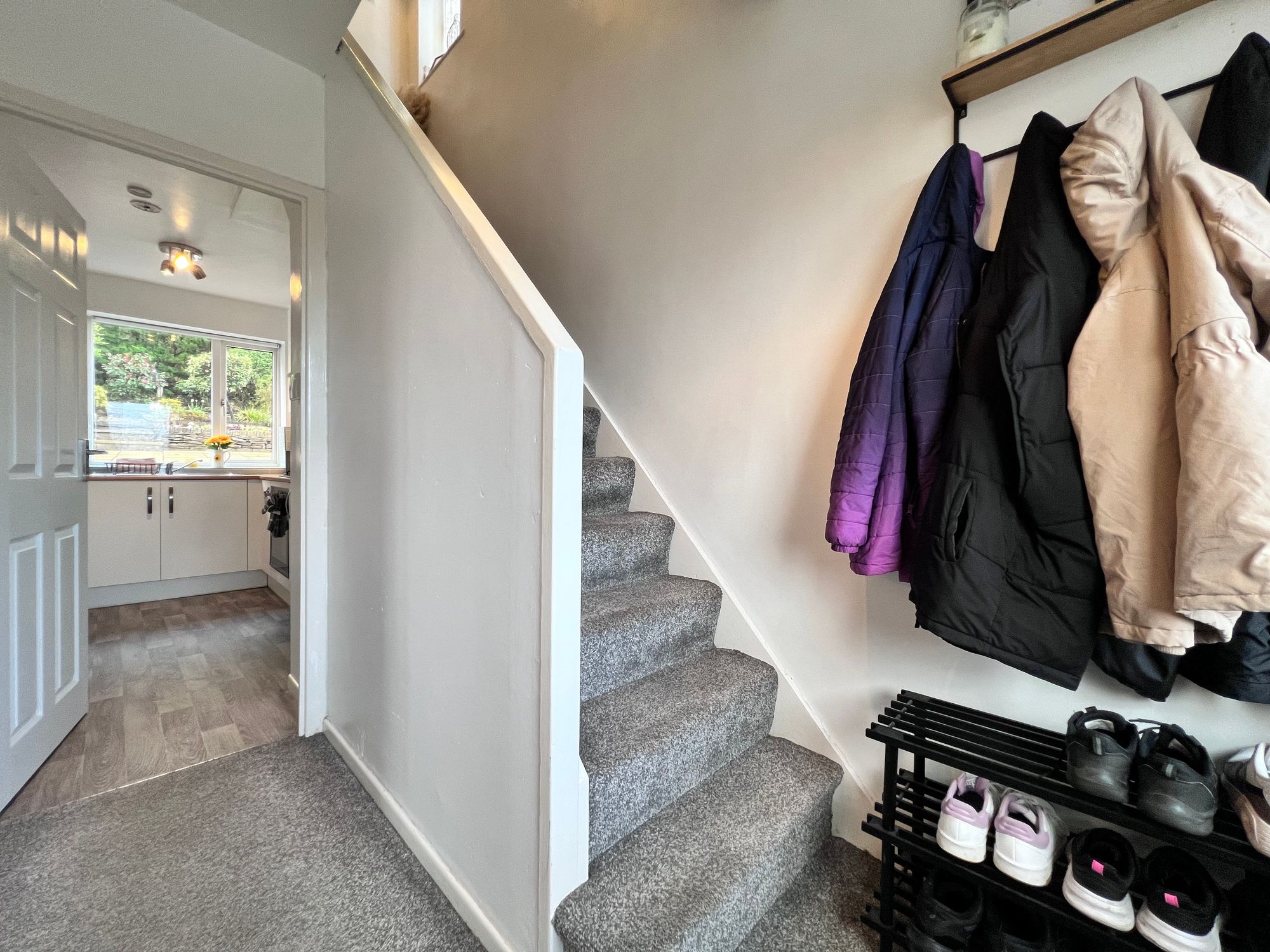 A welcoming entrance hallway offering ample space to store outdoor garments, providing a practical introduction to the home. From here, stairs rise to the first floor, while a door opens through to the kitchen and lounge, inviting you into the main living space.