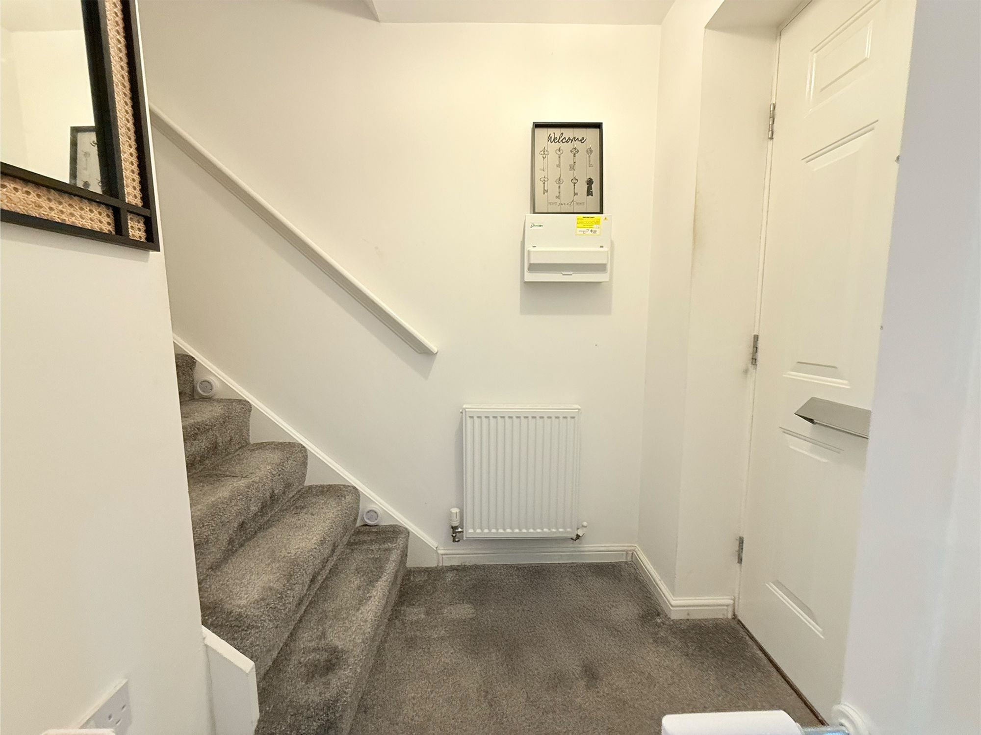 The entrance hall is a spacious and well-presented area, finished in a neutral, contemporary style typical. It offers ample space for shoe and coat storage, keeping the area practical and clutter-free while maintaining a clean, welcoming feel. From here, there is convenient access into the living room as well as the staircase leading to the upper floor, creating a well-organised and functional layout.