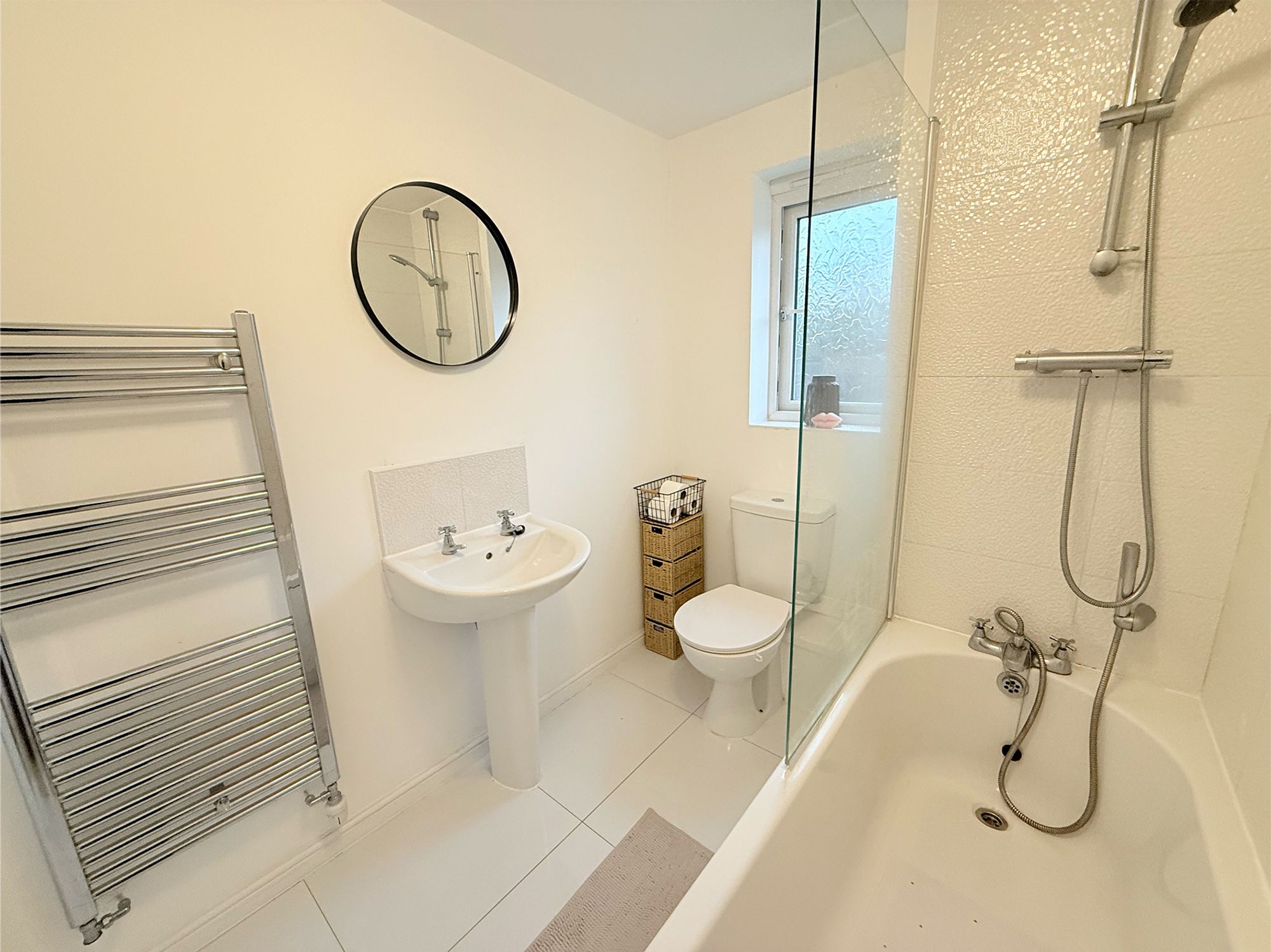 Located to the rear of the property, the bathroom is a modern and well-appointed space. It is fitted with a full-sized bath featuring a chrome mixer tap and hand-held shower attachment, along with an additional shower positioned above. The room also includes a pedestal sink, WC and a chrome heated towel rail.