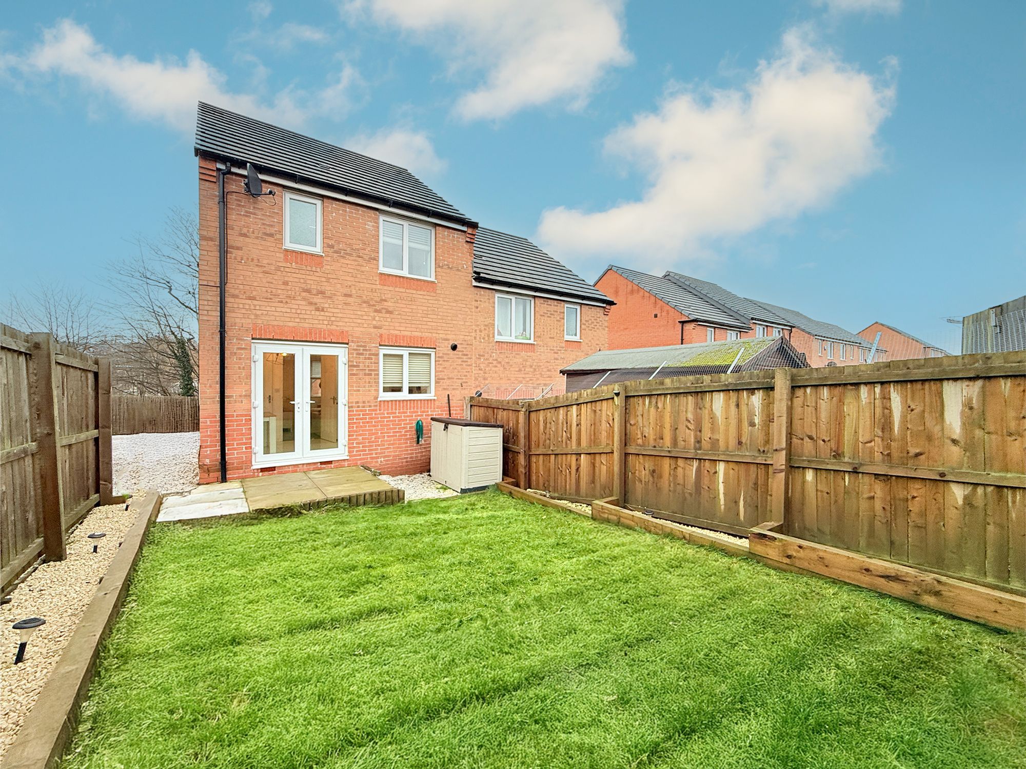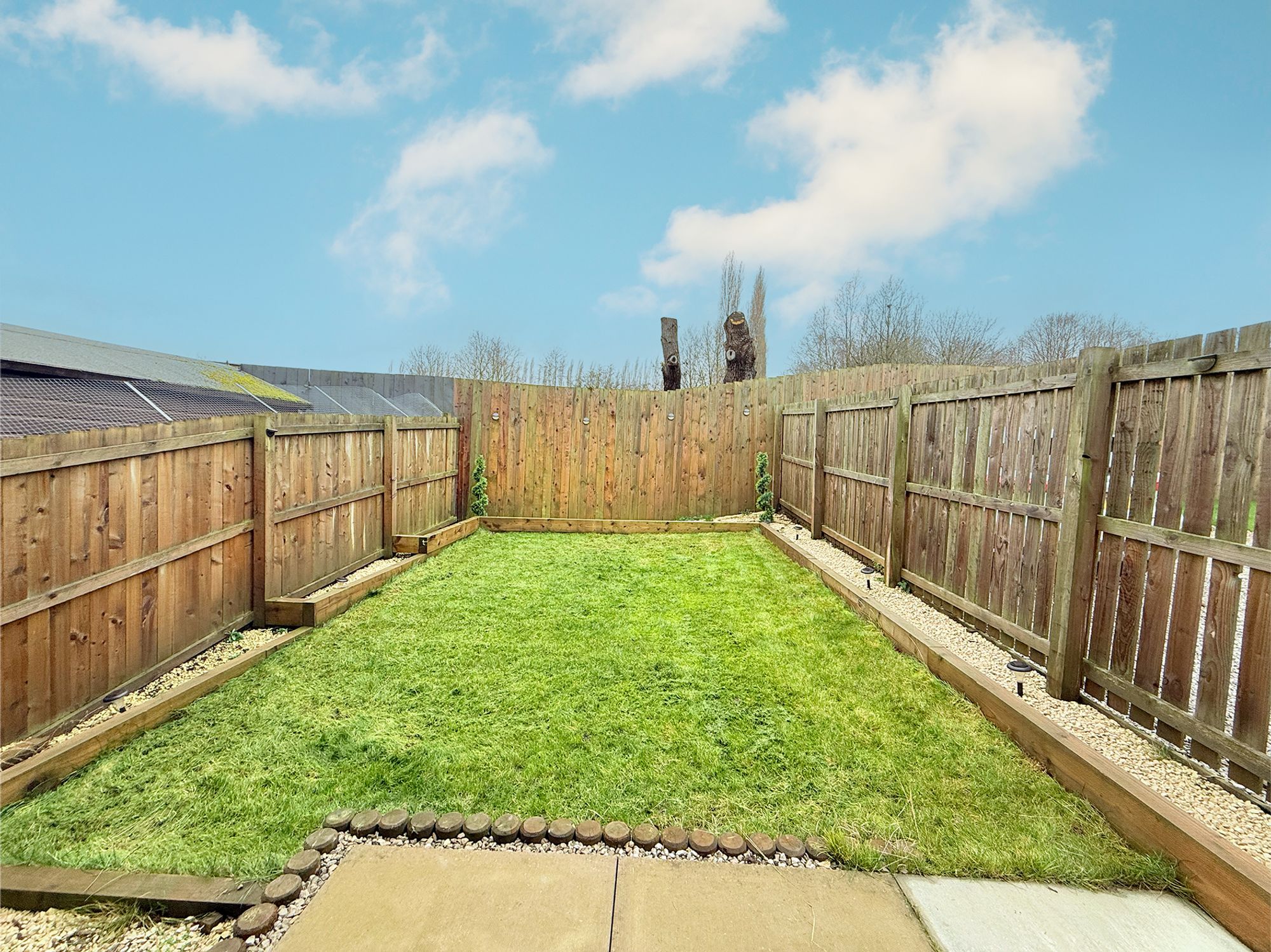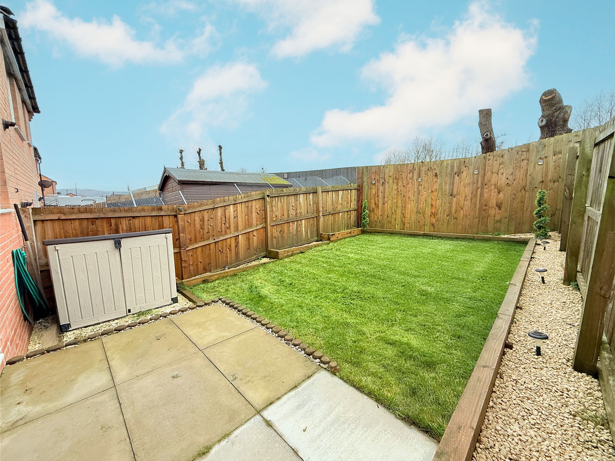 Leading from the kitchen diner is a raised stone-flagged patio, providing an excellent space for outdoor dining and entertaining. To the side, an additional pebbled area offers further room for outdoor seating, making it easy to enjoy the garden throughout the warmer months. Beyond this, a neatly manicured lawn is bordered by attractively landscaped, pebbled plant beds, creating a tidy and low-maintenance outdoor space. The garden is enclosed by privacy fencing and offers the option to add a gate from the driveway, allowing the garden to be made fully enclosed if desired.