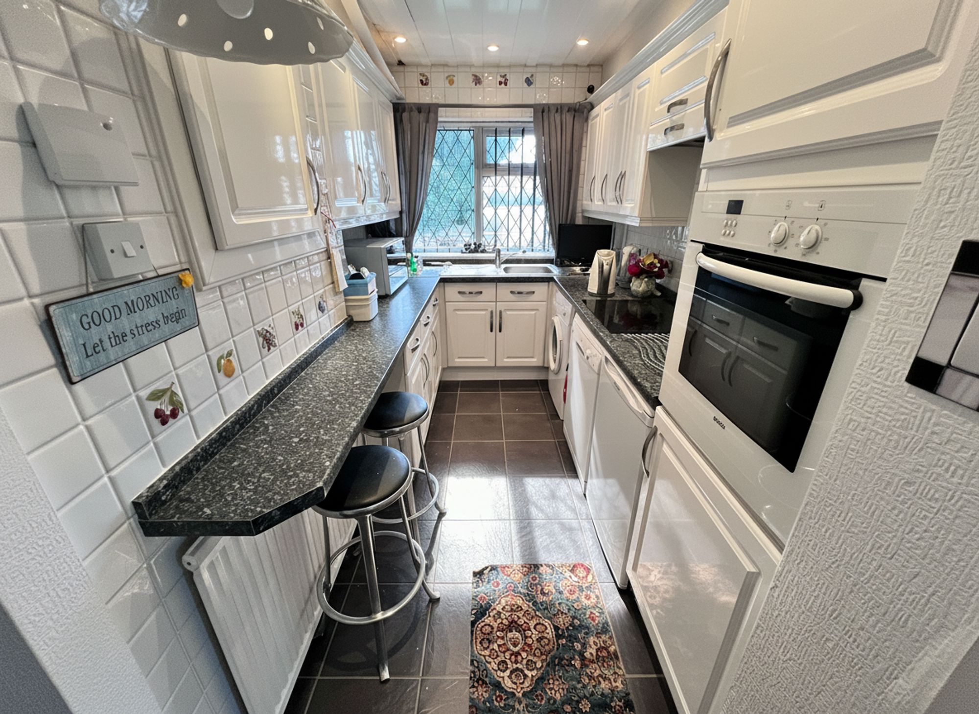 The kitchen is fitted with a range of white units complemented by contrasting work surfaces, offering practicality. A selection of integrated appliances includes an electric oven and induction hob, with additional space for a freestanding fridge and dishwasher. Finished with a stainless steel sink and mixer tap positioned beneath a window enjoying pleasant views over the front garden.