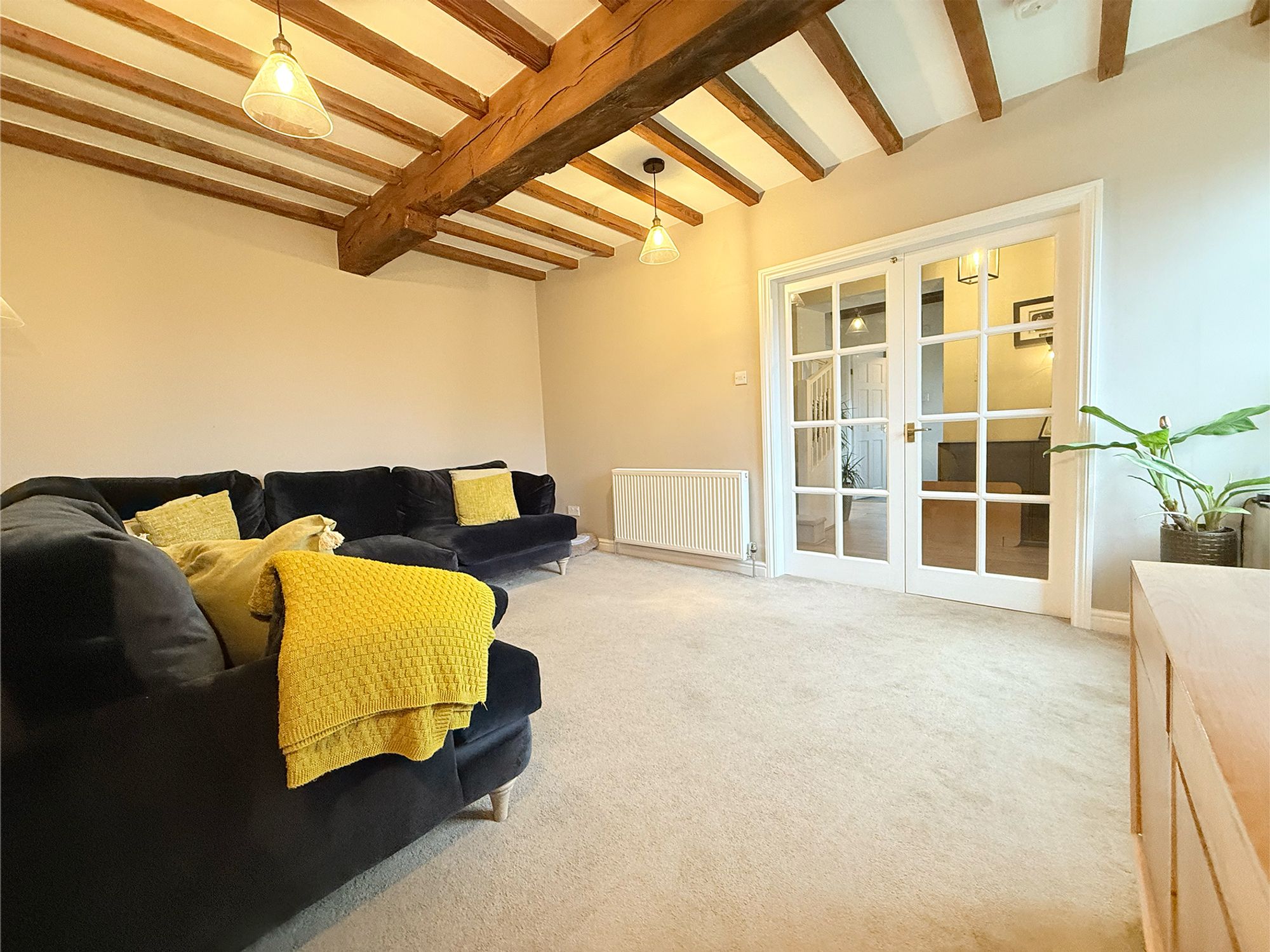 Positioned to the front of the property, this generously proportioned living room enjoys pleasant views over the front garden and is beautifully finished in soft, neutral tones with plush carpeting throughout. The space comfortably accommodates a variety of family seating arrangements, making it ideal for both everyday living and entertaining. Elegant glazed double doors connect the room to the entrance hall, creating a sociable, open-flow layout perfectly suited to modern family life. A striking full ceiling of exposed beams adds a wealth of character and warmth, elevating the room with a sense of timeless charm.