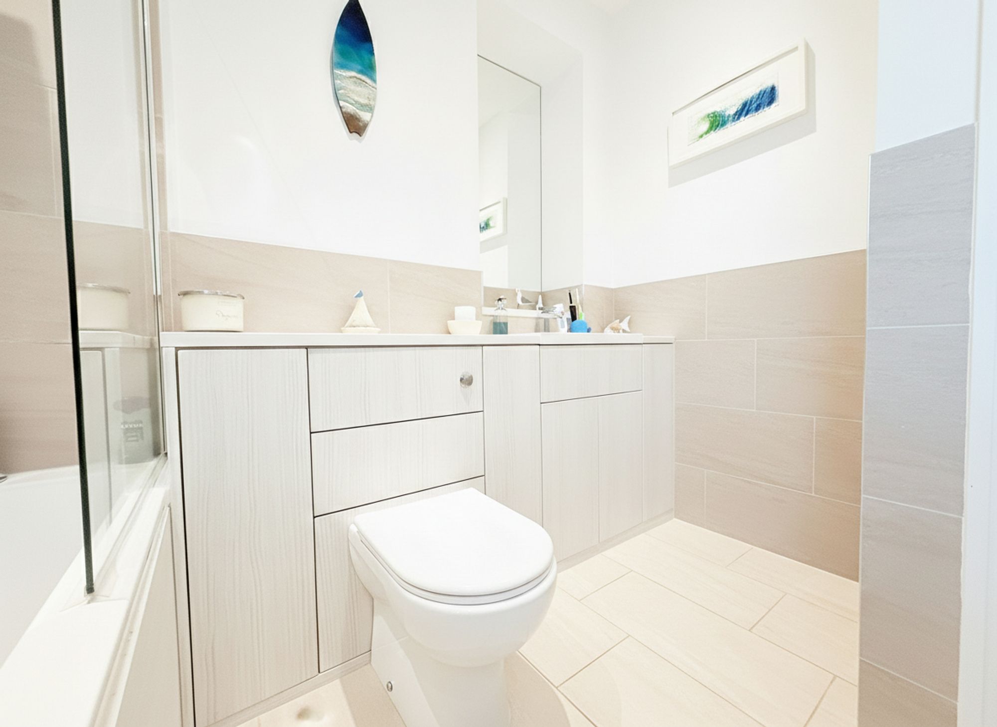 A sleek and contemporary family bathroom, elegantly finished with neutral tiling to both the walls and floor for a clean, timeless aesthetic. The room is fitted with a full-sized bath featuring a chrome mixer tap and an overhead shower, complete with both a handheld attachment and a luxurious rainfall shower head. A modern WC and a stylish built-in vanity unit with integrated storage provide practicality, while white granite worktops add a refined, high-end finish. The space is completed by a chrome heated towel rail and electric underfloor heating, enhancing both comfort and style.