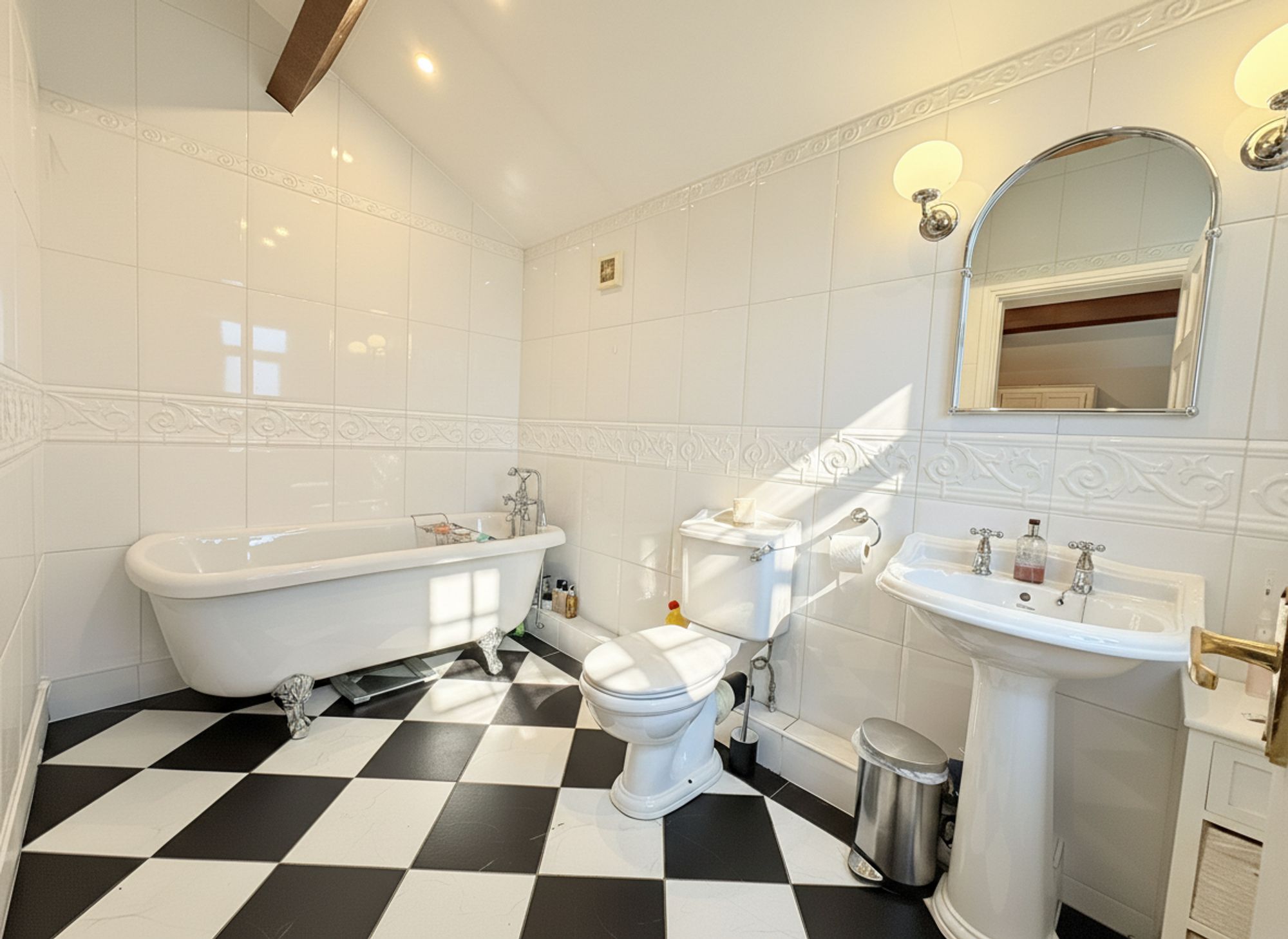 A beautifully appointed private en-suite, finished in crisp white tiling with striking mid-height detailing and complemented by contrasting patterned floor tiles. The space is enhanced by high ceilings and exposed beam features, adding both character and a sense of luxury. Fitted with an elegant freestanding bath complete with chrome taps and a handheld shower attachment, alongside a classic pedestal wash basin with chrome taps and a WC. Decorative wall lighting provides a soft, ambient glow, creating a refined and tranquil space ideal for relaxation.
