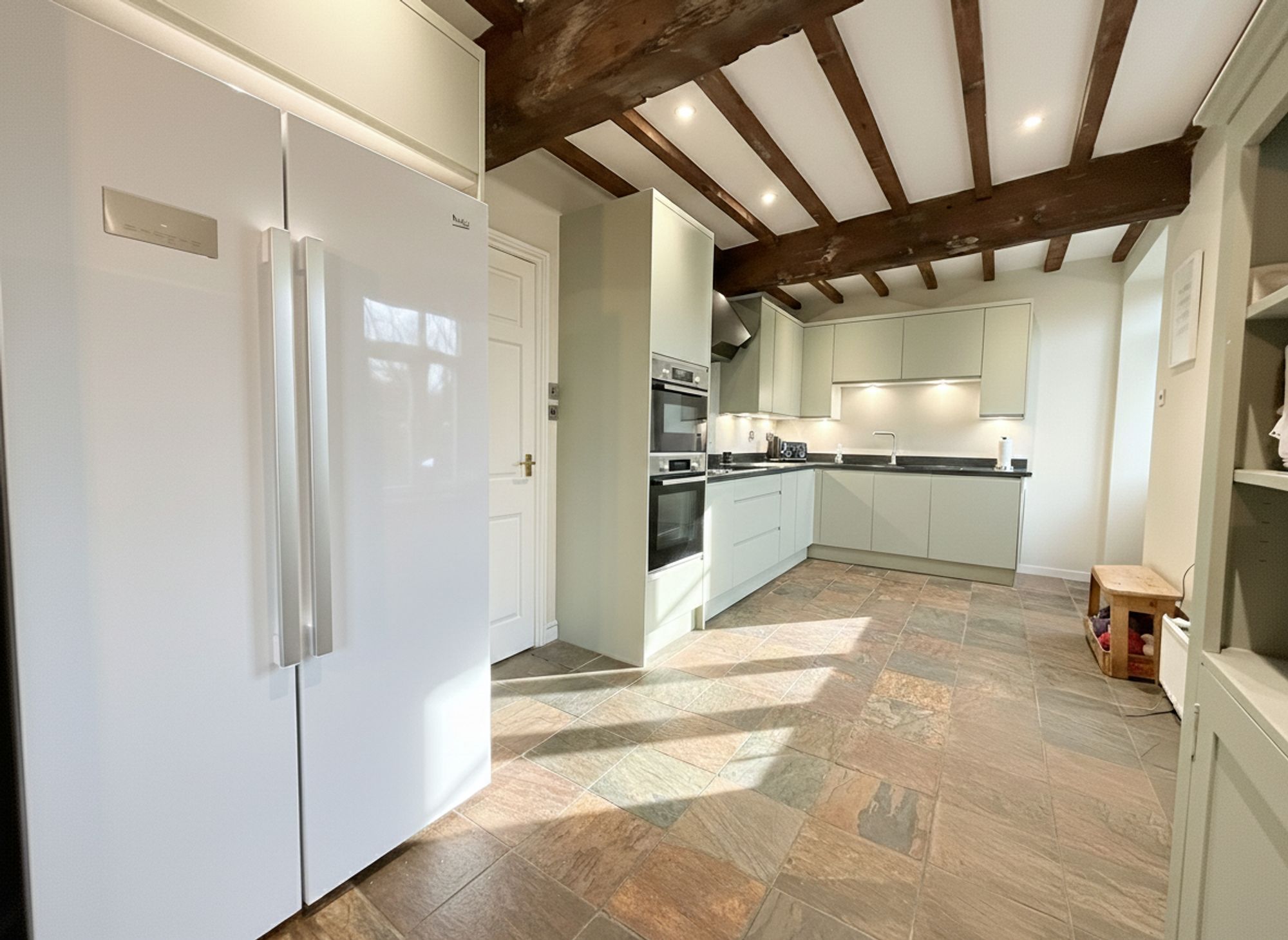 A striking, light-filled entrance hall that sets an immediate tone of the home. Wonderfully spacious and airy, the hall is finished in a refined neutral palette and complemented by elegant wood-effect laminated flooring. Generous proportions allow for a variety of freestanding furniture pieces, with further practicality provided by a discreet under-stairs storage cupboard. Architectural interest is added by a full ceiling of exposed beams, creating a warm yet sophisticated first impression. The hall offers seamless access to the study/bedroom four, WC/utility room, living room, and the dining kitchen, making it both a functional and impressive central hub of the home.