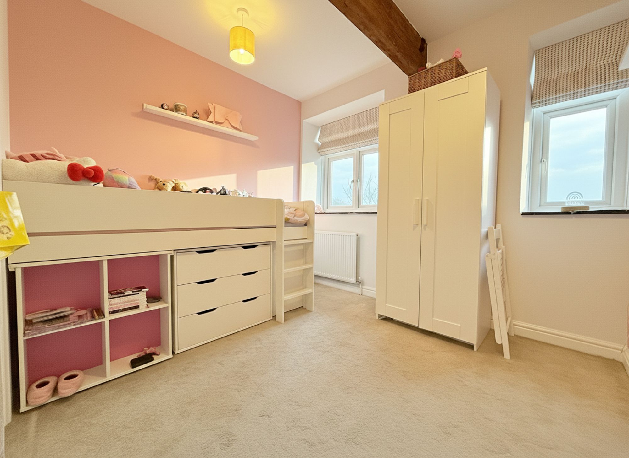 A highly versatile and beautifully presented room, currently utilised as a playroom, yet offering excellent potential as a home office, hobby room, or fourth bedroom. The space is neutrally decorated and finished with plush carpeting, creating a warm and comfortable atmosphere. Generous proportions allow for a single bed and freestanding furniture, while the room is equally well suited to those working from home, providing a bright and airy environment. A standout feature is the stunning, far-reaching views across the surrounding fields, offering an inspiring and tranquil outlook that enhances both work and relaxation.