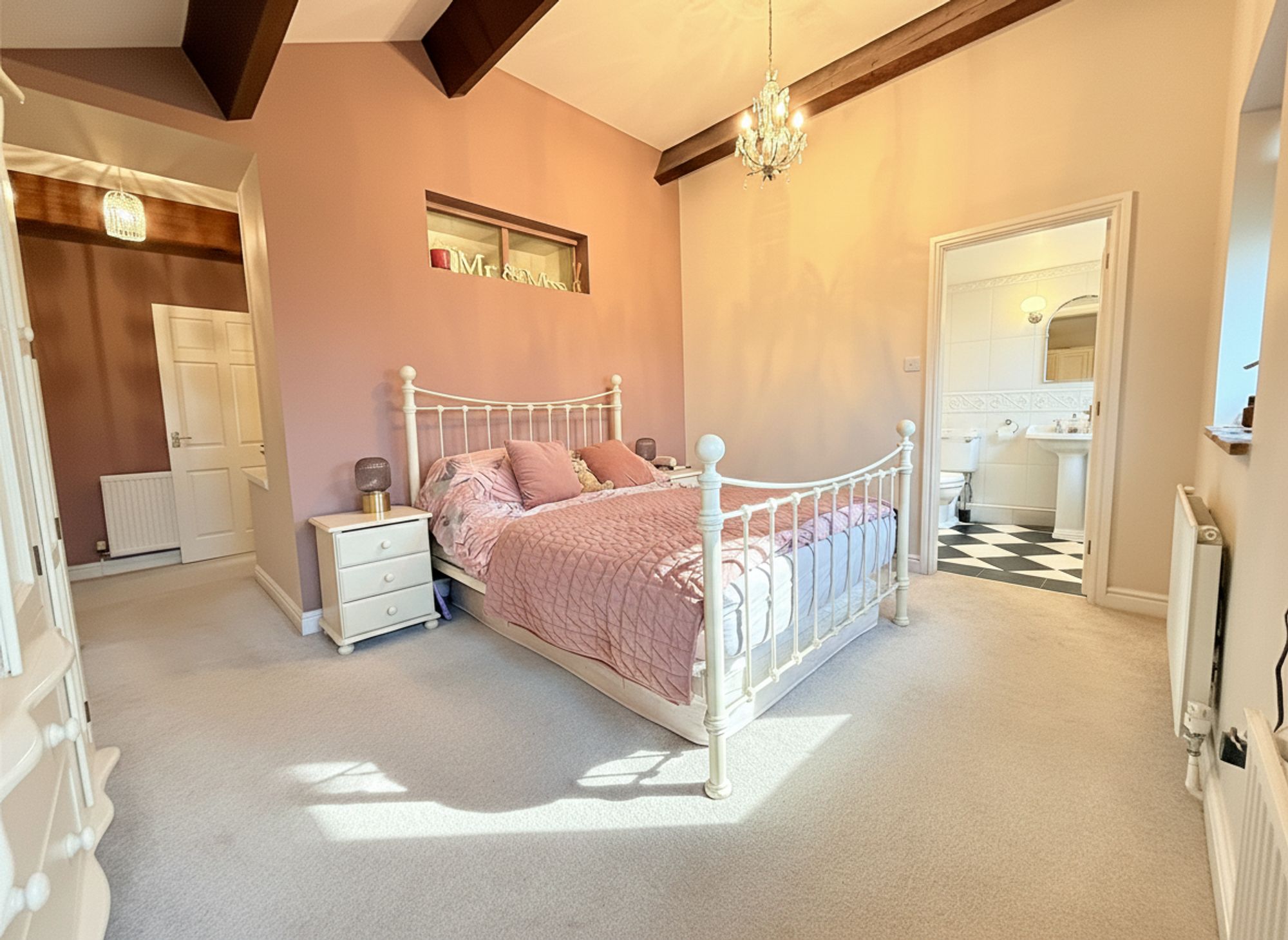 Step into a spacious and luxurious principal suite, beautifully designed to offer both comfort and elegance. Dual-aspect windows flood the room with natural light and frame stunning, views across the surrounding fields. The generous proportions easily accommodate a super king-size bed along with additional freestanding furniture. A dedicated dressing area features built-in wardrobes, complemented by a bulkhead that offers further potential for bespoke built-in storage. High ceilings and exposed wooden beam detailing enhance the sense of space and character, while an exposed stone windowsill adds a charming period touch. This thoughtfully executed extension, completed in 2004, has been meticulously designed to seamlessly reflect the original character and architectural features of the home, creating a refined yet characterful retreat.