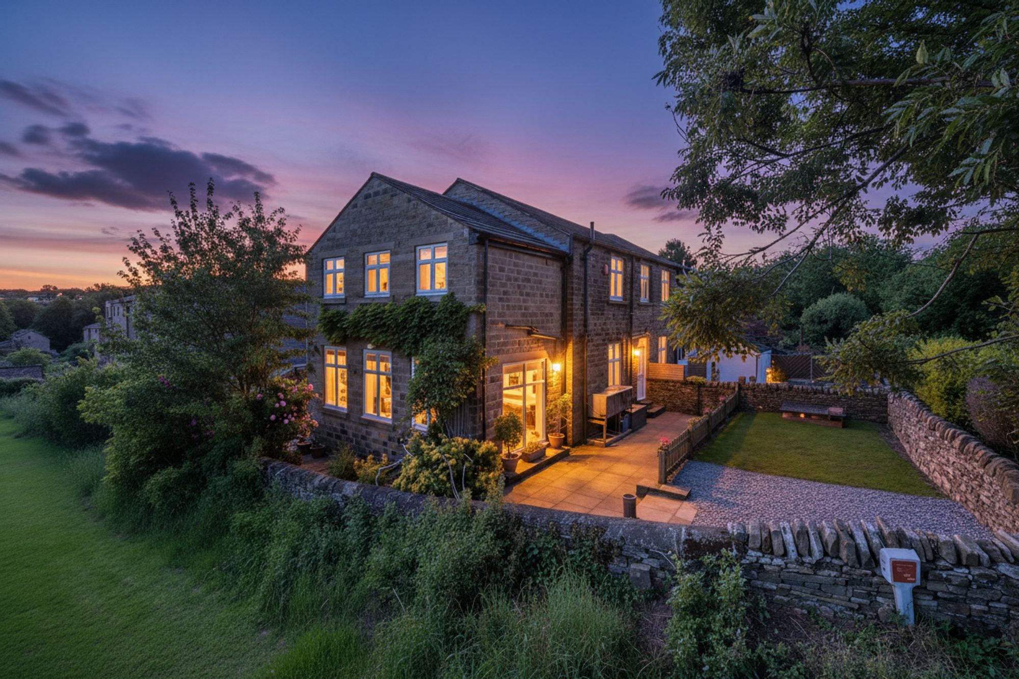 Accessed directly from the kitchen, the rear garden has been thoughtfully designed to maximise both enjoyment and the stunning setting. A stone-flagged patio spans the full width of the garden, creating an ideal space for outdoor entertaining, socialising, and alfresco dining throughout the warmer months. Stone steps lead up to a raised, lawned area with an additional slate-chipped patio, forming an elevated dining and seating spot perfectly positioned to take in the far-reaching views across the surrounding fields. The garden also benefits from a convenient side passage, accessed via a wooden gate, providing practical access around the property. Along the side of the house is a further stone-flagged area housing an outdoor storage unit, a designated bin storage area, an external water tap, and outdoor electrical points, adding to the functionality of this well-considered and highly attractive outdoor space.