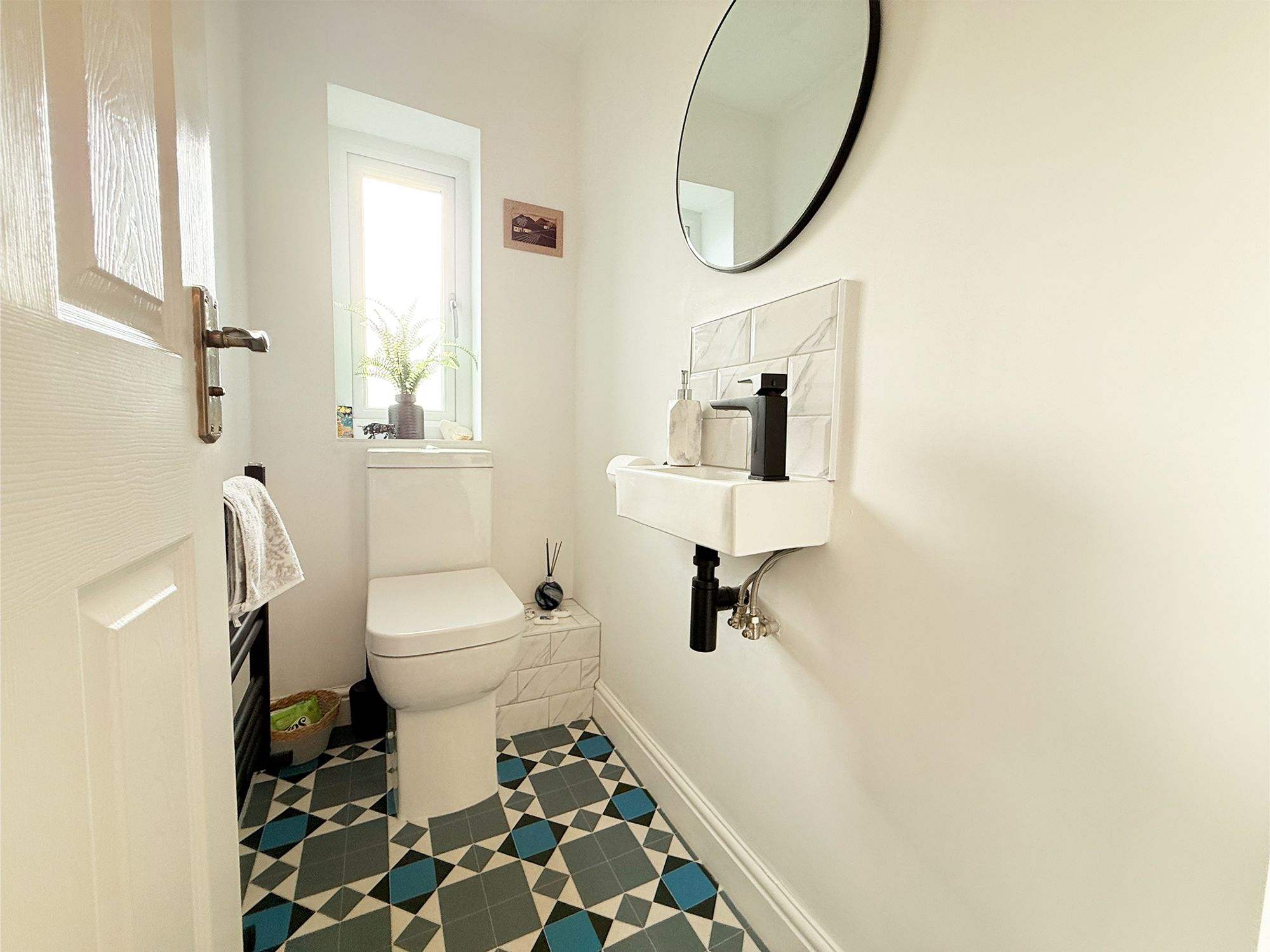 A stylish and modern cloakroom fitted with a contemporary WC and vanity sink unit featuring a matte black mixer tap, complemented by a matching heated towel rail. Finished in soft, neutral tones with the same striking patterned linoleum flooring as the entrance hall, this space offers a cohesive and elegant design.