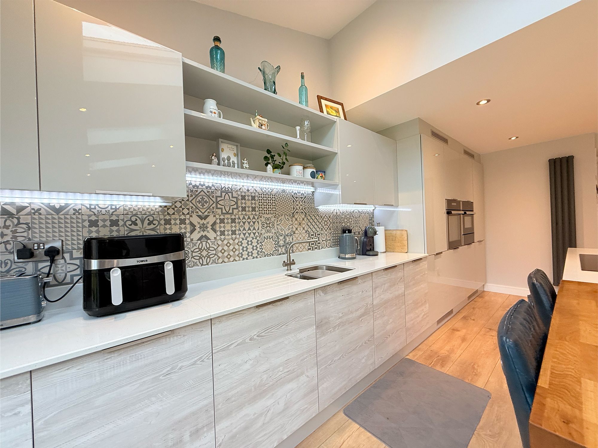 An impressive open plan dining kitchen forms the true heart of the home. Renovated in 2020, the space features a striking contemporary design with a mix of grey and wood-effect cabinetry, complemented by elegant granite worktops and patterned splashback tiles. Under-cabinet LED lighting and wood-effect laminate flooring add warmth and sophistication. The kitchen is equipped with a range of integrated appliances, including a microwave, oven, dishwasher, and full-sized fridge. The sink is neatly set into the worktop with built-in draining and a chrome mixer tap. At the centre of the room sits a spacious LED-lit kitchen island with an integrated five-ring induction hob, pop-up extractor fan, concealed power sockets, and deep pan drawers offering generous storage. The island flows seamlessly into a wooden breakfast bar, creating a perfect space for casual dining and entertaining. A handy storage cupboard adds further practicality to this stunning and well-planned space.