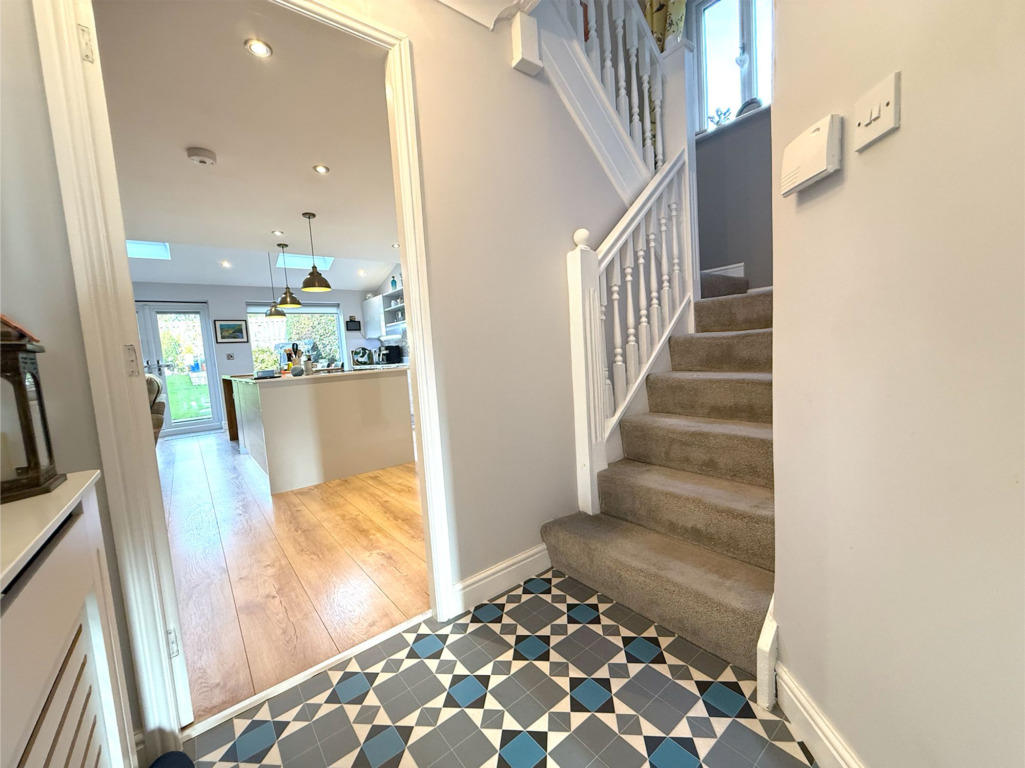 A spacious and welcoming entrance hall offering ample space for coats and shoe storage. Decorated in soft, neutral tones and finished with striking patterned linoleum mosaic flooring, this area creates an inviting first impression. The hallway provides access to the ground-floor WC, integral garage, lounge, dining kitchen, and staircase leading to the upper floor.